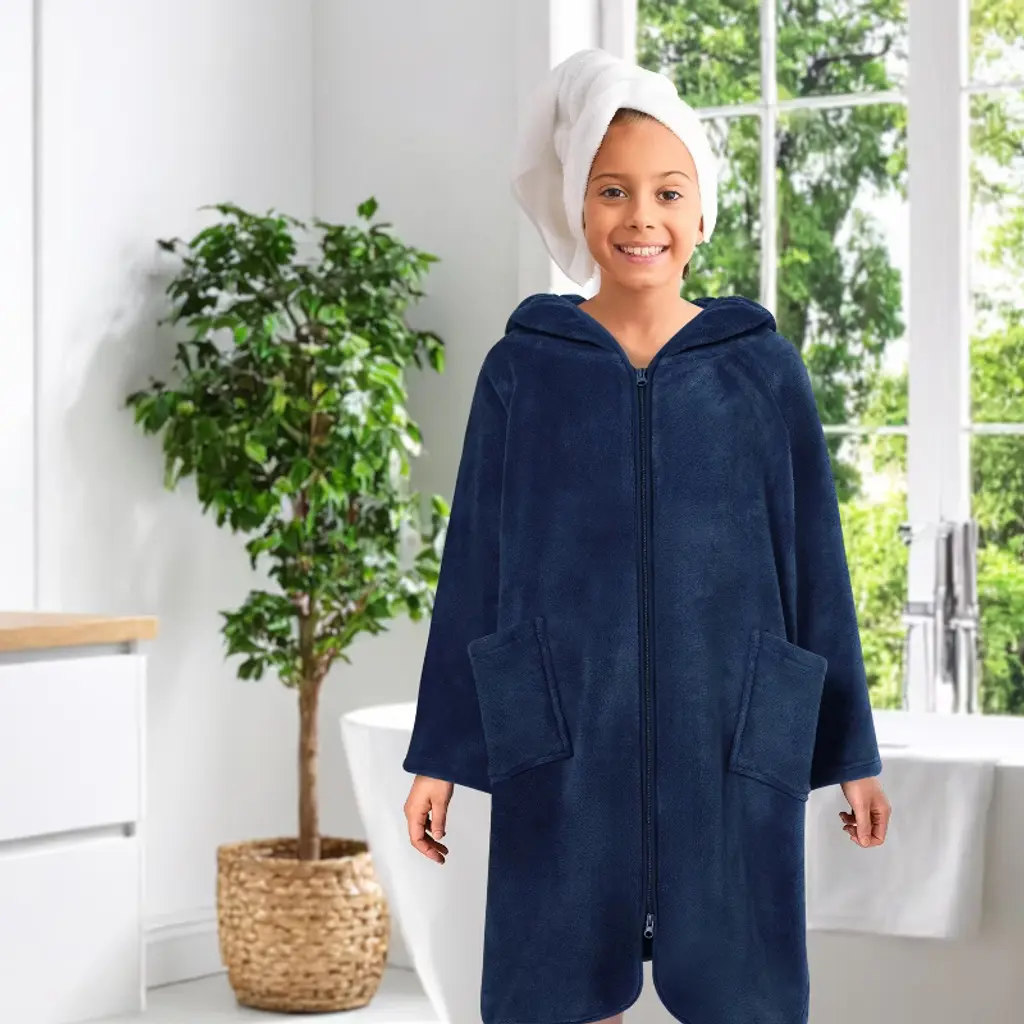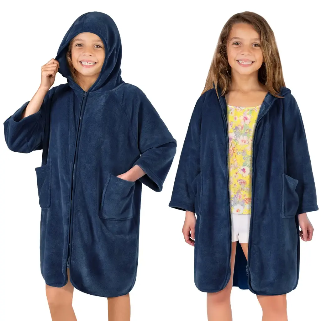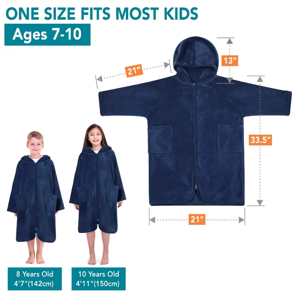 Sun Cube Fleece Zipper Hooded Towel Robe For Kids, Zip Up Swim Beach Cover Up, Bath Surf Changing Girls Boys 7-10 Years (Navy Blue, Big Kid (7-10))