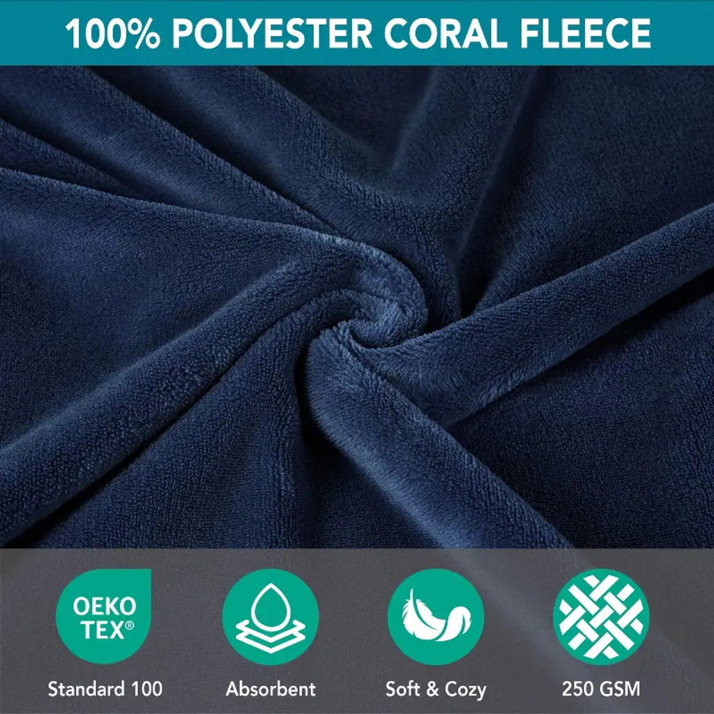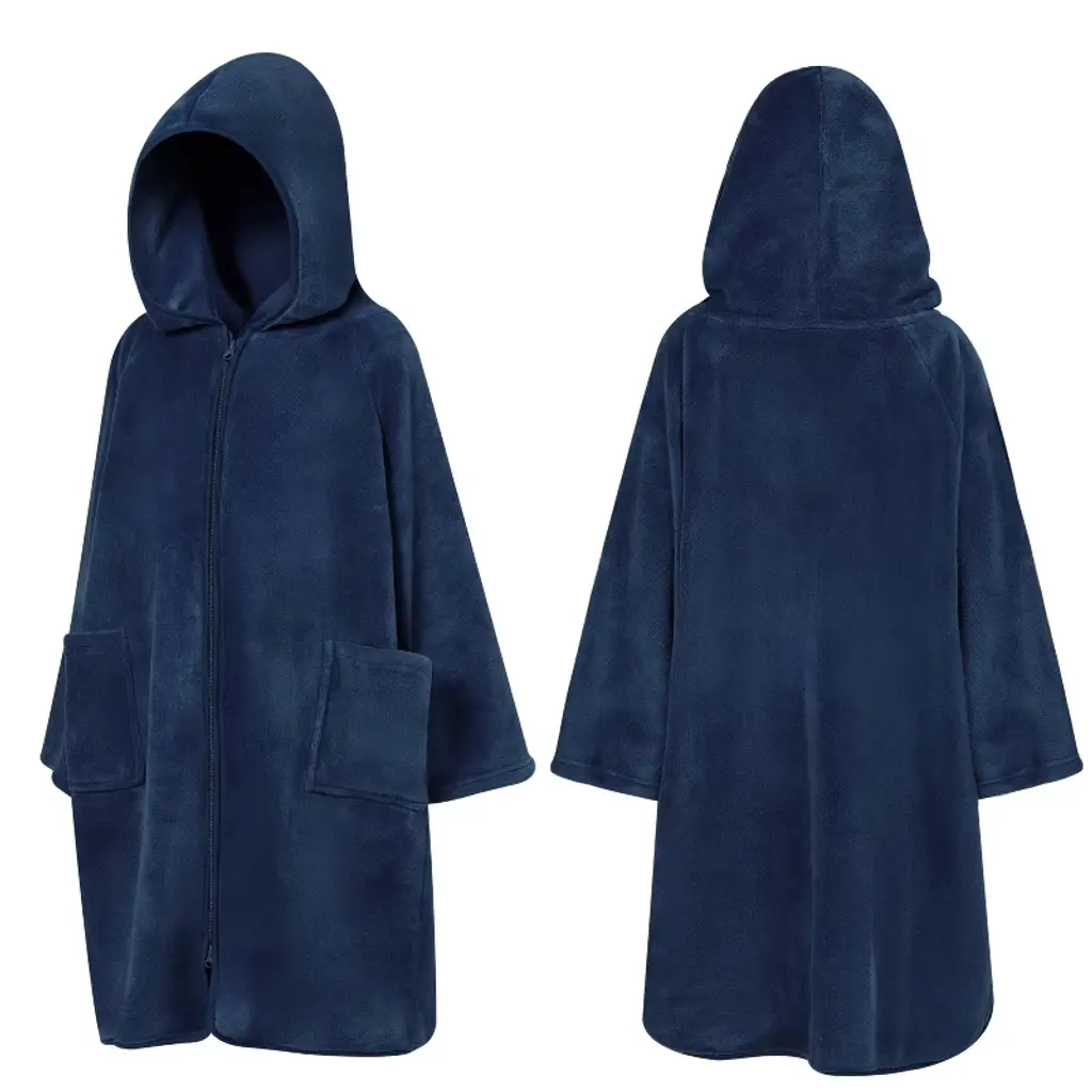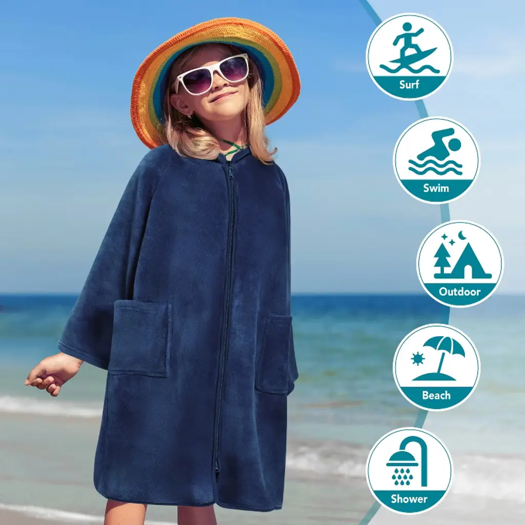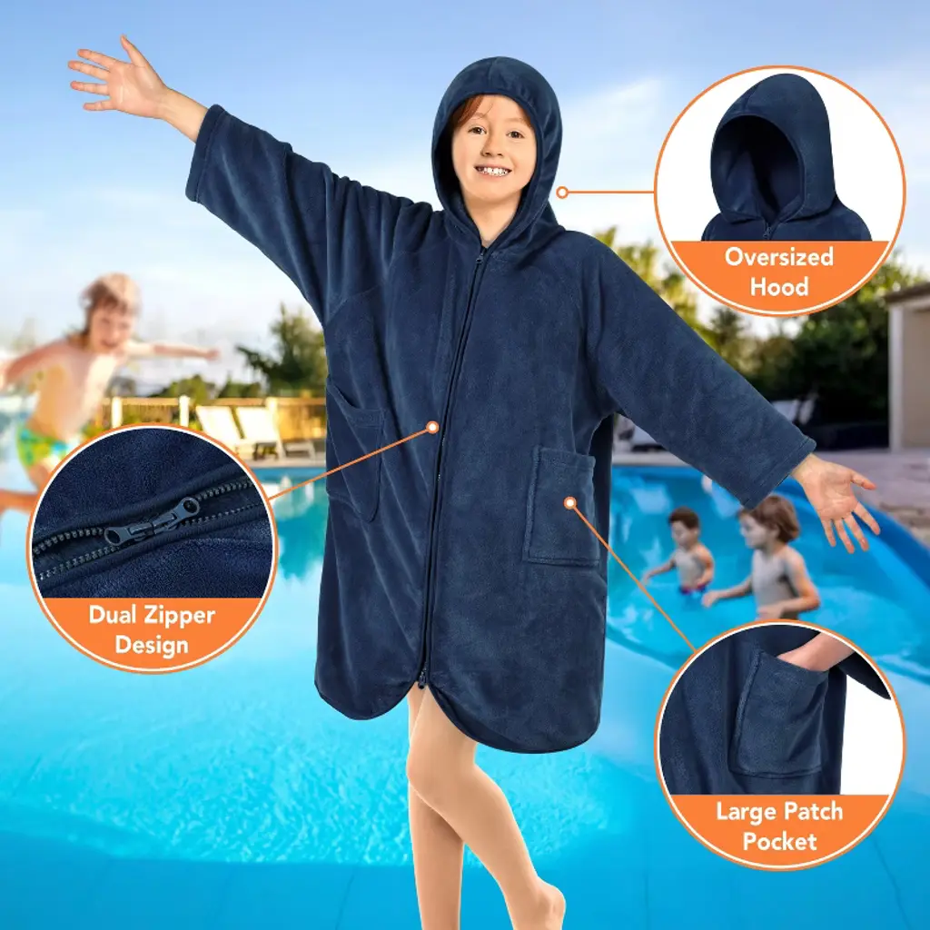 Sun Cube Fleece Zipper Hooded Towel Robe For Kids, Zip Up Swim Beach Cover Up, Bath Surf Changing Girls Boys 7-10 Years (Navy Blue, Big Kid (7-10))