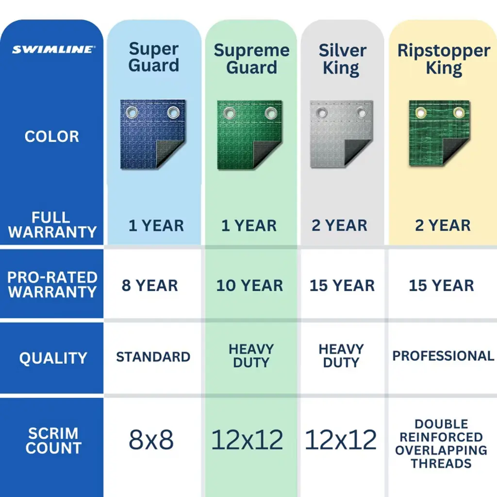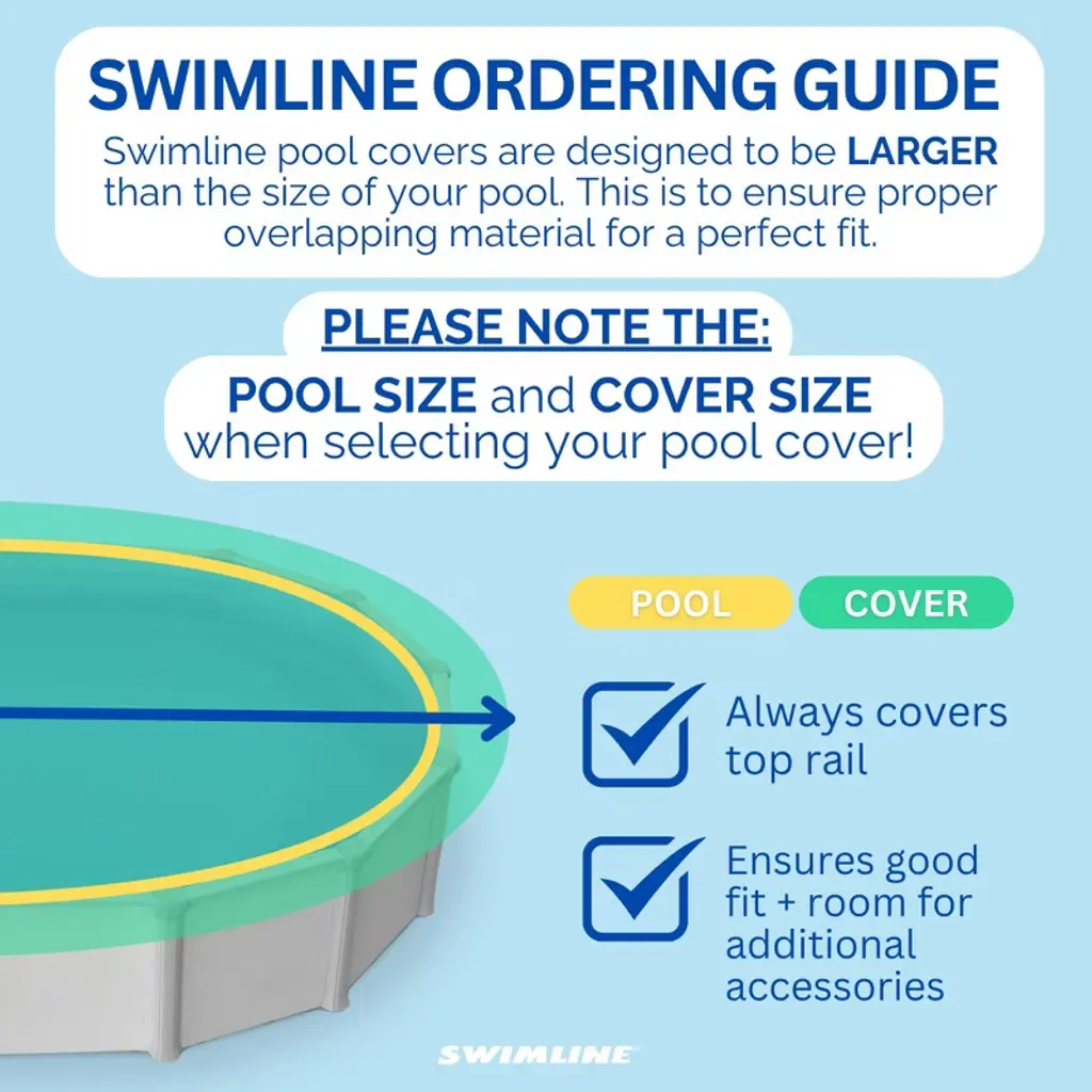 Introducing the SWIMLINE HYDROTOOLS Heavy Duty Pool Covers, your ultimate solution for preserving the quality and longevity of your above-ground swimming pool through the winter season. Designed with the highest standards, our pool covers effectively keep out snow, ice, and debris, ensuring your pool remains in pristine condition, ready for the next swim season. Every Hydrotools cover is engineered from our unique woven fabric material. This features a solid tight weave that guarantees no water or debris will pass through, ensuring optimum protection during winter's harshest months. To combat environmental factors, the covers are UV and chemical resistant, adding to their durability and lifespan. Installation is as easy as can be. Each cover comes equipped with perimeter attachment grommets, and a lightweight yet robust design. This means you have everything you need for a hassle-free installation right out of the box. Once installed, the cover should naturally float loosely on the water, fitting securely around your pool without any overstress. Moreover, our pool covers are not standalone solutions but part of a wider protective system within the Hydrotools by Swimline expansive assortment of pool accessories. They pair seamlessly with our extensive range of winterizing accessories such as ice equalizer air pillows, water tubes, and wall bags. With the integrated perimeter grommets, you can use these accessories for additional support and peace of mind. At Swimline, we take pride in the quality and variety of our cover options, designed to fit all sizes and strengths of pools. Our dedication to excellence is rooted in our USA headquarters in New York, where each product is thoughtfully designed to meet your needs. Rest assured, we stand by our products, offering a one-year warranty against any manufacturing defects. This is our Swimline promise to you......