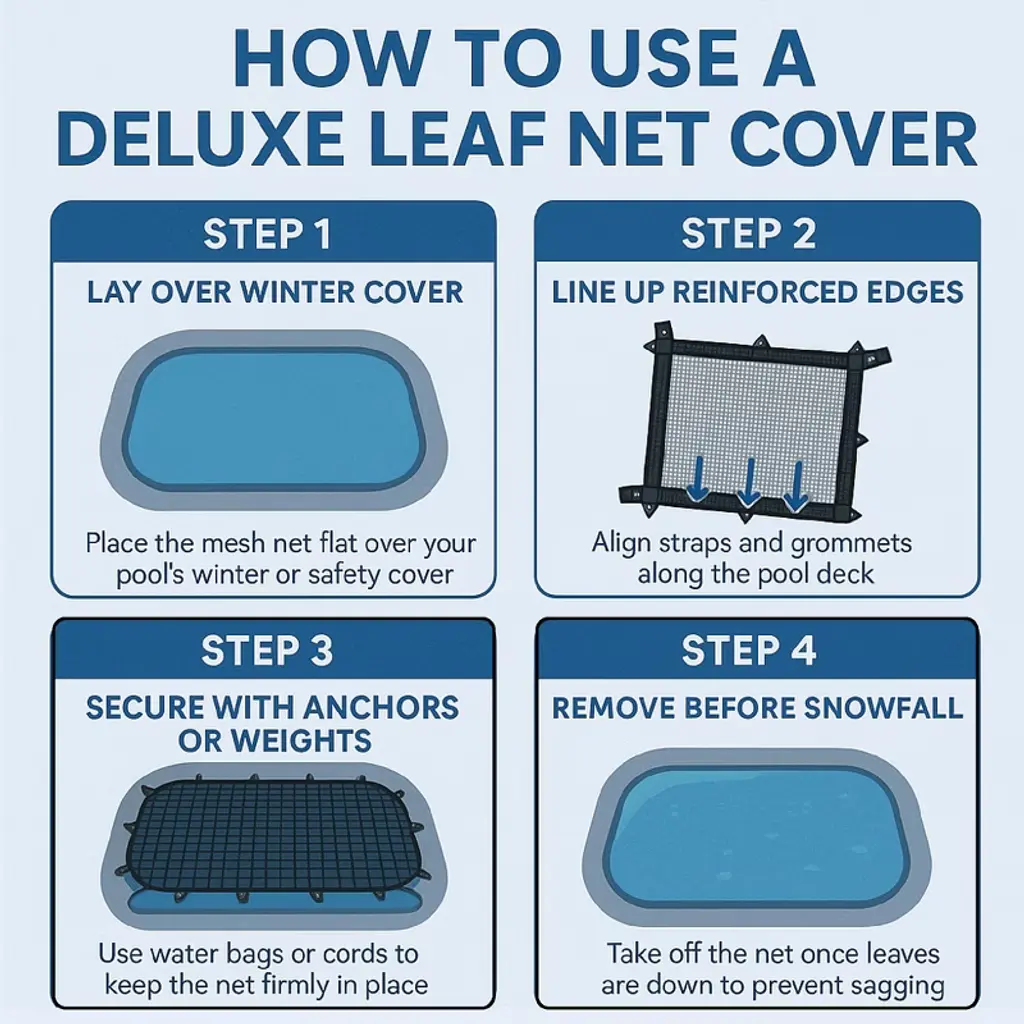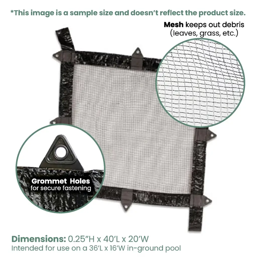 The easy solution for winter cover clean-ups! Help prevent leaves from sneaking under your winter pool cover with this leaf net. Simply lay net over the winter cover before the leaves fall and remove once trees are bare. Product Features: Black swimming pool closing leaf net cover Intended for use on a 16' x 36' inground pool Prevents dirt and debris accumulating in the pool Recommended for outdoor use Easy to use Dimensions: 20' wide x 40' long Material(s): polyethylene