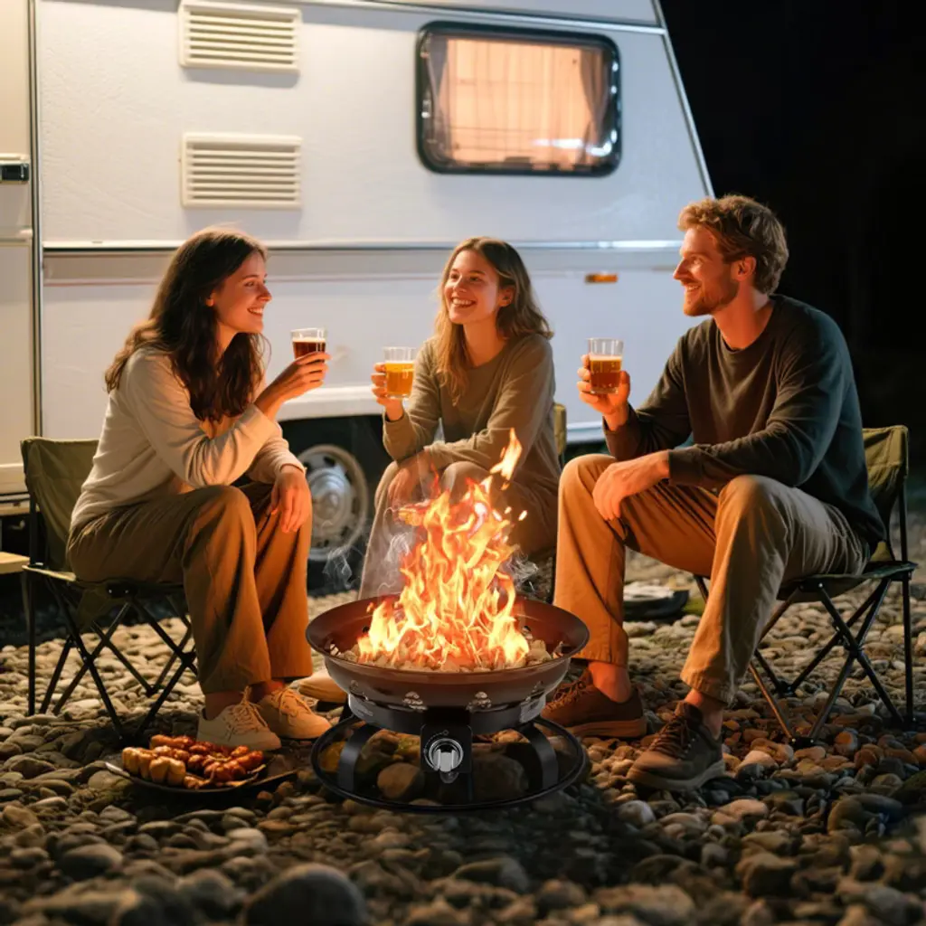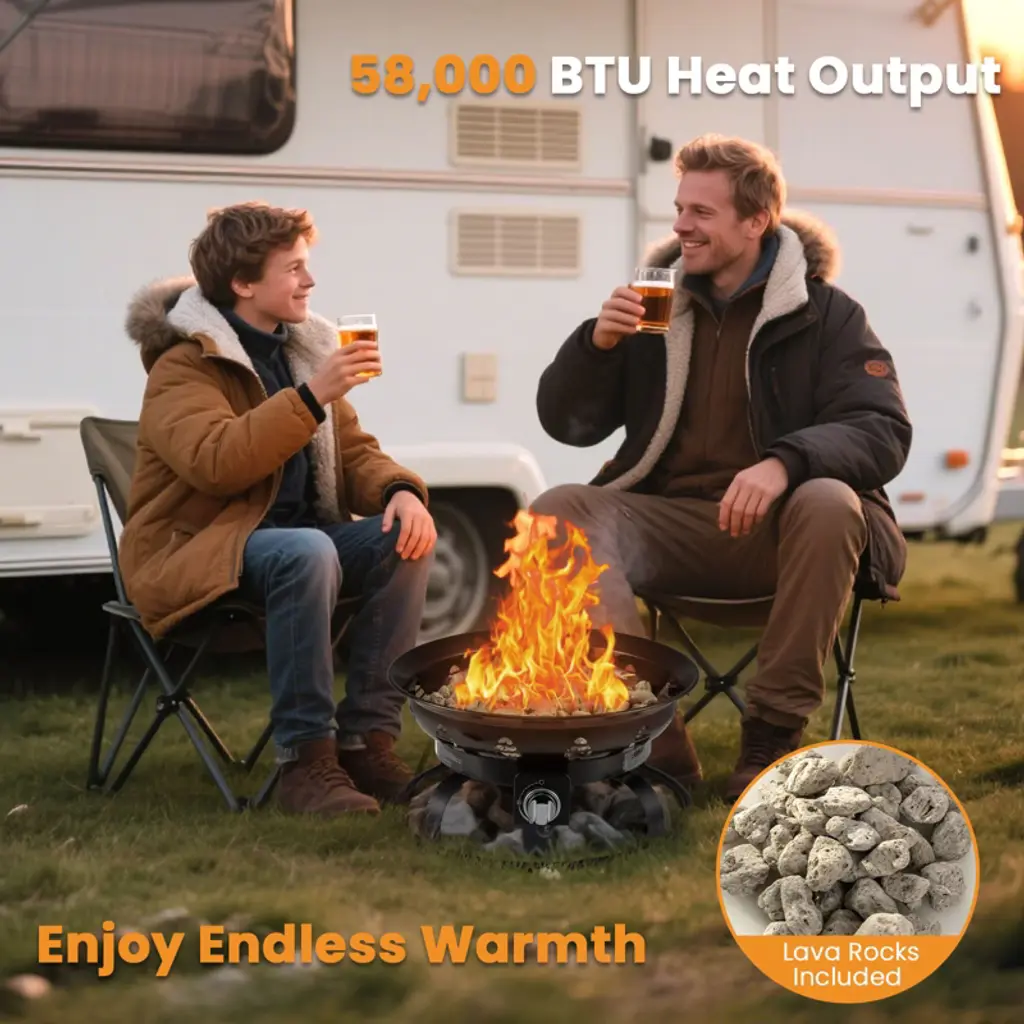 Enjoy ultimate warmth outdoors with this 21" portable propane fire pit. This fire pit eliminates the need for wood or coal, providing a clean, ash-free heat source. The lightweight and compact design allow for easy transport, so you can bring comfort to any outdoor setting. Capable of a potent 58,000 BTU output and enhanced with lava rocks, the firepit heater ensures a cozy and warm atmosphere at the beach, patio, or campsite. The ignition is simple and safe with a knob for quick lighting and flame adjustment. Constructed from premium cold-rolled steel with a 201 stainless steel burner, the fire bowl is built to last. Perfect for your next outdoor gathering, this propane fire pit with well-designed details promises satisfaction and utility.Features21" compact size for easy transportation Require no wood or charcoal for ash-free maintenance 58,000 BTU heat output drives away your coolnessSpecifications:Color: Black Material: Cold Rolled Steel, 201 Stainless Steel Overall Dimension: 21" x 15.5" (Dia x H) Inner Diameter of Tank Base Holder: 8.3" Heat Output: 58,000 BTU Length of Gas Hose: 8.2 ft Net Weight: 20 lbs Package Includes: 1 x Portable Fire Pit 1 x Bag of Lava Rocks 1 x Tank Base Holder 1 x Instruction