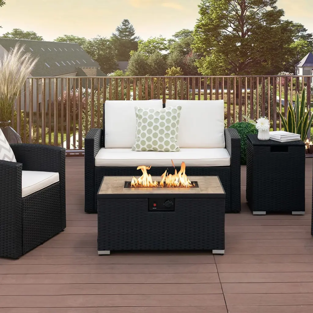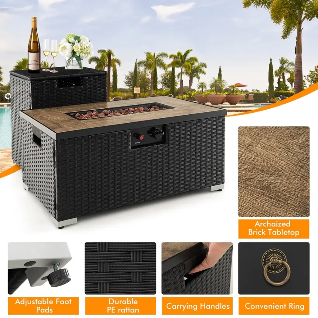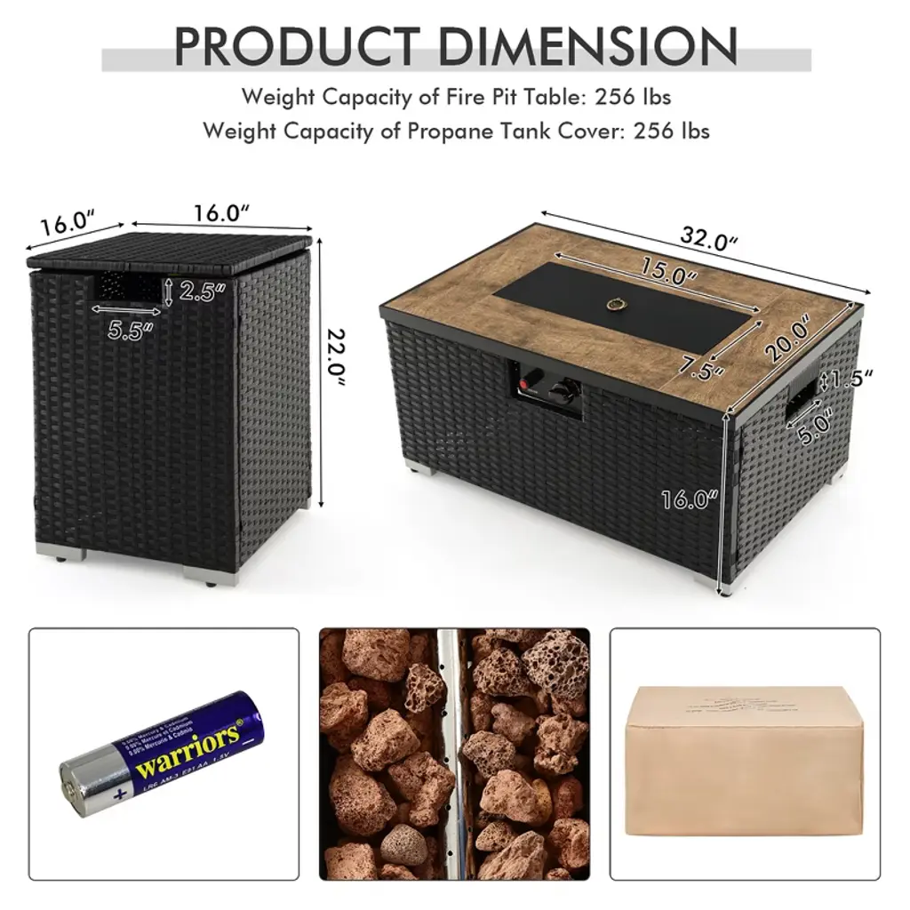 Have an enjoyable time with this outdoor fire pit table set! With a heat of 40000 BTU, the fire pit table can turn your outdoors into a warm place. Meanwhile, it can serve as a dining table without heat, providing a place for gathering time. The tank holder is also versatile. It can act as an outdoor side table, making everything with reach. Moreover, use it as a hideaway propane tank holder for a clean and orderly place. Furthermore, it can also store some items for you. Both the fire pit table and propane tank holder are made of all weather PE rattan for a long service time. Along with the waterproof cover, it is suitable for outdoor use, creating a happy time for you and your family or friends. When you need to move it to another place, the handles on both sides will help a lot.FeaturesAdjustable foot pads for enhanced stability CSA & ETL certification for extra reliability A detailed user’s manual helps the assemblySpecifications:Color of PE Rattan: Black Color of PVC Cover: Beige Material: PE Rattan, Steel, Ceramic, PVC Overall Dimension of Fire Pit Table: 32" x 20" x 16" (W x D x H) Overall Dimension of Tank Holder: 16" x 16" x 22" (W x D x H) Overall Dimension of PVC Cover: 32" x 21" x 18" (W x D x H) Net Weight: 57 lbs Weight Capacity of Fire Pit Table: 256 lbs Weight Capacity of Tank Holder: 256 lbs Package Includes: 1 x Fire Pit Table 1 x Tank Holder 1 x PVC Cover 1 Bag x Lava Rock 1 x AA Battery 1 x Instruction