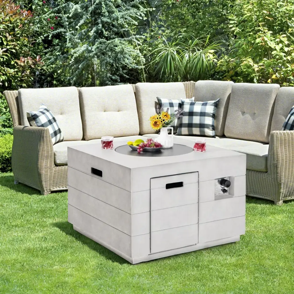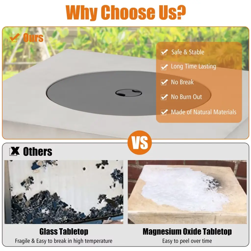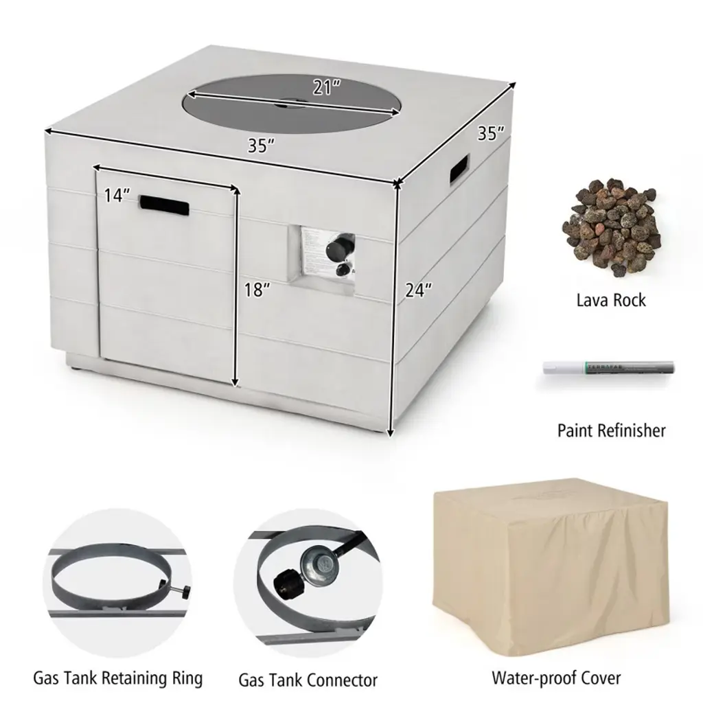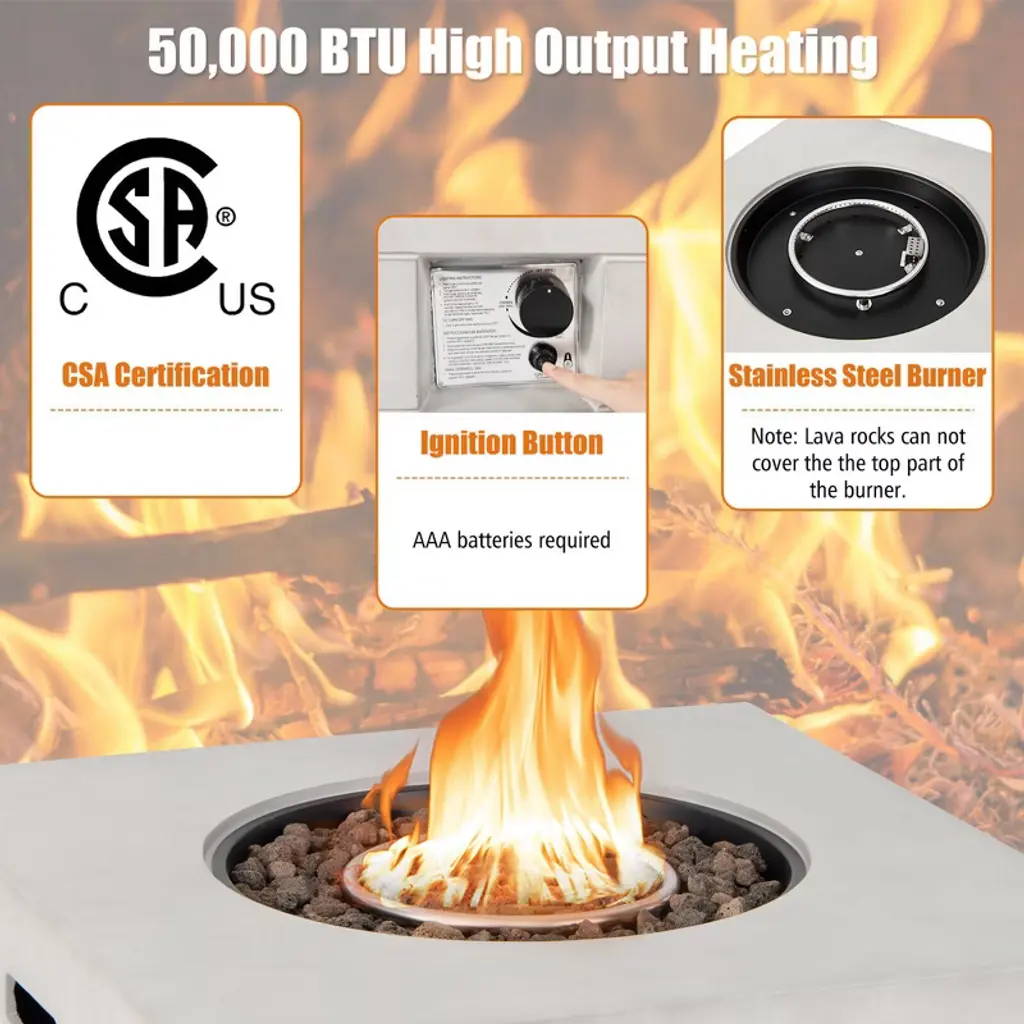 Still haven't figured out how to set up your patio? Our fire pit table is a wonderful option. This fire pit table is fueled by propane,which allows for more efficient heat production than traditional fuels. When the night comes,you can gather around the fire pit table with your friends and enjoy the beautiful night view while chatting. The warm feeling and the romantic firelight will always be with you. At other times,it can also be used as an ordinary outdoor table. The high quality material and scientific design will ensure the absolute safety of the use. Note: Lava rocks can not cover the top part of the burner.FeaturesElegant concrete-like appearance,putting highlight to your patio Absolutely safe fire pit table that have been certified by CSA Propane fueled fire pit table,without any smoke,sparks or ashesSpecifications:Color: Grey Material: Natural Concrete Material,Stainless Steel Overall Dimension: 35" x 35" x 24" (Wx Dx H) Net Weight: 108 lbs Recommended Propane Tanks: 20 lbs (Not included) Require 1 x AAA battery (Not included) Package includes: 1 x Fire Pit Table 1 x Water-proof Cover 1 x Paint Refill Pen 1 Pack x Lava Rocks 1 x Instruction