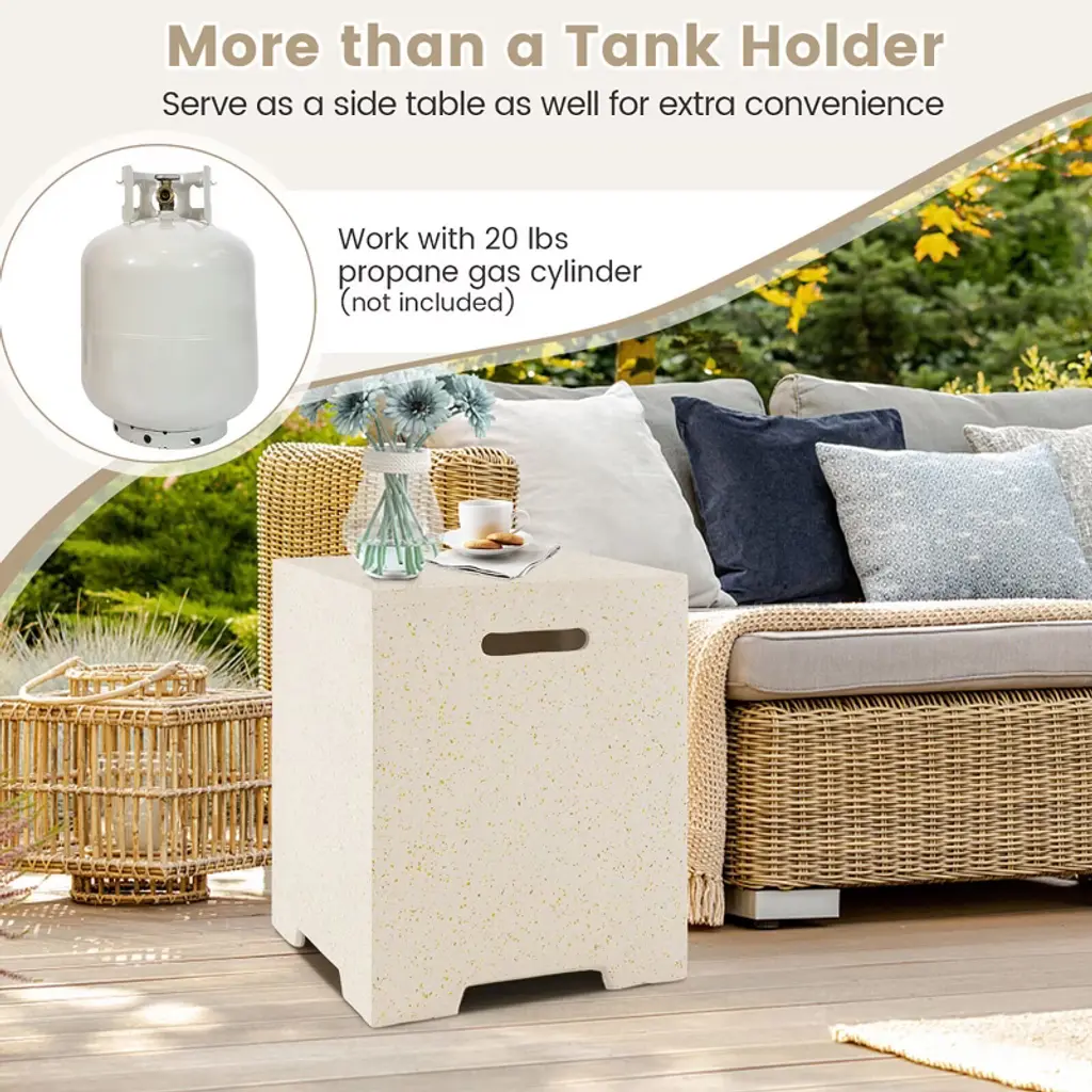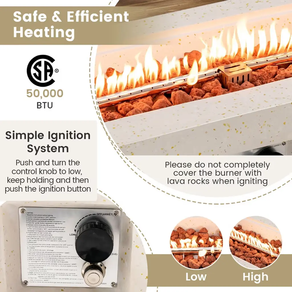 This 2-piece outdoor propane fire table set is a stylish and functional addition to any outdoor living space! With a 50,000 BTU output, this fire pit provides ample heat to keep you and your guests comfortable on cool evenings. The included lava rocks add a natural and rustic element to the fire pit, creating a beautiful and mesmerizing flame. Through the simple ignition system, you can adjust the flame to high or low level for different heating needs. What's more, the 20 lbs tank can then be hidden away in the propane tank cover table, keeping your outdoor space looking neat and tidy. And this tank holder can be used as a side table as well, making the items within reach. Moreover, the fire pit and hideaway table also come with rain covers.Features50,000 BTU heat output for sufficient warmth CSA certification for safe protection Easy to operate with simple ignition systemSpecifications:Color: White Material: Terrazzo, Metal, Stainless Steel Dimension of Fire Pit Table: 42" x 17" x 13" (W x D x H) Dimension of Tank Holder: 16" x 16" x20.5" (W x D x H) Length of Gas Hose: 10 ft Net Weight of Fire Pit Table: 68 lbs Net Weight of Tank Holder: 33 lbs Heat Output: 50,000 BTU Battery Required: 1 x AA Battery (Not Included) Suitable Gas Tank: 20 lbs (Not Included) Package Includes: 1 x Patio Fire Pit Table 1 x Tank Holder 1 x Bag of Lava Rocks 1 x Tank Seat 2 x Protective Covers 1 x Instruction