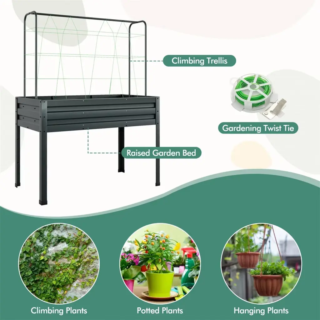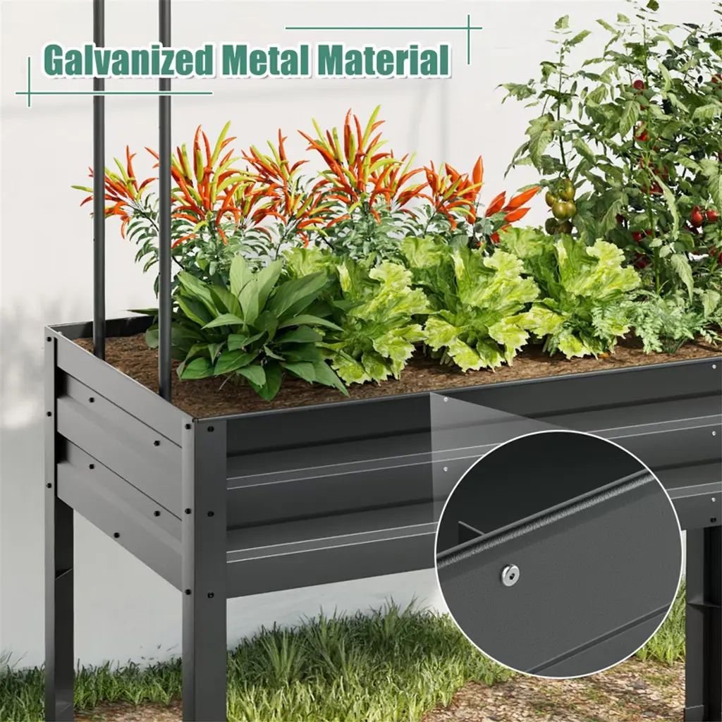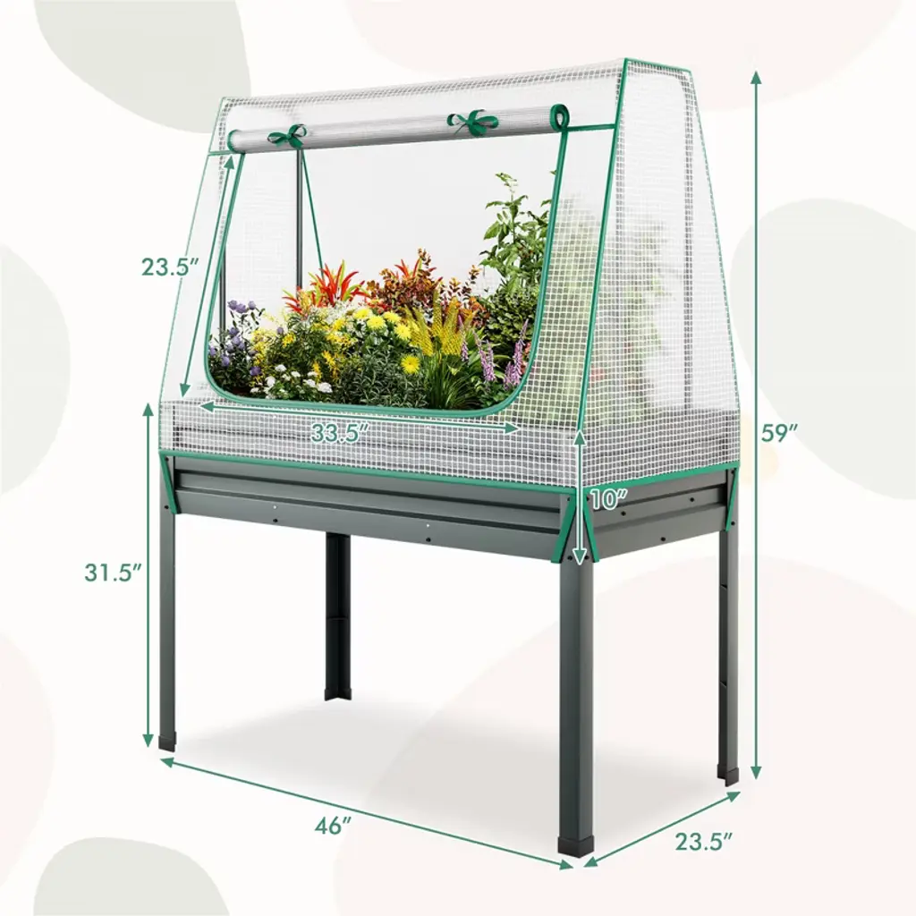 Elevate your gardening with the raised garden bed. Featuring a combination of a raised garden bed, climber-friendly trellis, and protective greenhouse cover, this tall garden box is suitable for different types of plants to create a flourishing garden oasis. The PE cover shields your greens from adverse weather while the convenient roll-up window simplifies watering routines. Moreover, with holes strategically placed to maintain ideal humidity levels, the soil remains perfect and fosters healthy plant life. Crafted from heavy-duty galvanized steel, the growing planter box is designed to stand the test of time. Plus, it comes with optimal height of 31.5", saving your back and keeping you gardening more comfortably.Features3-in-1 design with raised garden bed, trellis and cover PE cover is able to allow fresh air in and provide protection Ergonomic height ensures comfortable standingSpecifications:Color: Gray+White Material: PE, Metal Overall Dimensions: 46" x 23.5" x 59" (W x D x H) Size of the Elevated Planter Box: 46" x 23.5" x 31.5" (W x D x H) Depth of the Planter Box: 10" Size of the Window: 33.5" x 23.5" (L x H) Net Weight: 26.5 lbs Package includes: 1 x Raised Garden Bed with Cover & Trellis 1 x User's Manual