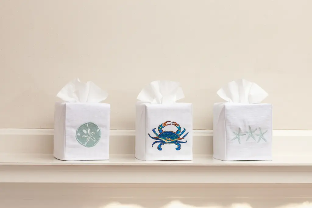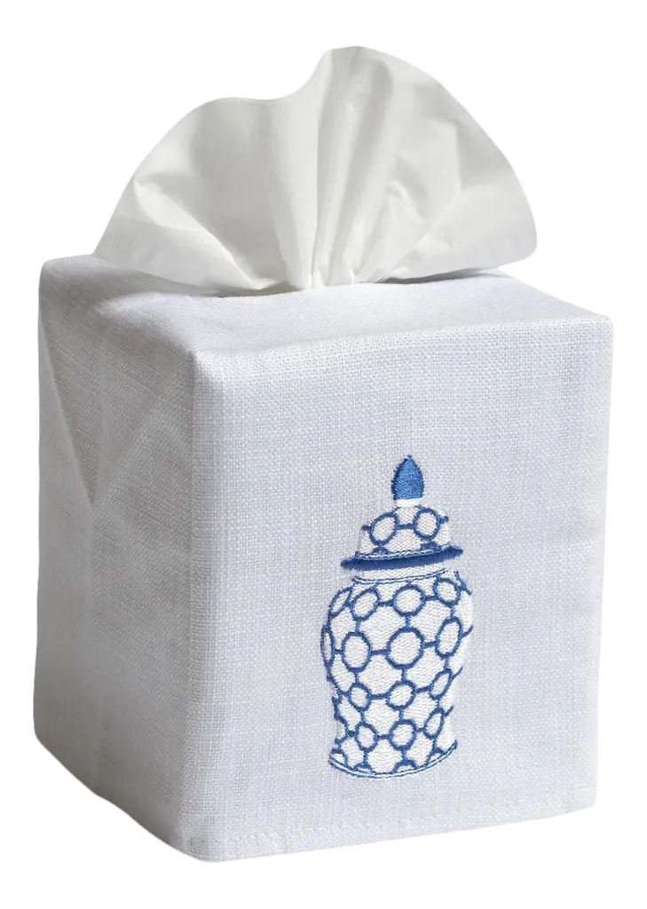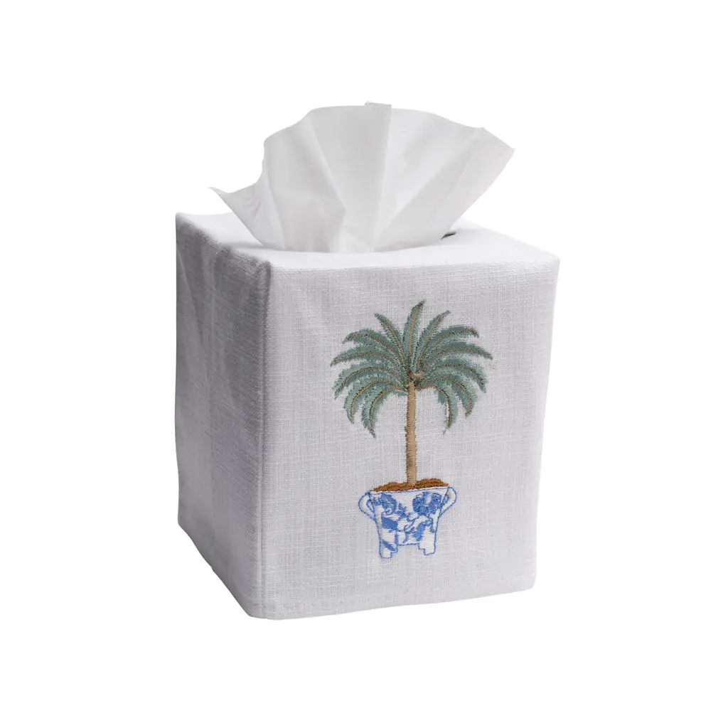 Size: W-4 ½”, D-4 ½”, H-5 ¼” (Fits the standard Puffs & Kleenex cubes) Fabric: White Linen / Cotton Embroidery: Tropical Palm Tree Washing: Machine washable cold Custom monogramming can be added to your Tissue Box Cover (also known as a Tissue Boutique) for a small extra cost. Please contact us to arrange this for you. These Tissue Box Covers (Tissue Boutiques) are made by talented Zulu women on the Kwa Zulu coastline in South Africa.