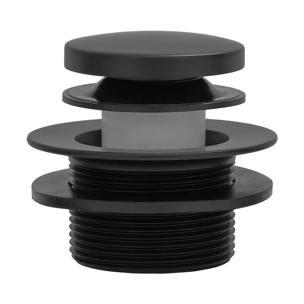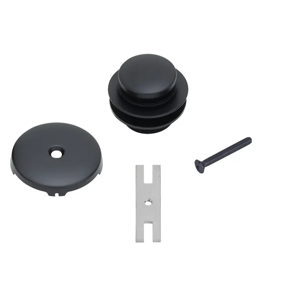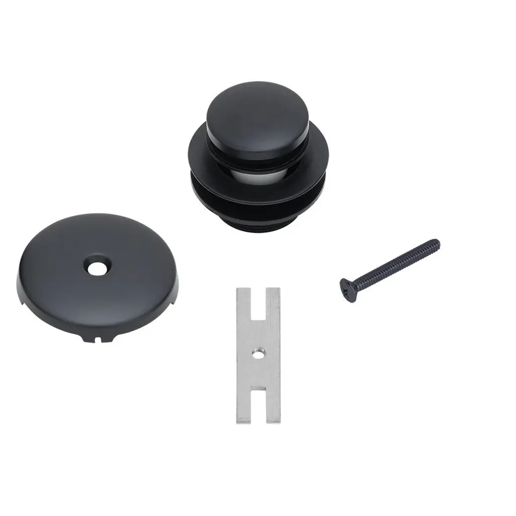 BRAND: Premier Copper Products Tub Drain Trim and Single-Hole Overflow Cover for Bath Tubs - Matte Black FEATURES: Configuration: Overflow or Non-Overflow Design: Push Pop Top (Toe Click Operation) Color: Matte Black Upper Flange Dimension: 2.8125" Push Pop Cap Dimension: 2" Drain Length: 2.5" Thread Length: 1.25" Installation Type: Above the Floor Drain Size: Fits 1.5" Threaded Drains Packaging: Recycled Cardboard Box Overflow Cover: Single Hole Overflow Cover Dimension: 3.125" Prop 65 Compliant INCLUDED: Warranty Information