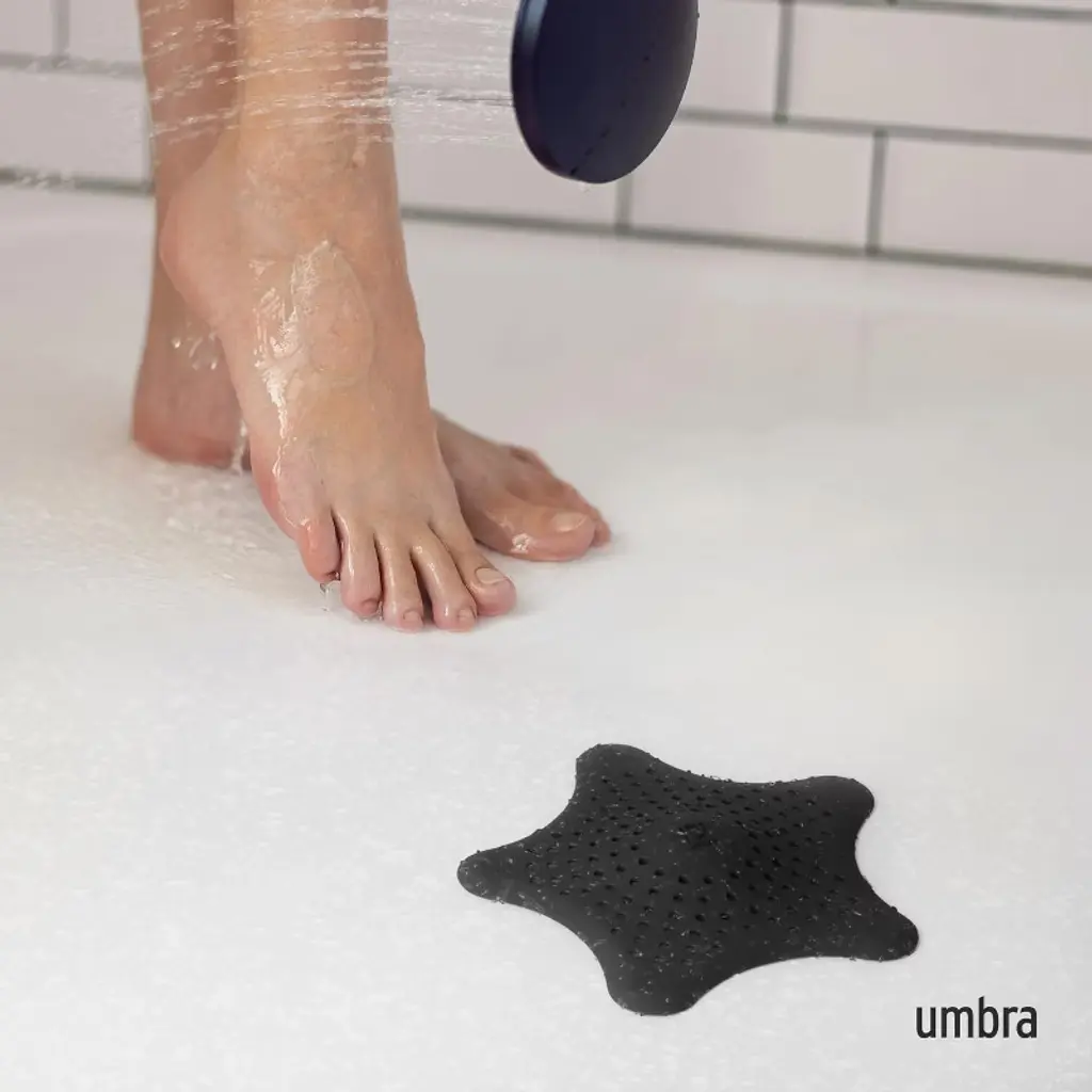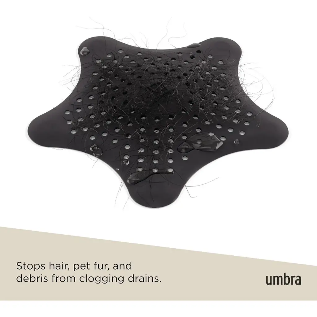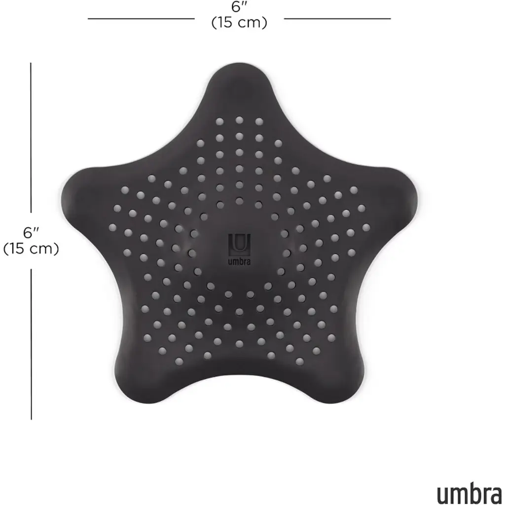 Starfish drain cover by umbra catches hair, helps prevent clogs in tub and showerFlexible silicone constructionSuction cups hold cover in placeMeasures 6-1/2-inch in diameter by 1-1/2-inch high; fits most standard drainsDesigned by Sung Wook ParkNature is an excellent source for design inspiration, since many of its naturally occurring abilities can be recreated and translated into high-functioning design.Introducing Starfish Hair Catcher by UmbraInspired by the design team's visit to the aquarium, the concept of Starfish was conceived by a real starfish's ability to stay suctioned to the aquarium floor.Use this playful yet functional design for any bathtub or shower in your home. This Starfish-shaped hair catcher uses each arm of the starfish to hold the cover in place over the drain. Made of flexible and water-resistant silicone, this product is easy to clean and maintain and fun to install; simply press down on each suction cup over your bathtub drain and you are set!Fits most standard tub and shower drains. Measures 6 ¬ inch (diameter) by « inch (height).About Umbra: A global product design company providing original, modern, casual, functional and affordable design for the home.