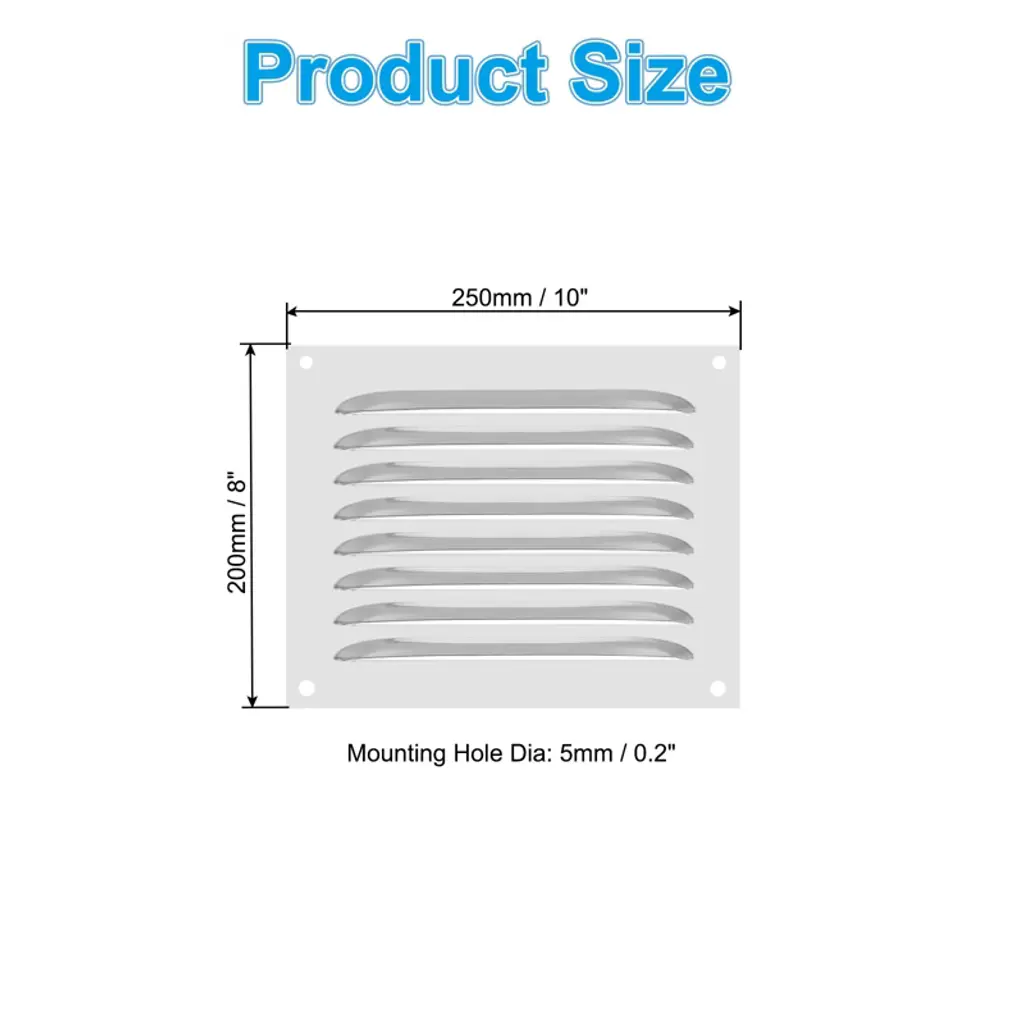 The vent cover is suitable for a variety of environments, including bathrooms, kitchens, bedrooms, and offices. It ensures proper airflow, reduces humidity and odors, and creates a comfortable and good living or working space. It can also be installed on walls, doors, windows, grills, fire pits, fireplaces, closets, electrical cabinets, and warehouses for air ventilation. Advantages: Made of 304 stainless steel, it ensures durability and corrosion resistance, suitable for long-term use. The vent is designed with 45-degree tilted louvers, which can achieve proper ventilation while effectively preventing dust and debris from entering your living space. The vent cover has a unique striped breathing hole design, allowing your living place or workplace to breathe and maintain good ventilation. The vent cover is easy to install, and you can install it on the wall or ceiling with screws. (Screws not included) Note: Before installation, please make sure the vent cover size matches the wall opening.