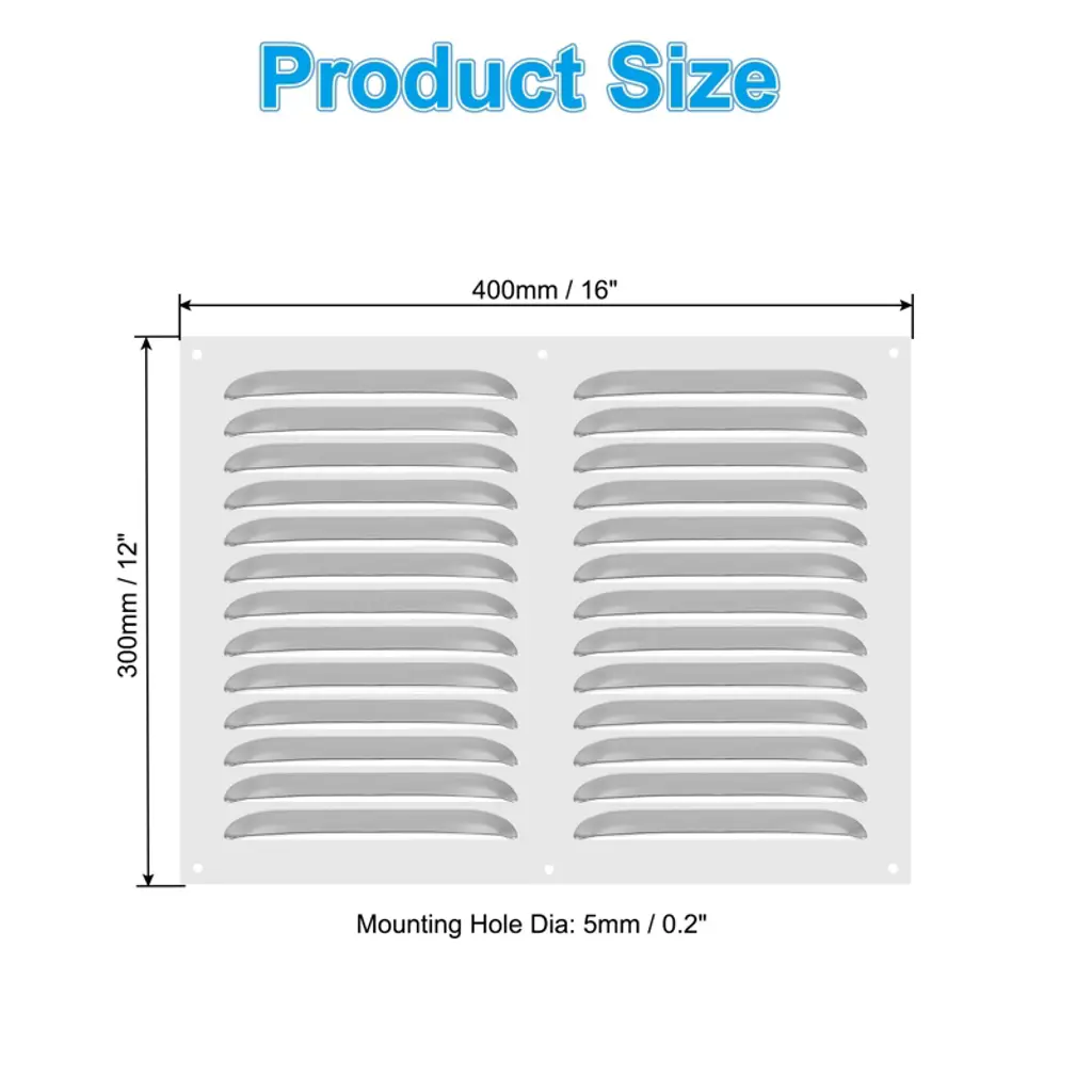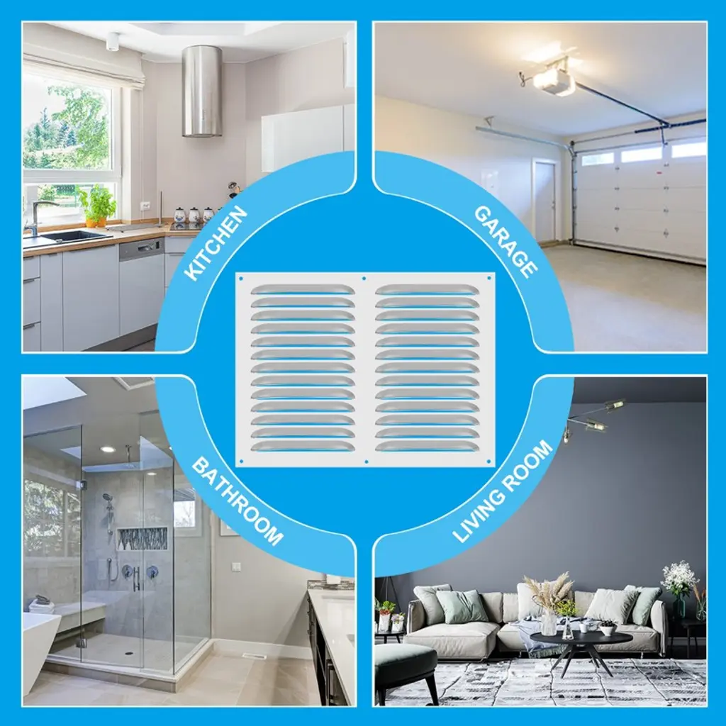 The vent cover is suitable for a variety of environments, including bathrooms, kitchens, bedrooms, and offices. It ensures proper airflow, reduces humidity and odors, and creates a comfortable and good living or working space. It can also be installed on walls, doors, windows, grills, fire pits, fireplaces, closets, electrical cabinets, and warehouses for air ventilation. Advantages: Made of 304 stainless steel, it ensures durability and corrosion resistance, suitable for long-term use. The vent is designed with 45-degree tilted louvers, which can achieve proper ventilation while effectively preventing dust and debris from entering your living space. The vent cover has a unique striped breathing hole design, allowing your living place or workplace to breathe and maintain good ventilation. The vent cover is easy to install, and you can install it on the wall or ceiling with screws. (Screws not included) Note: Before installation, please make sure the vent cover size matches the wall opening.