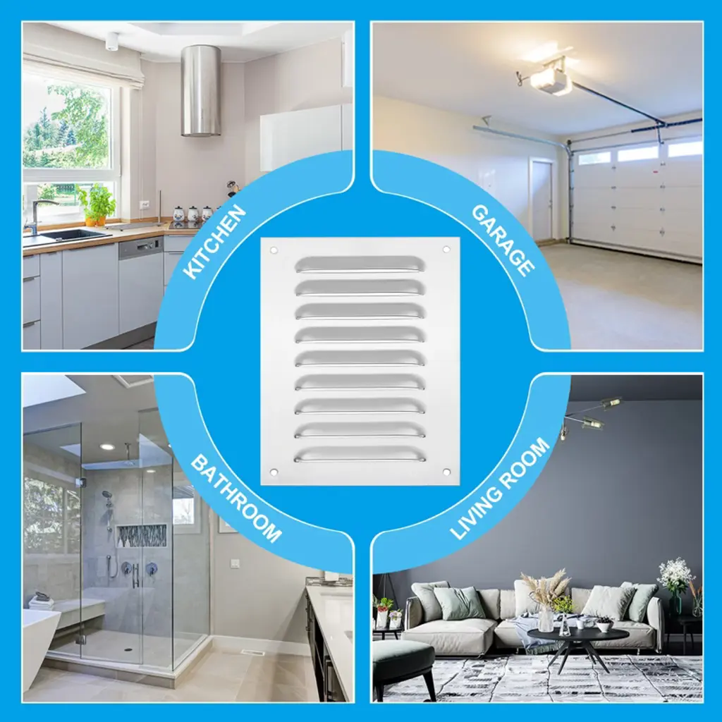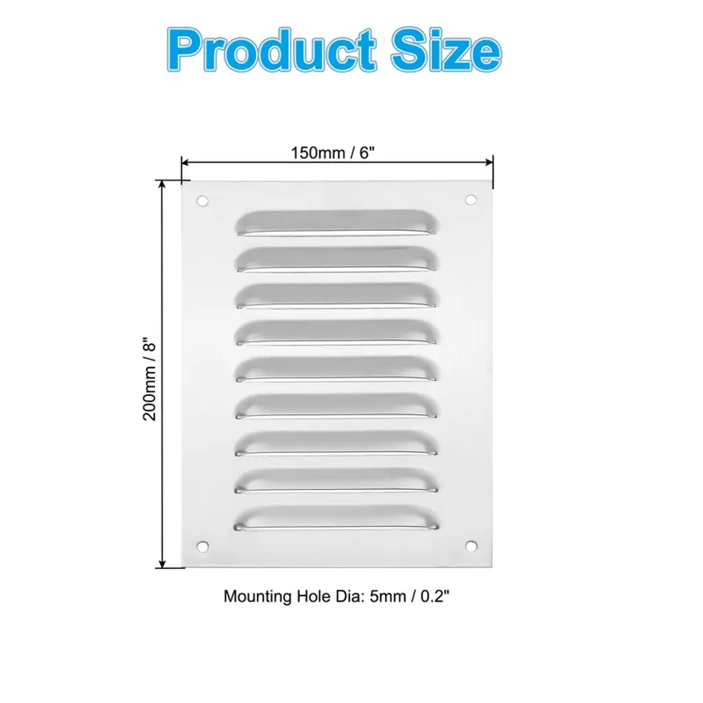 The vent cover is suitable for a variety of environments, including bathrooms, kitchens, bedrooms, and offices. It ensures proper airflow, reduces humidity and odors, and creates a comfortable and good living or working space. It can also be installed on walls, doors, windows, grills, fire pits, fireplaces, closets, electrical cabinets, and warehouses for air ventilation. Advantages: Made of 304 stainless steel, it ensures durability and corrosion resistance, suitable for long-term use. The vent is designed with 45-degree tilted louvers, which can achieve proper ventilation while effectively preventing dust and debris from entering your living space. The vent cover has a unique striped breathing hole design, allowing your living place or workplace to breathe and maintain good ventilation. The vent cover is easy to install, and you can install it on the wall or ceiling with screws. (Screws not included) Note: Before installation, please make sure the vent cover size matches the wall opening.