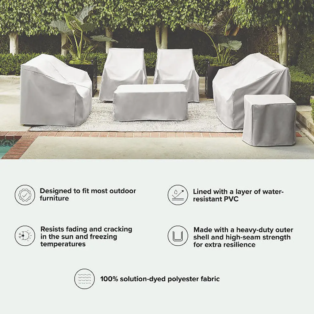 Our popular premium furniture covers provide an unparalleled level of protection for your outdoor furnishings. Meticulously designed and engineered, these long-lasting, all-weather covers are made using durable 100% solution-dyed polyester fabric that resists tears, fading and mildew year-round despite searing sun, blinding rain, bitter cold and prodigious snow. Learn how to measure your furniture with our Measuring Guide to ensure a proper fit. Inclusive dimensions fit most outdoor furniture 100% solution-dyed polyester fabric Made with a heavy-duty outer shell and high-seam strength for extra resilience Lined with a layer of water-resistant PVC Resists tears, abrasions and mildew Resists fading and cracking in the sun and freezing temperatures Double-stitched seams (6 stitches per inch) One set of buckles and webbing to secure covers in place Easy to store Wipe clean with a damp cloth and mild soap Imported. At Frontgate, our primary focus is quality. We guarantee that every product we sell will stand up to the supreme test – our customers' satisfaction. To learn more about our policies, visit our Shipping & Processing, Returns & Exchanges and Warranty & Price Guarantee pages.