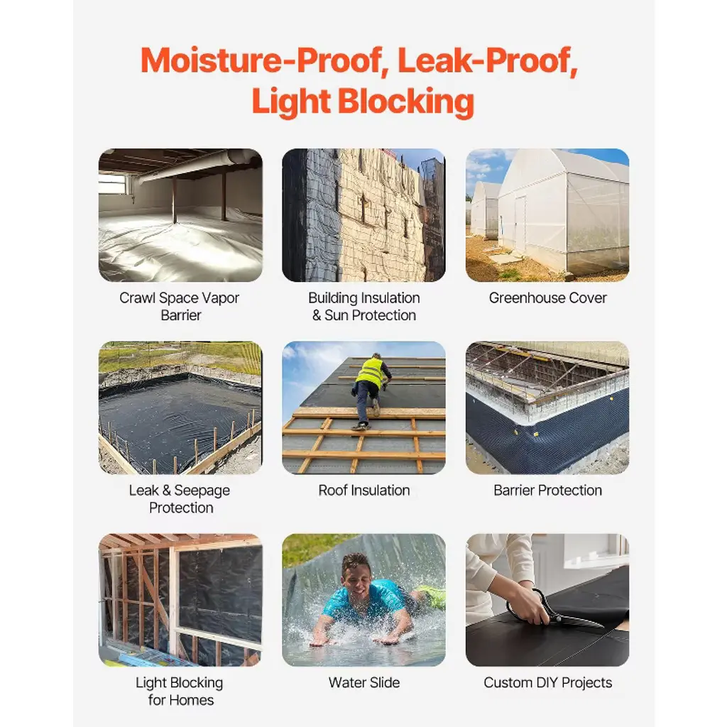 Feature: Enhanced Durability & Weather Resistance: Made with 6mil/0.15mm heavy-duty polyethylene, this garden plastic sheeting is designed for exceptional strength and resilience. It resists tearing, withstanding harsh conditions like heavy winds, extreme cold, intense sun exposure, and more, ensuring a long lifespan. Large Coverage Design: With a size of 10ftx100ft (3.05m x 30.48m), this crawl space vapor barrier offers extensive coverage, making it ideal for large-scale indoor and outdoor applications. Versatile Applications: Ideal for barrier protection, thermal insulation, and seepage resistance, and light-blocking entertainment setups. This heavy duty plastic sheeting is suitable for both industrial and construction environments. Efficient Protection: The dual-sided black and white design offers excellent reflectivity on the white surface and superior light-blocking on the black side. This double-layer, anti-seep barrier is great as a crawl space moisture barrier to minimize vapor penetration. Easy to Install & Use: Our 6 mil plastic sheeting is easy to cut and install, allowing customization into various shapes and sizes to meet different terrain needs and practical applications. Package Content 1 x Plastic Sheeting
