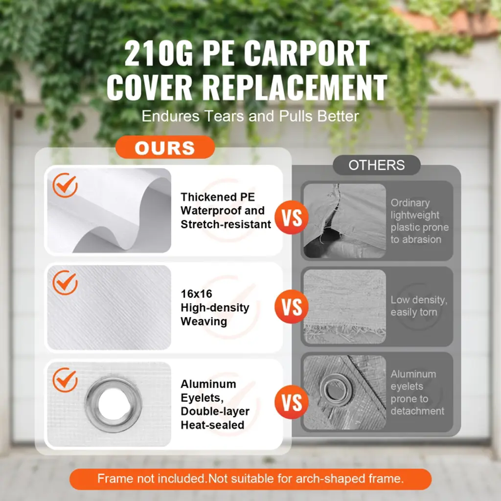 Feature: 10'x20' Practical Size: This canopy cover is suitable for a 10ftx20ft garage frame, replacing the canopy fabric, providing spacious coverage, with dimensions fitting snugly. (Canopy cover only, frame not included.). Durable Material: The garage canopy fabric, made of PE plastic woven fabric with a 16x16 weave pattern, is thickened and densified for water pooling-resistant, with double-layer heat-sealed seams at the canopy joints, and installation tightening for increased durability, preventing looseness or detachment. Waterproof and UV-Protection: The canopy fabric surface is treated with PU+UV-resistant components, double-coated for excellent waterproofing, capable of withstanding UV50+ ultraviolet radiation. Whether it's sunny or raining with strong winds, you can use it with confidence. Easy Installation: Comes with elastic ball Bungeess, threaded through aluminum grommets for secure fastening, no tools required, simple and effortless installation. Note: The carport cover is not suitable for arch-shaped frame. Note: The carport cover is not suitable for arch-shaped frame. Wide Application: This canopy cover can not only replace garage canopy tops and set up temporary garages for parking various vehicles, but can also be used for parties, weddings, creating shaded areas, and more creative uses awaiting your discovery! Package Content Carport Replacement Cover x 1 Ball Bungees x 40 User Manual x 1