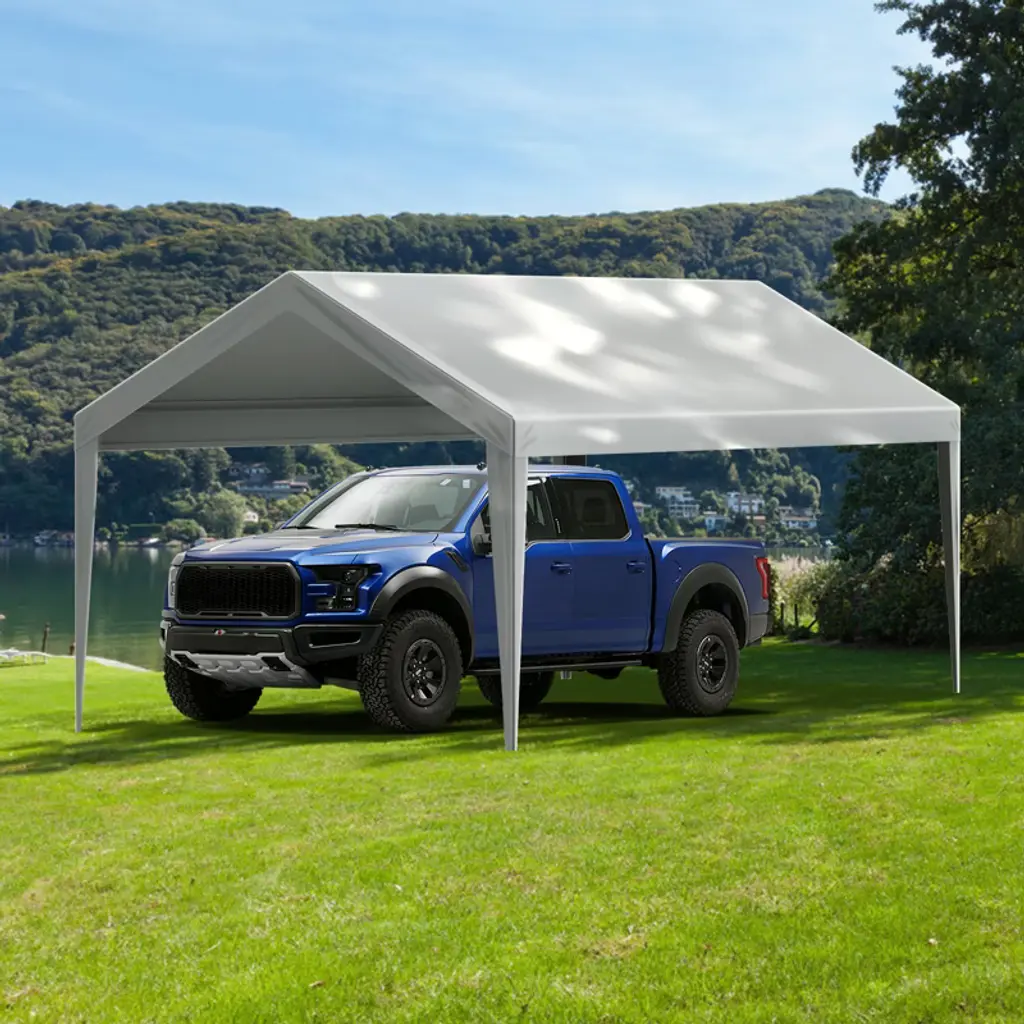 Feature: 10'x20' Practical Size: This canopy cover is suitable for a 10ftx20ft garage frame, replacing the canopy fabric, providing spacious coverage, with dimensions fitting snugly. (Canopy cover only, frame not included.). Durable Material: The garage canopy fabric is made of PE plastic woven fabric, crafted with a 16x16 weave pattern, thick material for water pooling-resistant, with double-layer heat-sealed seams at the canopy joints for added durability. The four leg wraps tightly encase the fabric, enhancing the canopy's stability for long-lasting, deformation-resistant use. Waterproof and UV-Protection: The canopy fabric surface is treated with PU+UV-resistant components, double-coated for excellent waterproofing, capable of withstanding UV50+ ultraviolet radiation. Whether it's sunny or raining with strong winds, you can use it with confidence. Easy Installation: Comes with elastic ball Bungees, threaded through aluminum grommets for secure fastening, no tools required, simple and effortless installation. Note: The carport cover is not suitable for arch-shaped frame. Wide Application: This canopy cover can not only replace garage canopy tops and set up temporary garages for parking various vehicles, but can also be used for parties, weddings, creating shaded areas, and more creative uses awaiting your discovery! Package Content Carport Replacement Cover x 1 Ball Bungees x 40 User Manual x 1