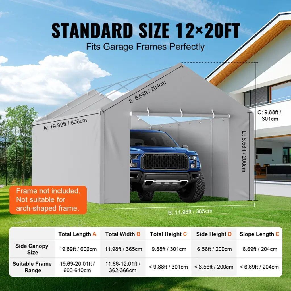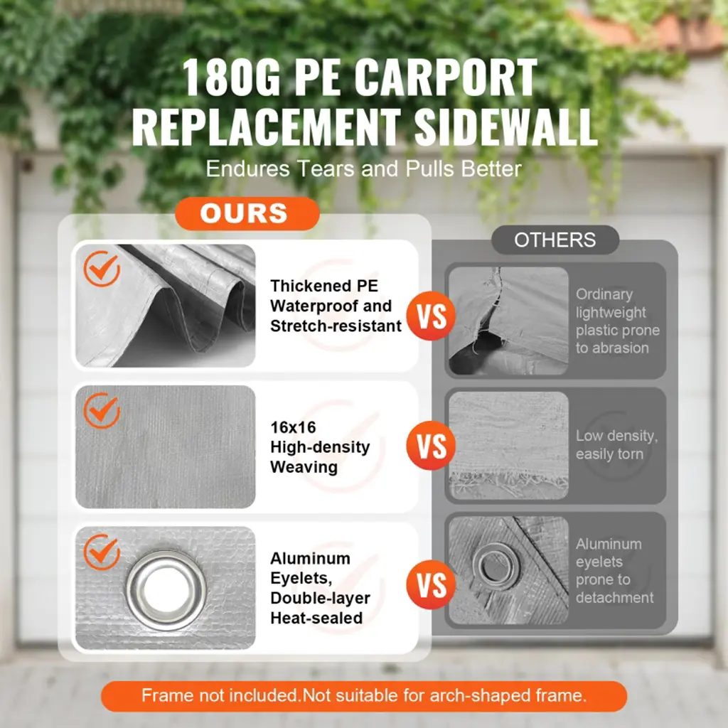 Feature: 12'x20' Practical Size: This side canopy fabric features a 4-panel front door with a dual zipper structure, designed for use in replacing side canopy fabric on 12'x20' garage frames. Spacious and perfectly sized to fit snugly (Includes only the side canopy fabric, frame not included). Durable Material: Made from PE plastic woven fabric with a 16x16 weave pattern, this fabric is thick and resistant to water pooling and wear. Double-layer heat-sealed seams ensure durability, while reinforced square blocks and cross-stitched Velcro on the sides enhance strength and longevity. Waterproof and UV Protection: Coated with PU+UV-resistant on both sides, this fabric offers excellent waterproofing and can withstand UV50+ ultraviolet radiation, ensuring reliable use in various weather conditions. Easy Installation: Comes with elastic ball bungees for fastening through aluminum grommets, and Velcro for side attachment, making installation simple and tool-free. Note: The carport cover is not suitable for arch-shaped frame. Wide Application: This canopy fabric is versatile, suitable for replacing garage side canopies, setting up temporary garages, and parking various vehicles. It can also be used for parties, weddings, creating shaded areas, and more creative uses awaiting your discovery! Package Content Carport Replacement Cover x 1 Ball Bungees x 48 User Manual x 1
