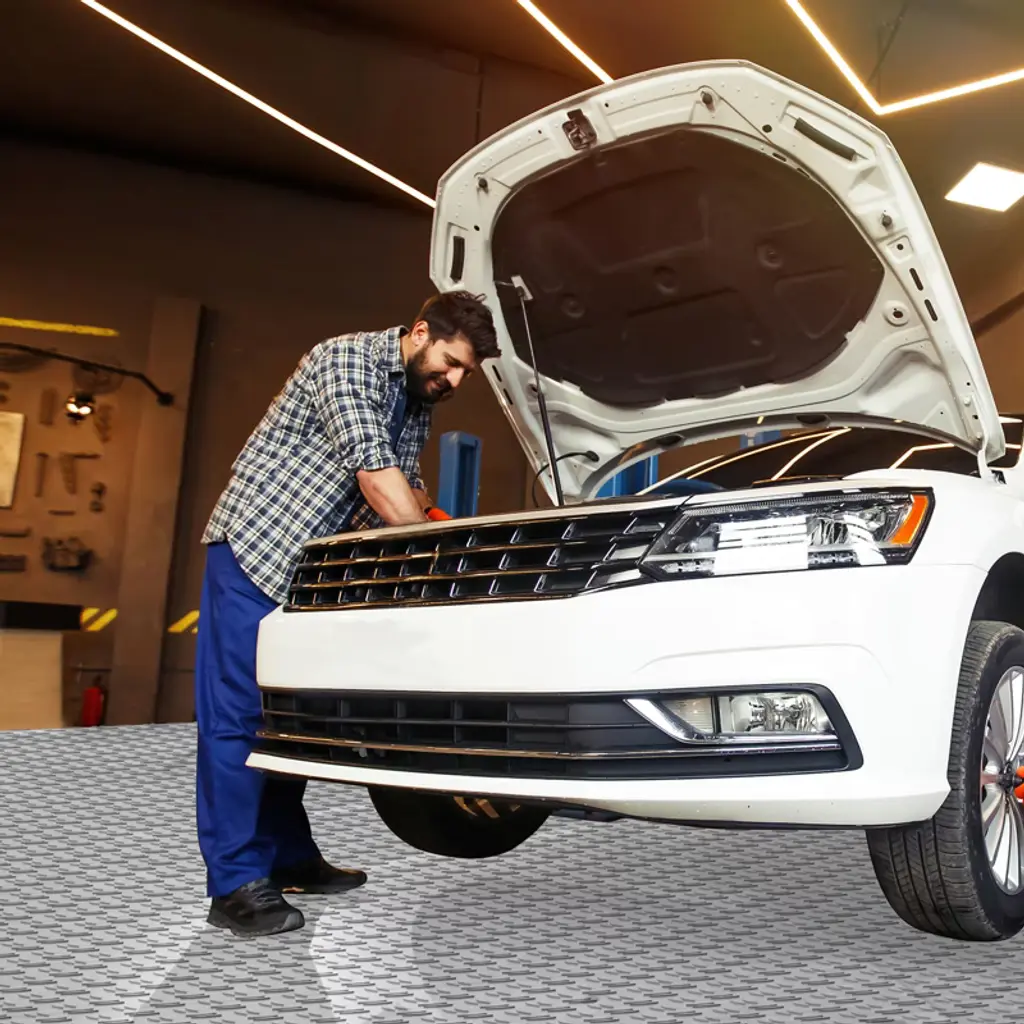 Feature: Multi-scene Versatility: Our garage tiles for multiple uses truly cover various scenarios. Whether it's a professional garage needing protection, or adding a comfortable shield in a personal warehouse, repair shop, or car exhibition, garage floor covering tiles are up to the task. 5500lbs Load Capacity: Our garage flooring interlocking tiles measure a thickness of 0.53inch / 13.4mm, ensuring outstanding wear resistance while providing robust load-bearing capability. It is capable of supporting up to 5500lbs without damage, even for large trucks. Upgraded Interlocking: These garage flooring tiles are enhanced with 6 interlocking loops for a smoother installation, ensuring a seamless fit without protrusions. Simply lay the garage floor tiles and interlock them within minutes. No tools, glue, or extra manpower required. Easy to Clean: Our garage tiles feature a 3D diamond-textured surface and rhombic grid bottom layer. Regular mopping and vacuuming maintain cleanliness. Superior Protection: Our interlocking garage floor tiles provide comprehensive protection for your floors, even for those prone to damage. Excellent non-slip properties ensure the mats stay in place. Package Content: 25 x Garage Tiles 1 x User Manual