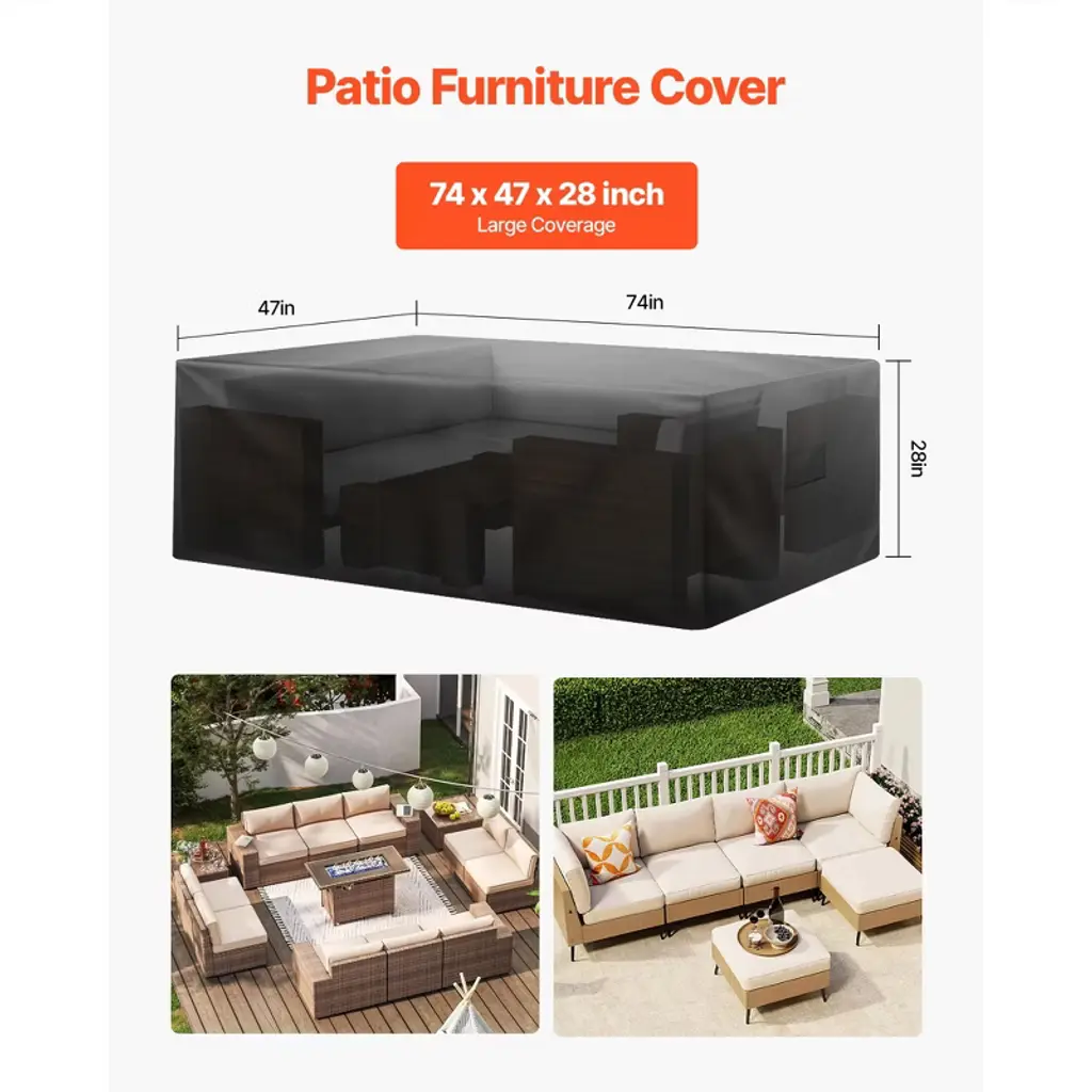 Feature: Universal Fit: This 74"L x 47"W x 28"H patio furniture cover fits most furniture like coffee tables, chairs, sofa, couch, and more. It provides full coverage and protection. Please check your furniture's dimensions for proper fit. Tear-Resistant & UV-Resistant: Made from durable 420D Oxford fabric with a silver-coated sunscreen layer, this patio table cover resists tears, wear, and UV damage, keeping your outdoor furniture secure from fading and aging caused by the sun. Double Waterproofing: The outdoor table cover features a waterproof coating on the back and PU waterproof tape on the seams, preventing water leakage and ensuring your furniture stays dry during heavy rain or damp conditions. Windproof Design: Equipped with buckles and elastic hem cords, this outdoor dining table cover is securely fastened to your furniture to prevent shifting or blowing away, even in strong winds, providing reliable protection in all conditions. Big Air Vents: Designed with air vents on both sides, this large patio furniture cover promotes airflow, whether facing rainy seasons or temperature changes, it keeps your outdoor furniture clean and dry. Package Content: 1 x Patio Furniture Cover 1 x User Manual