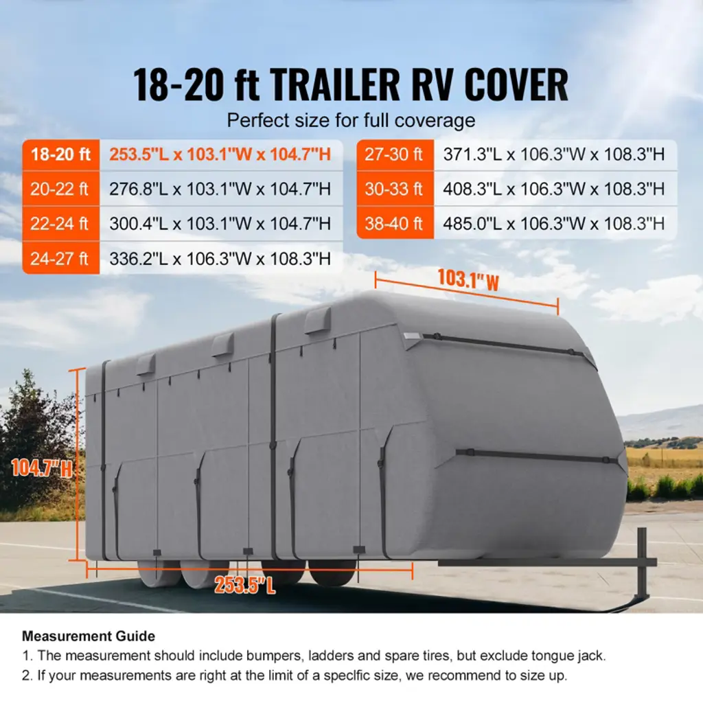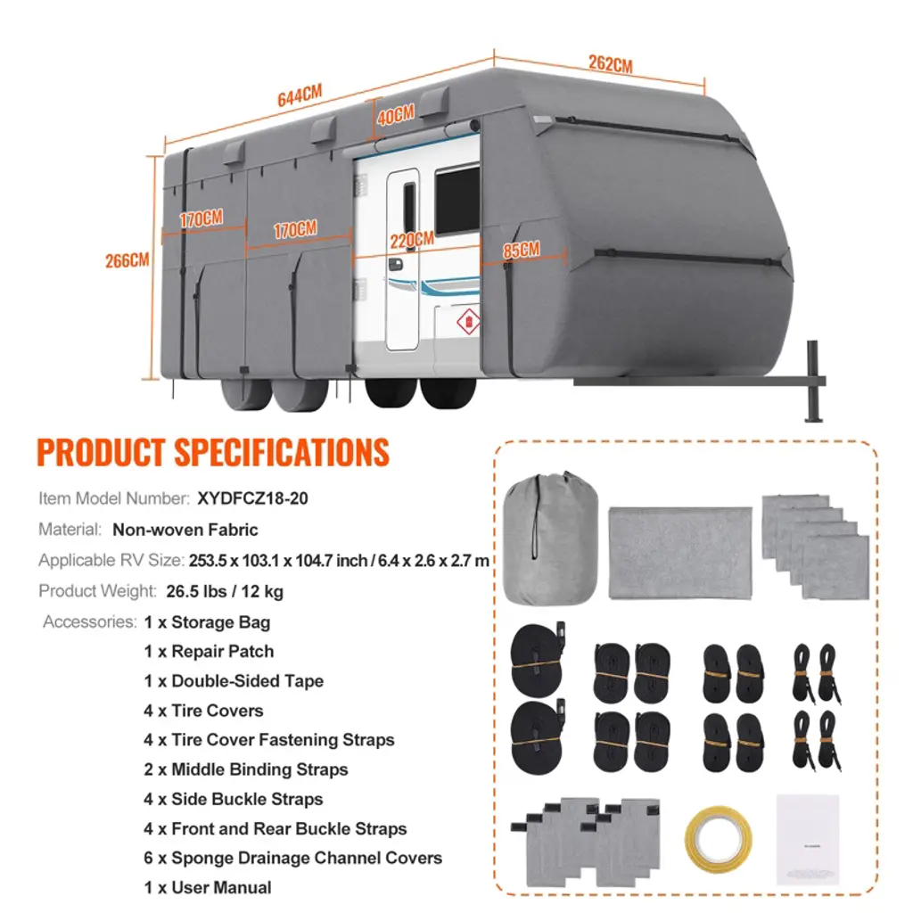 Feature: Fit 18-20 ft RVs: This travel trailer cover measures 253.5"L x 103.1"W x 104.7"H, providing a perfect fit for 18'-20' Class-A trailers. The set also includes 4 tire covers. For proper installation, please measure your RV accurately, including the bumper, ladder, and spare tire (excluding hitch). We provide a variety of sizes to ensure the perfect fit for your RV. Waterproof and Sun-proof: Crafted with a durable 4-layer top and 3-layer sides of wear-resistant, non-woven fabric, our trailer RV cover shields your RVs from rain, snow, strong winds, bird droppings, dust, and scratches. It features excellent breathability and sun-proof properties, reducing sun damage and safeguarding your RV against harsh weather conditions year-round. Double-stitched seams ensure long-lasting durability without cracking. Windproof Fit: The bottom edge of the trailer cover is made with elastic bands. Comprehensive straps and ropes are provided: 2 middle binding straps, 4 side buckle straps, 4 front and rear buckle straps, and 4 tire cover fastening straps. This design allows the cover to hug the contours of your RV, maintaining its shape and enhancing wind resistance to prevent tearing or blowing off. Two sides of the cover are equipped with 3 ventilation ports to avoid bulging. Convenient Access and Security: The zippered door allows you to open the windows and access the RV door easily, making it simple to load and unload without removing the entire cover. The widened Velcro at the bottom of the side zipper protects the zipper from damage, preventing seam splits in windy conditions. Reflective strips on the front and back enhance safety at night, during snow, or when parked, alerting nearby pedestrians and vehicles. Complete Accessories: The camper cover kit includes 6 sponge drainage covers, 1 storage bag, 1 repair patch, and 1 roll of double-sided tape. The sponge covers prevent snagging on sharp metal edges. If the cover gets cut by branches or sharp edges, simply apply the repair patch with our double-sided tape. The cover can be easily folded and stored in the bag when not in use. Our RV covers for travel trailers also feature "FRONT" and "END" labels for easy identification. Package Content 1 x RV Cover 1 x Storage Bag 1 x Repair Patch 1 x Double-Sided Tape 4 x Tire Covers 4 x Tire Cover Fastening Straps 2 x Middle Binding Straps 4 x Side Buckle Straps 4 x Front and Rear Buckle Straps 6 x Sponge Drainage Channel Covers 1 x User Manual