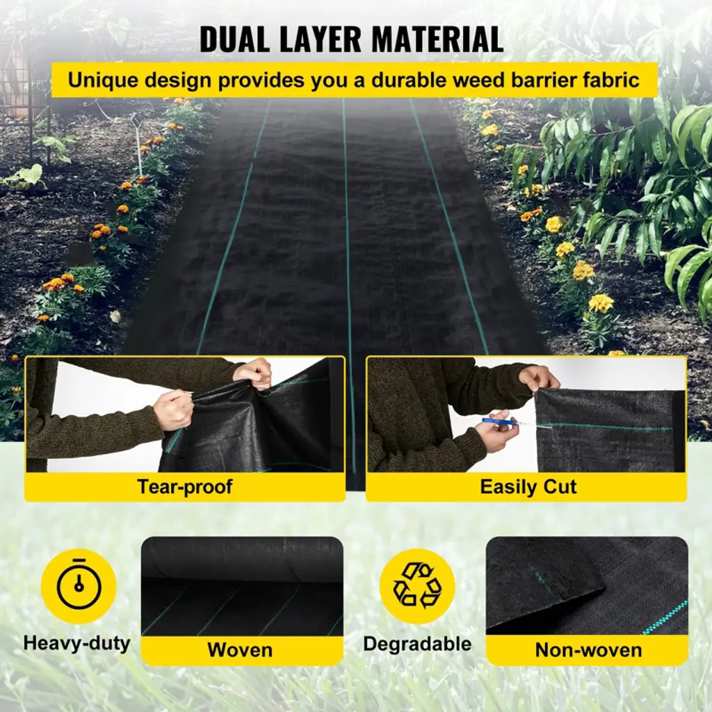 Feature: Heavy-duty PP Material: This landscape weed barrier fabric is made of 5.8oz high density needle-punched laminated fabric, tear-proof, easy to cut, and degradable. Size: 3 x 300 ft / 0.9 x 91.4 m. High Permeability: Our heavy duty weed barrier is designed with excellent permeability. You never need to worry about the water will be puddled on the top of the material. Note: Woven layer should face up for better sun protection, weed barrier, and more vital water permeability. Weed Control & Soil Improve: This landscape frabric can allow the soil to breathe and keep soil retaining humidity. In addition, a unique dual-layer design can accumulate nutrients for the earth, boosting the growth of your plants. Easy Installation: Our weed block fabric is effortless to cut and install. The garden cloth weed barrier is convenient to DIY the cloth size and shape to meet your different needs. It also features green stripes for easy plant alignment. (Installation tools are not included.) Wide Application: Durable garden weed cloth will keep annoying weeds away from your garden. The weed mat fabric is ideal for garden, agriculture, and industrial uses, such as a greenhouse, vegetable patch, flower bed, artificial grass, sidewalk, gravel, driveway, stones, etc. Package Content 1 x Weed Barrier