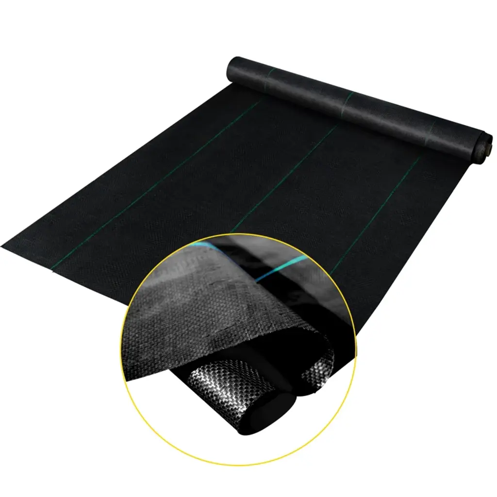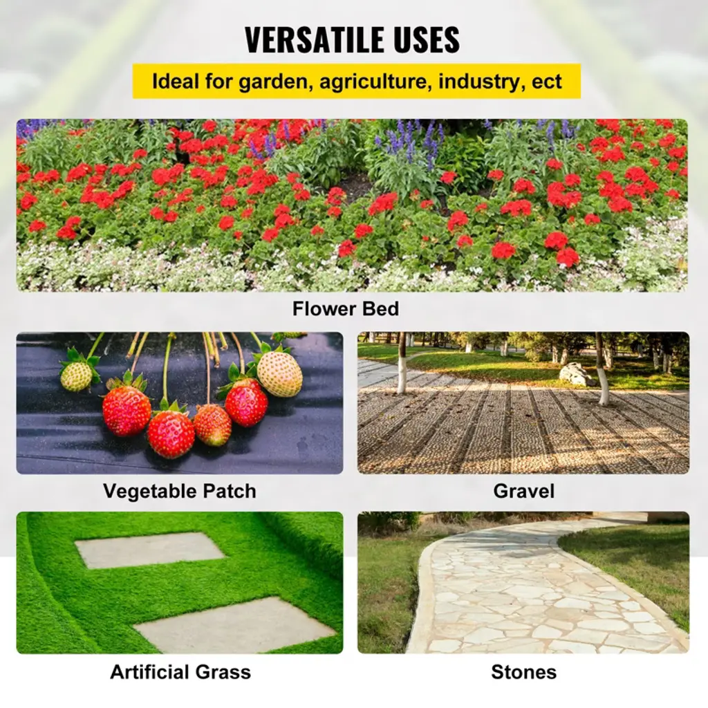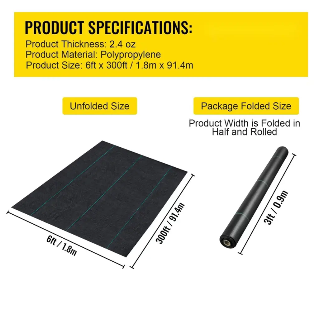 Feature: Durable PP Fabric: This 2.4 oz landscape weed barrier fabric measures 6 ft wide and 300 ft long. The heavy duty weed barrier is here to fully cover 1800 sq. ft area, making your life easier and 100% hassle-free. It protects your garden and flower beds from weeds, highly increasing your productivity and efficiency. High Permeability: Our heavy duty weed barrier is designed with excellent permeability. In addition, the sturdy structure of the fabric stops weed or grass from going through, effectively inhibiting weed or grass growth. Weed Control & Soil Improve: This landscape frabric can allow the soil to breathe and keep soil retaining humidity. In addition, the black color has better shading performance, and the material won't cause harm to the earth. Finally, the weed block fabric will provide you with premium weed protection for a long time under various weather conditions. Easy Installation: Our garden cloth weed barrier is effortless to cut and install. It is convenient to DIY the cloth size and shape to meet your different needs. The garden weed cloth also features green stripes for easy plant alignment. (Installation tools are not included.) Wide Application: Durable weed mat fabric will keep annoying weeds away from your garden. The landscape cloth is ideal for garden, agriculture, industrial uses, such as a greenhouse, vegetable patch, flower bed, artificial grass, sidewalk, gravel, driveway, stones, etc. Package Content 1 x PP Woven Ground Cover