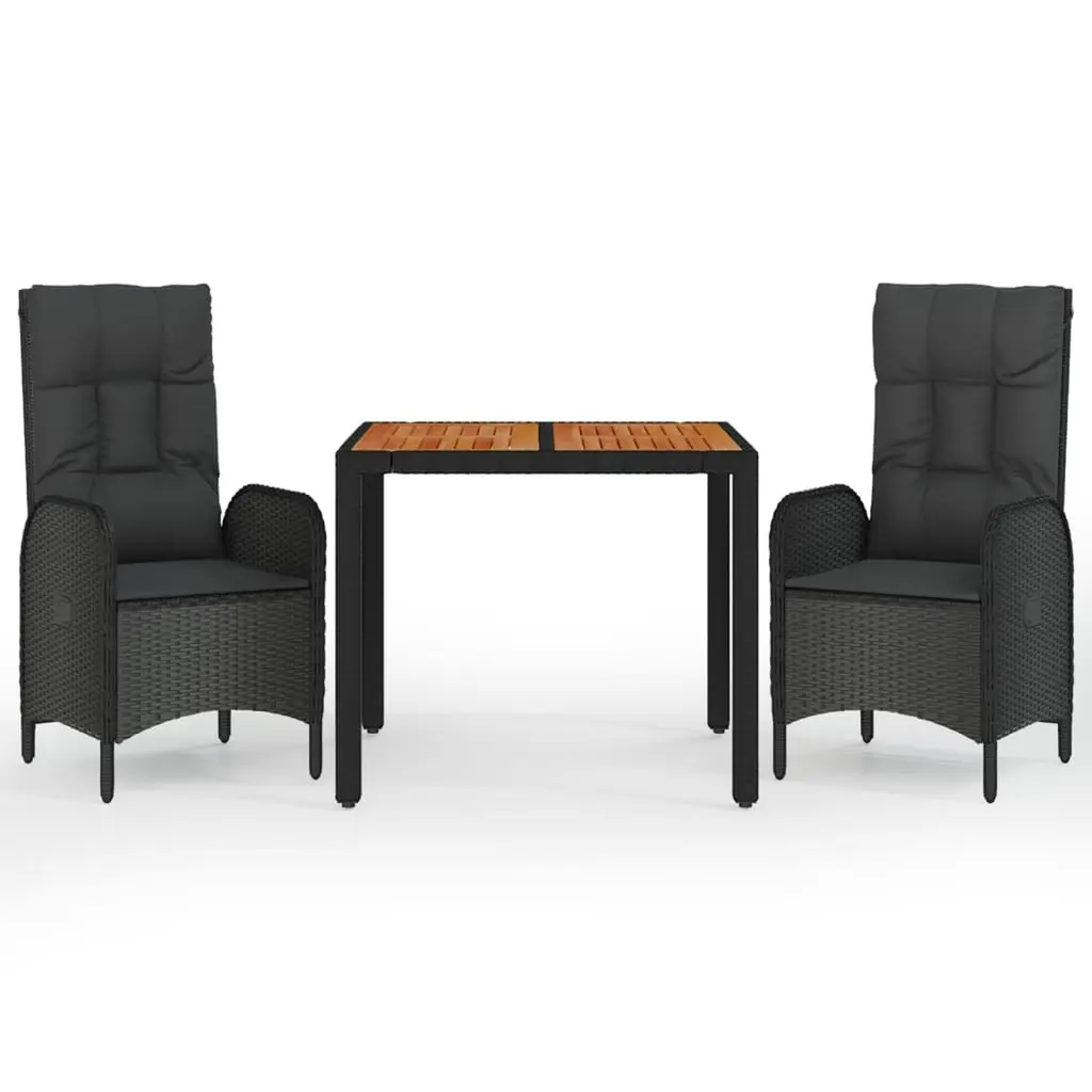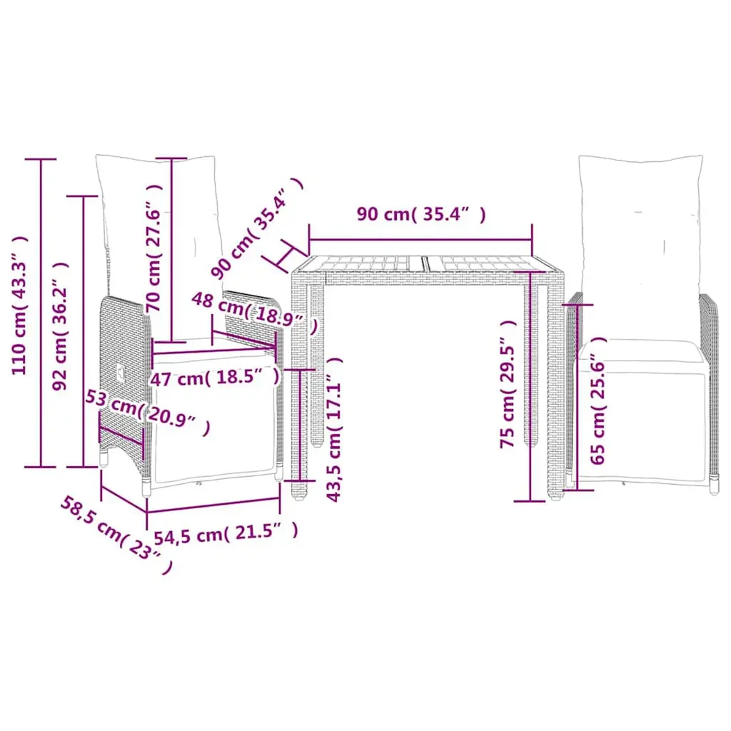 This 3 Piece Garden Bistro Set with Cushions combines modern style with comfy practicality, making it a top choice for your balcony, patio, or garden. The sleek design crafted from tough poly rattan means it can stand up to the weather while looking great. The comfy cushions and adjustable features make this furniture perfect for chit-chats over coffee or relaxed meals, easily accommodating two people. Modern Aesthetic: The chic design of this set enhances any outdoor area, making it a stylish focal point for gatherings. Comfortable Cushions: Each chair comes with soft seat and back cushions, both with removable covers for easy cleaning, ensuring you relax completely. Adjustable Features: With adjustable backrests and footrests, you can tailor your seating perfectly for lounging or dining. Sturdy Build: Made from UV-resistant poly rattan and powder-coated steel, this bistro set not only looks great but is built to withstand the elements. Easy to Assemble: Simple instructions and tools required make setting up your new bistro set a breeze.