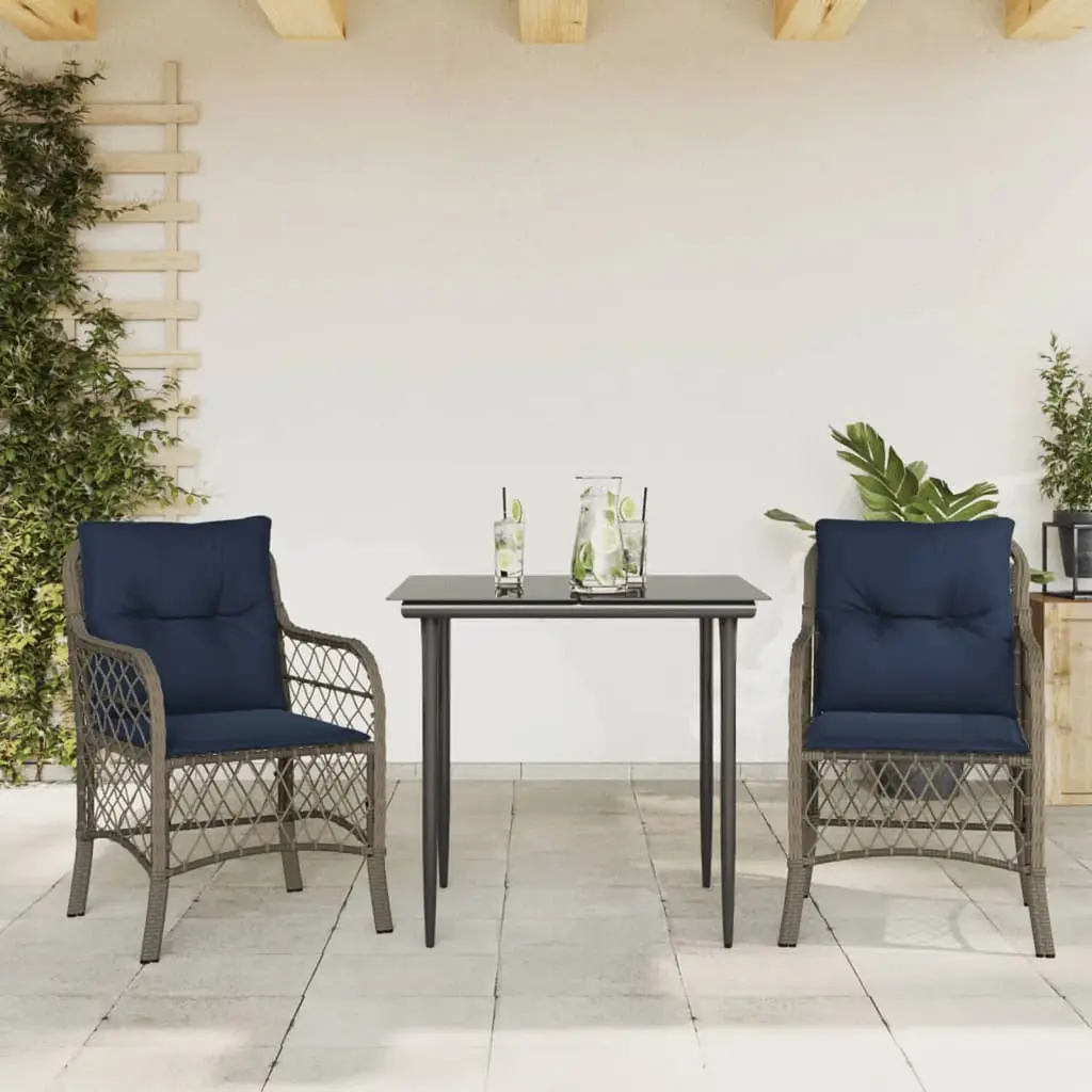 This 3-piece Bistro set mixes style with practicality, boasting a modern design ideal for small gatherings or balcony coffee breaks. In a chic grey hue, the set features two cushioned chairs and a square table topped with tempered glass, perfect whether it's on a patio, balcony, or in a garden. High-Quality Construction: The frame is made from powder-coated steel, providing lasting durability while enhancing the set's modern look.Comfort-Centric Design: Each chair has plush polyester cushions crafted for comfort, great for long use during outdoor hangs.Easy Maintenance: The tempered glass tabletop is a breeze to clean, letting you enjoy your bistro set without hassle.Compact Size: Perfect for small spots, the petite dimensions of this bistro set make it ideal for snug balconies or patios.Stylish Versatility: This set fits perfectly in many settings, from garden picnics to chic cafes.