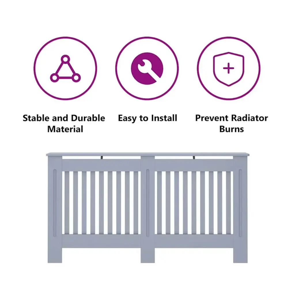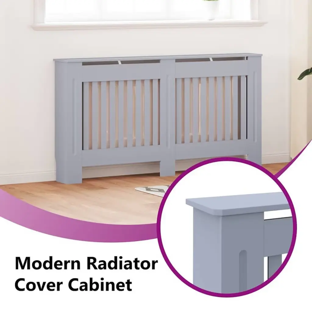This set of two engineered wood radiator covers offers a stylish and practical way to conceal your radiators while enhancing your living space. Designed with a modern look and a smooth, matte finish, these covers blend seamlessly into contemporary interiors. The vertical slat design ensures optimal airflow while keeping your space looking tidy and elegant.Key Features• Modern, chic design with clean lines• Made from durable, water-resistant engineered wood• Smooth matte finish for a sleek appearance• Easy to maintain—just wipe clean with a dry cloth• Covers sharp radiator edges for added safetyFunctional Benefits• Conceals radiators for a neat, uncluttered look• Provides extra shelf space for decorative items or photos• Vertical slats allow efficient heat circulation• Simple assembly requiredProduct Details• Set includes: 2 radiator covers• Color options available: Anthracite, Black, Brown, Gray, White• Size options available: 30.7" x 7.5" x 32.1", 44.1" x 7.5" x 32.1", 59.8" x 7.5" x 32.1", 67.7" x 7.5" x 32.1", 80.7" x 8.1" x 32.1"• Material: Engineered wood• Overall dimensions (per cover): 59.8" x 7.5" x 32.1"• Weight (per cover): 23.6 lbs• For indoor use onlyEasy Assembly & Maintenance• Assembly required; instructions included• Low-maintenance surface—simply wipe cleanUpgrade your home with these versatile radiator covers, available in multiple sizes and colors to fit your décor and space needs.