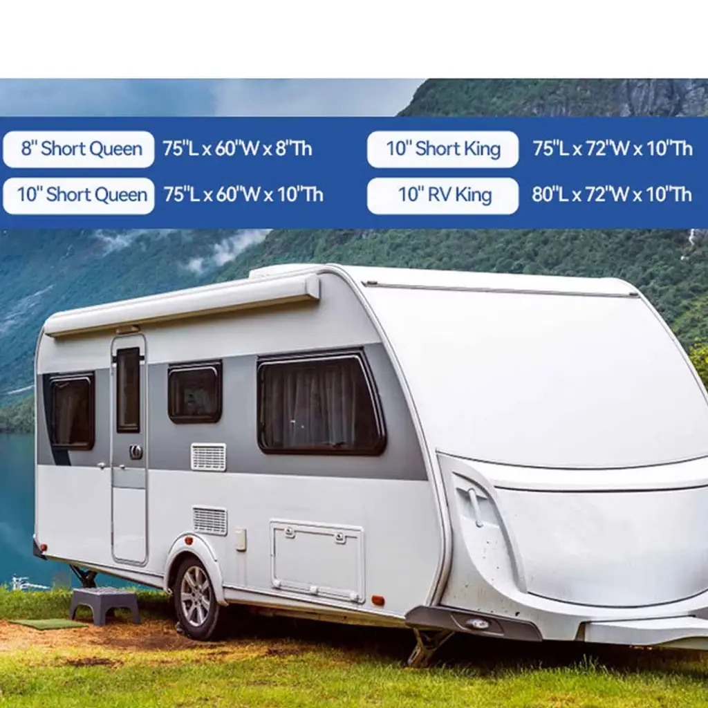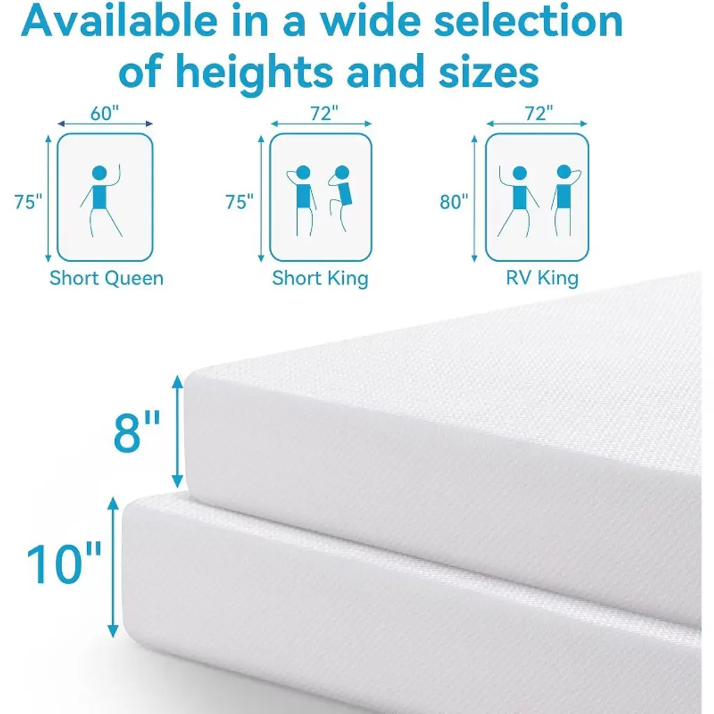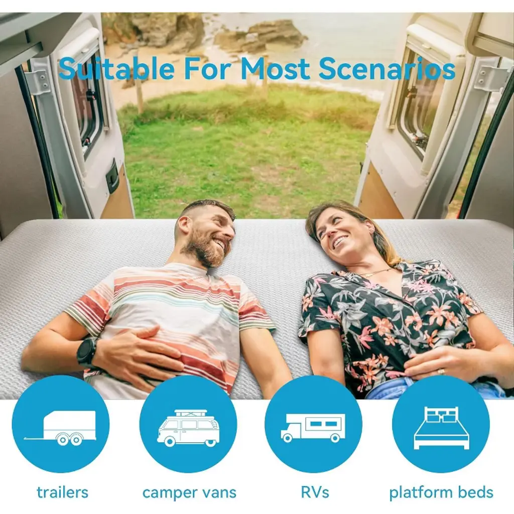 QUALITY MEMORY FOAM MATTRESS Firm Mattress in a Box with a luxurious Tencel removable cover - softer, cooler, and fiberglass-free. It features premier cooling gel and green tea memory foam that hugs your shape to lull you into sleep. Experience high-quality CertiPUR-certified foams for unmatched comfort. The perfect family gift for campers and RV enthusiasts. UPDATED TENCEL FIBERGLASS-FREE COVER This green tea gel mattress is wrapped in a breathable, soft jacquard Tencel cover that’s smooth, comfortable, and cooler to the touch, ensuring safe, deep sleep even in summer. With a zipper at the back for easy removal, it’s machine-washable for hassle-free maintenance. CertiPUR-US RV MATTRESS Our memory foam and fabrics undergo rigorous safety evaluations to meet the highest standards. Perfect for RVs, campers, trailers, and trucks, this mattress delivers a great night’s sleep - whether you’re camping or using it for everyday living. PRESSURE-RELIEVING & STRONG SUPPORT This firm mattress for back pain conforms to your body, featuring breathable green tea and cooling gel memory foam to neutralize odors and keep you refreshed. The high-grade base foam provides solid spinal support and relaxes muscles for a restorative sleep experience. WARRANTY & BED IN A BOX Contact us anytime if you have questions about the 10-inch mattress. Compressed and shipped in a box for easy transport and setup - simply unpack, unfold, and let the mattress expand to its original shape within 24-48 hours.