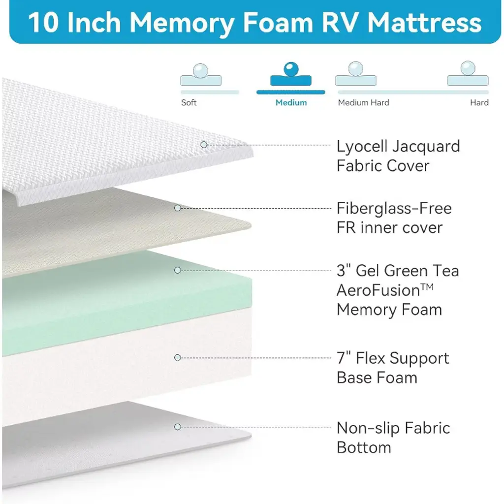 QUALITY MEMORY FOAM MATTRESS Firm Mattress in a Box with a luxurious Tencel removable cover - softer, cooler, and fiberglass-free. It features premier cooling gel and green tea memory foam that hugs your shape to lull you into sleep. Experience high-quality CertiPUR-certified foams for unmatched comfort. The perfect family gift for campers and RV enthusiasts. UPDATED TENCEL FIBERGLASS-FREE COVER This green tea gel mattress is wrapped in a breathable, soft jacquard Tencel cover that’s smooth, comfortable, and cooler to the touch, ensuring safe, deep sleep even in summer. With a zipper at the back for easy removal, it’s machine-washable for hassle-free maintenance. CertiPUR-US RV MATTRESS Our memory foam and fabrics undergo rigorous safety evaluations to meet the highest standards. Perfect for RVs, campers, trailers, and trucks, this mattress delivers a great night’s sleep - whether you’re camping or using it for everyday living. PRESSURE-RELIEVING & STRONG SUPPORT This firm mattress for back pain conforms to your body, featuring breathable green tea and cooling gel memory foam to neutralize odors and keep you refreshed. The high-grade base foam provides solid spinal support and relaxes muscles for a restorative sleep experience. WARRANTY & BED IN A BOX Contact us anytime if you have questions about the 10-inch mattress. Compressed and shipped in a box for easy transport and setup - simply unpack, unfold, and let the mattress expand to its original shape within 24-48 hours.