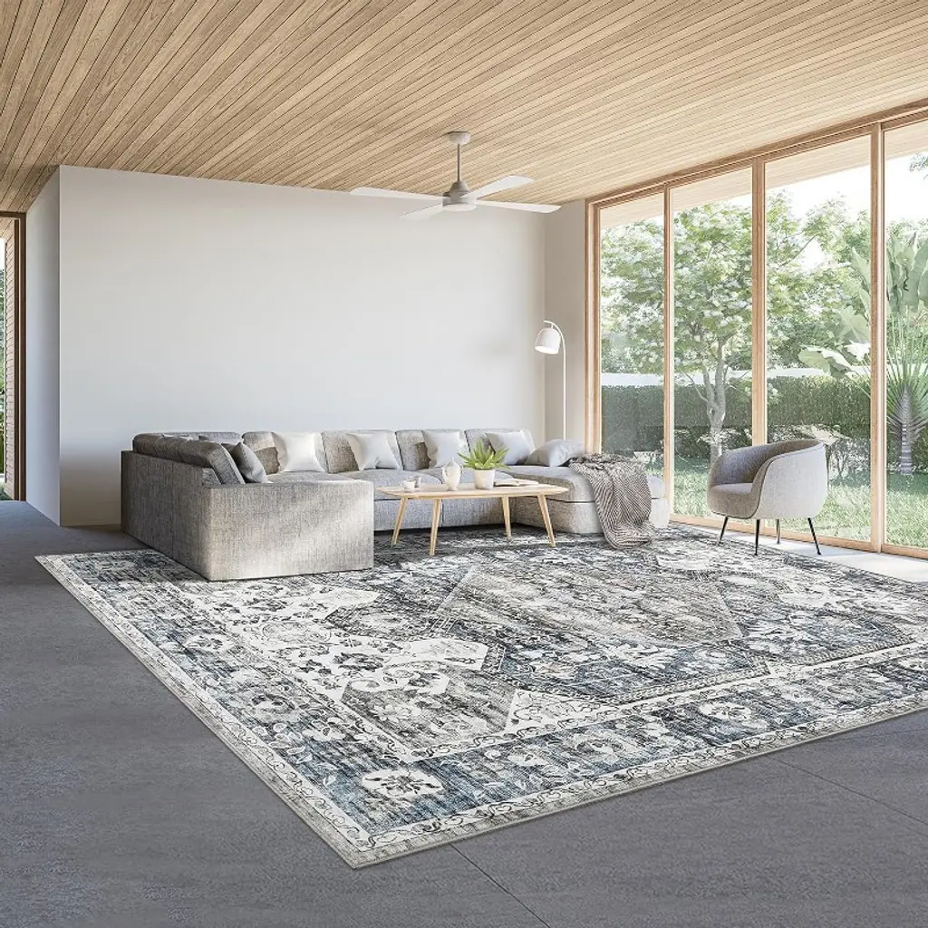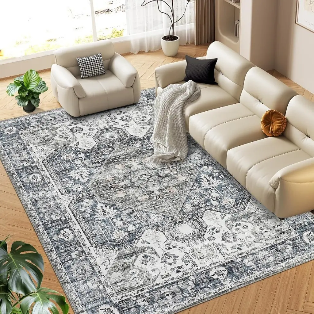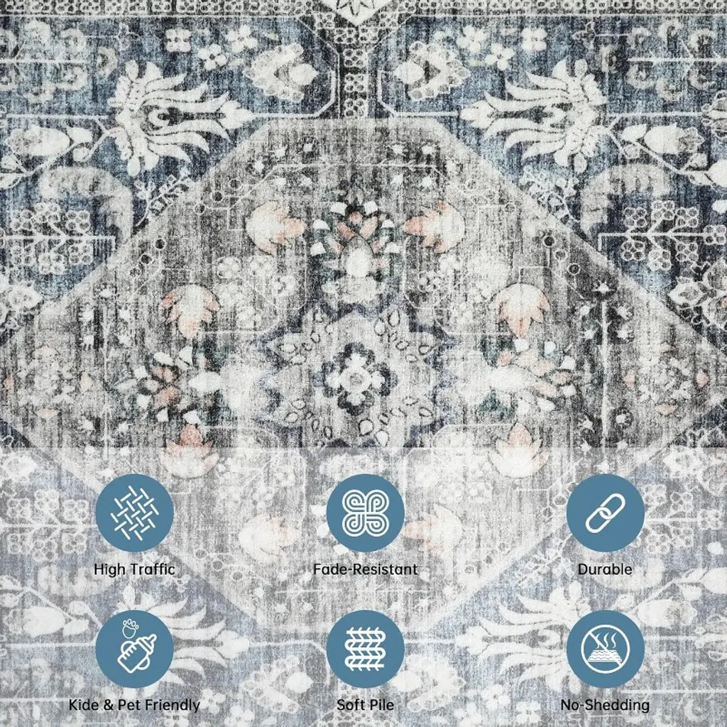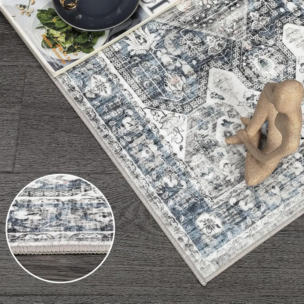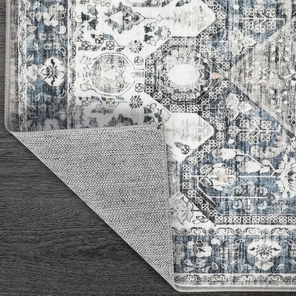Washable Medallion Area Rug For Bedroom, Living Room, Vintage Print Non-shedding Non-slip Throw Mat, Low Pile Carpet, Floor Cover, Gray Blue 5*7ft
