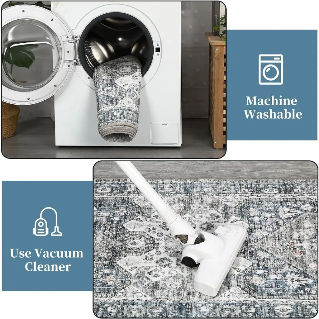Specification: Material: 100% polyester, the rug backing was coated with TPR backing Applications: Living Room Rug, Bedroom Rug, Dining Room Rug, Kitchen Rug, Entryway Rug, Hallway Rug, Home Office Rug, Laundry Rug, Nursery Rug, Playroom Rug, Dorm Rug Packing List: Rug x 1 Friendly Note: 1. Simply wipe local stains with a wet rag and use a vacuum cleaner for daily maintenance. 2. Deep cleaning is also possible, with the option to machine wash the rug, ensuring it remains fresh and clean. 3. When you first get the carpet, you may notice some wrinkles or folds, but don't worry! Simply lay it flat on the floor and the creases will naturally disappear. You can use it with peace of mind learning that this is a normal process.