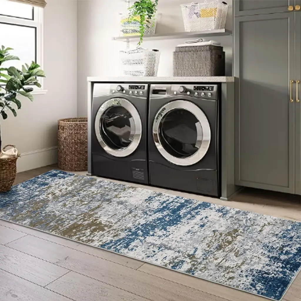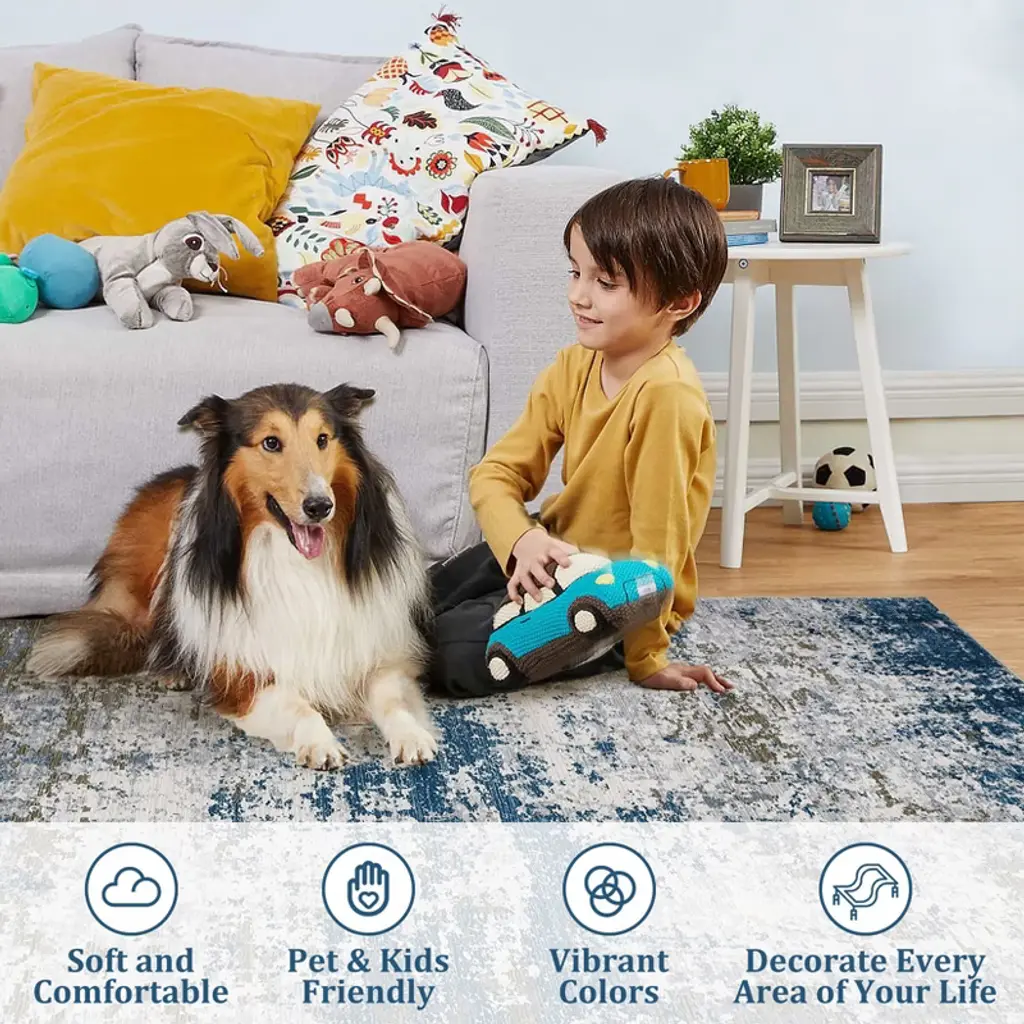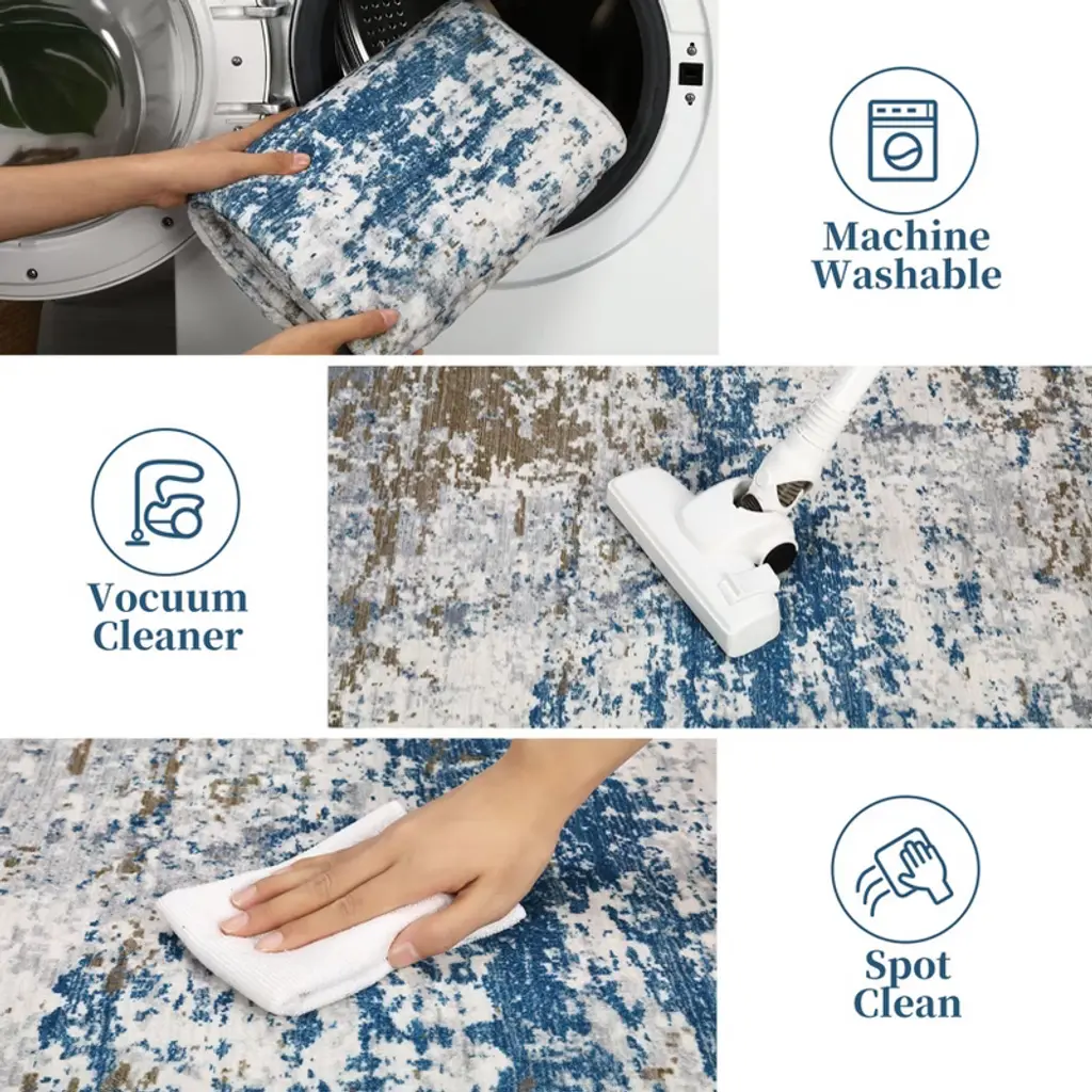 We hope our rugs become a part of your family, witnessing every moment in your home. Details of Washable Area Rugs Machine Washable: Our easy-to-clean washable area rug is the best choice for families. Stain Resistant and non-shedding, pet urine and baby saliva can be wiped away with a rag. Big stains can be thrown in the washing machine to clean. Keep this easily washable rug looking fresh daily with a vacuum cleaner or a swift wipe. Any initial creases in this modern abstract rug will naturally smooth out within a week when placed on the floor and walked upon. Safety and Stability: The area rug for bedroom is made of TPR no-slip rubber backing, which can effectively keep the carpet in a stable position and avoid slipping. These large rugs are perfect for living room, bedroom, dining room. Area Rugs are soft and comfortable,when your kids or pets play with bare feet, it is as soft as clouds, keeping the soles of your feet warm and relaxed. Foldable and Space Saving: Designed with convenience in mind, our rug features a foldable design, allowing you to easily store and transport it. Pet and Kids Friendly: It is crafted using durable materials that can withstand the playful antics of pets and the occasional spills or stains caused by kids. Affordable and Elegant: Whether you' re looking to revamp your home or simply want to enhance the ambiance, this rug offers a cost-effective way to ele-vate your interior design. Easy to Care: Clean up debris from the rug with a broom or vacuum cleaner. Machine wash with cold water on gentle cycle when thorough cleaning is required. Air dry or dry on air-only cycle with out heat.