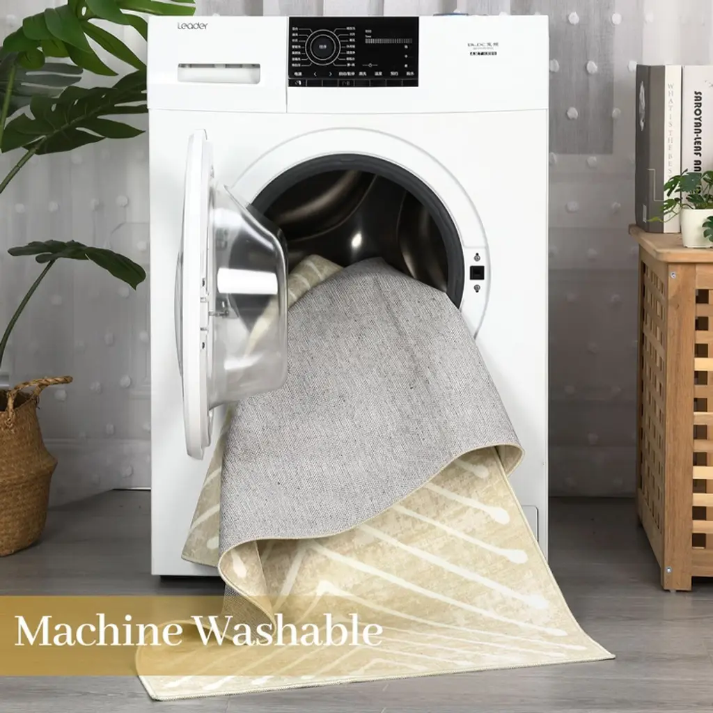Washable Rug Can Help You Deal with Kids, Pets, and Everyday Messes! Specification: -Product Material: 1. Non-Shedding: Our low pile throw rug is made of enhanced synthetic durable fibers, not only ultra-soft but also resists color fading and has a virtually non-shedding low pile. 2. Non-Slip: The rug backing was coated with textured TPR to help the rug stay in place, you don' t need to pay for an extra rug pad. -Features: Machine Washable& Foldable& Non-Shedding& Non Slip& Low Pile& Ultra Soft -Application: Living Room/ Bedroom/ Dining Room/ Runner/ Entryway/ Playroom/ Home office/ Kitchen/ Farmhouse/ Hallway/ Laundry Care Instructions: 1. Regular vacuuming is the most effective way to keep the rug clean. 2. Avoid vacuuming the fringes of your rug, use a broom to clean. 3. Deep clean the rug with warm water ( no bleach or fabric softener) to remove dirt. 4. Machine wash with cold water on gentle cycle( Do not use bleach). Line dry or dry on low heat. Product Note: 1. Folded packed rug may contain temporary creases upon arrival, lay it flat on the floor, and the creases will fade within a few days. 2. Carpet color may vary slightly.