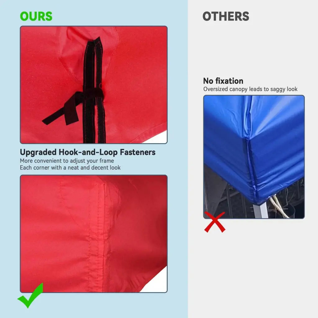 Features:- Universal Fit - Universal 1-Tier Replacement Canopy Top for 10x10 ft one-tier gazebo frames, gives you and your friends a perfect outdoor shade to enjoy this unique leisure time; Classic & subtle color to perfectly blend in versatile scenarios like garden, beach cabanas,, backyard, poolside, front porch, terrace - UV30+ Protection - The canopy top is made of 200 g/sqm polyester with PA coating for water resistance, and UV30+ protection to effectively block out harmful sunray and avoid heat buildup under the canopy on hot days - Tool-free Installation - Easy to install by placing corners of canopy over the corners of gazebo frame; Comes with hook and loop fasteners for conveniently fixing the canopy onto the frames- Reinforced Corners & Vent Hole - Reinforced corners for better protection, makes it durable to use for a long lifespan; 4 grommets on each side for ventilation and water drainage - Measuring Tips to Help Determine whether Your Frame Fits Our Canopy Top: - Firstly, measure the hemline of the canopy frame- Secondly, measure the hypotenuse of the canopy frame- Please make sure any of your measurements should not exceed the compatible frame size range, otherwise it will not fit your frame.Specifications:- Hemline Dimension(LxW): 120 1/16" x 120 1/16" (305 x 305 cm)- Hypotenuse: 88 9/16" (225 cm)- Middle Height: 65 3/8" (166 cm)- Material: 200 g/sqm UV30+ Polyester- Net Weight: 4.9 Lbs (2.22 kg)Package Contents:- 1x Gazebo Canopy Replacement- 1x Manual- Package Content:Notice: - Please note that canopy frame is Not included.- The fabric colors represented on the website may differ slightly from the actual product, and different monitors may cause colors to vary slightly.