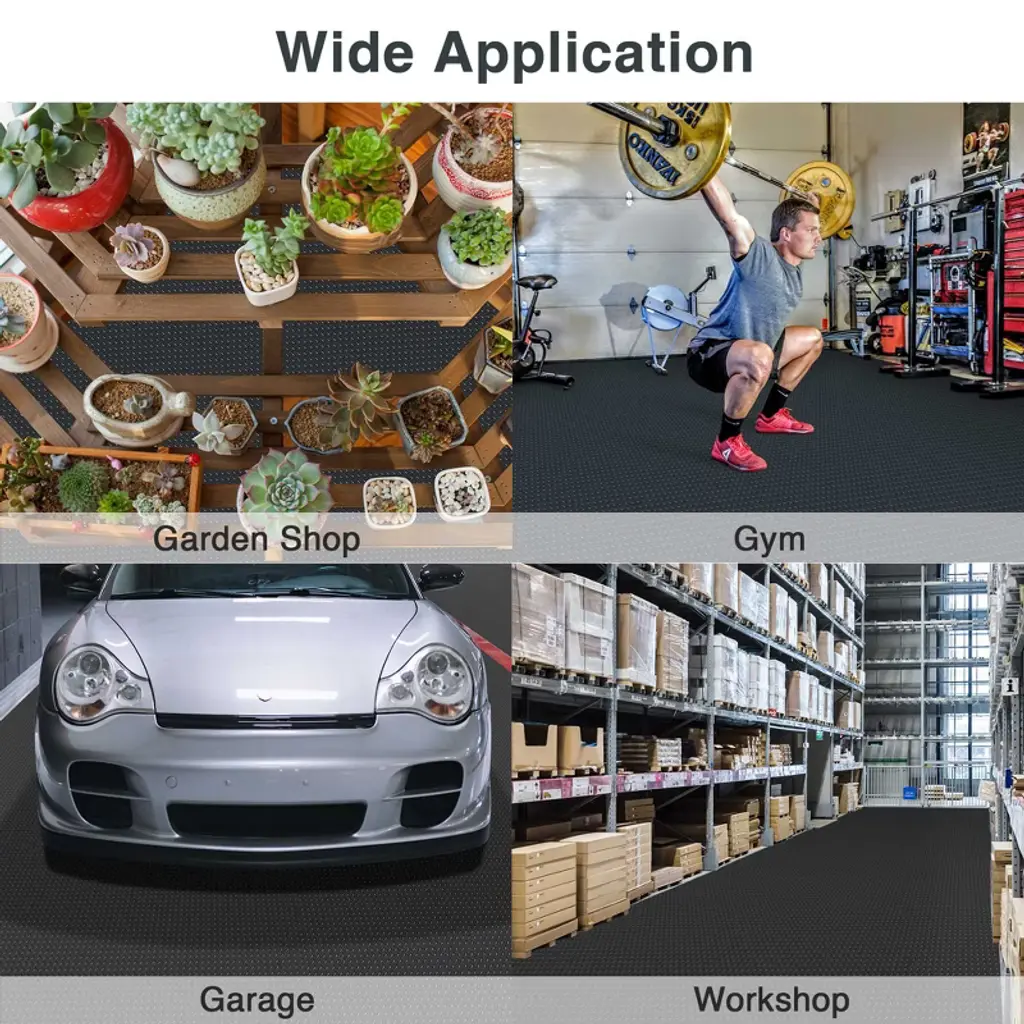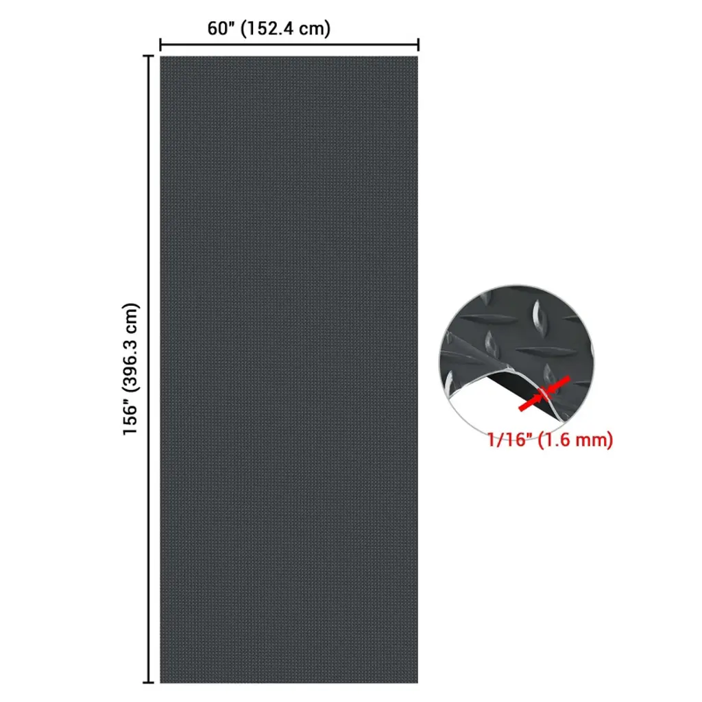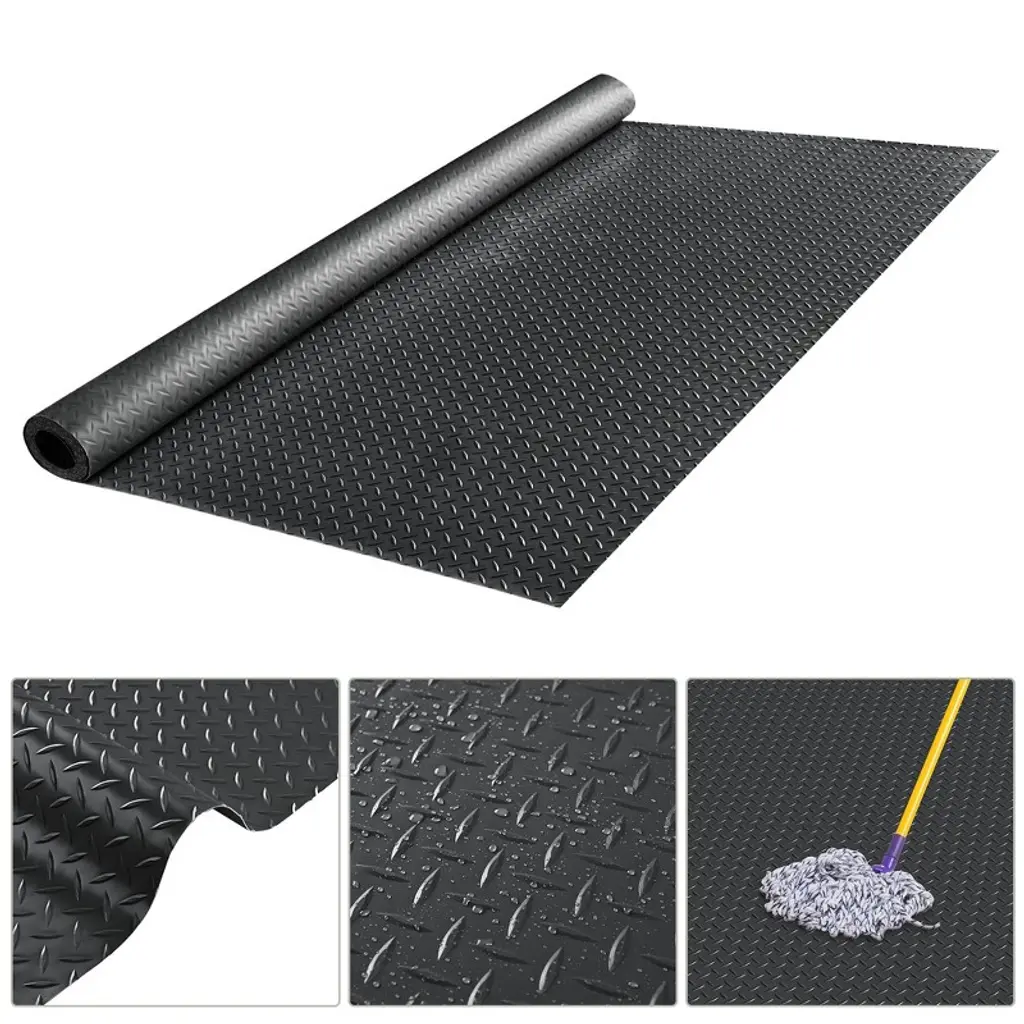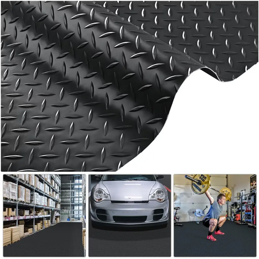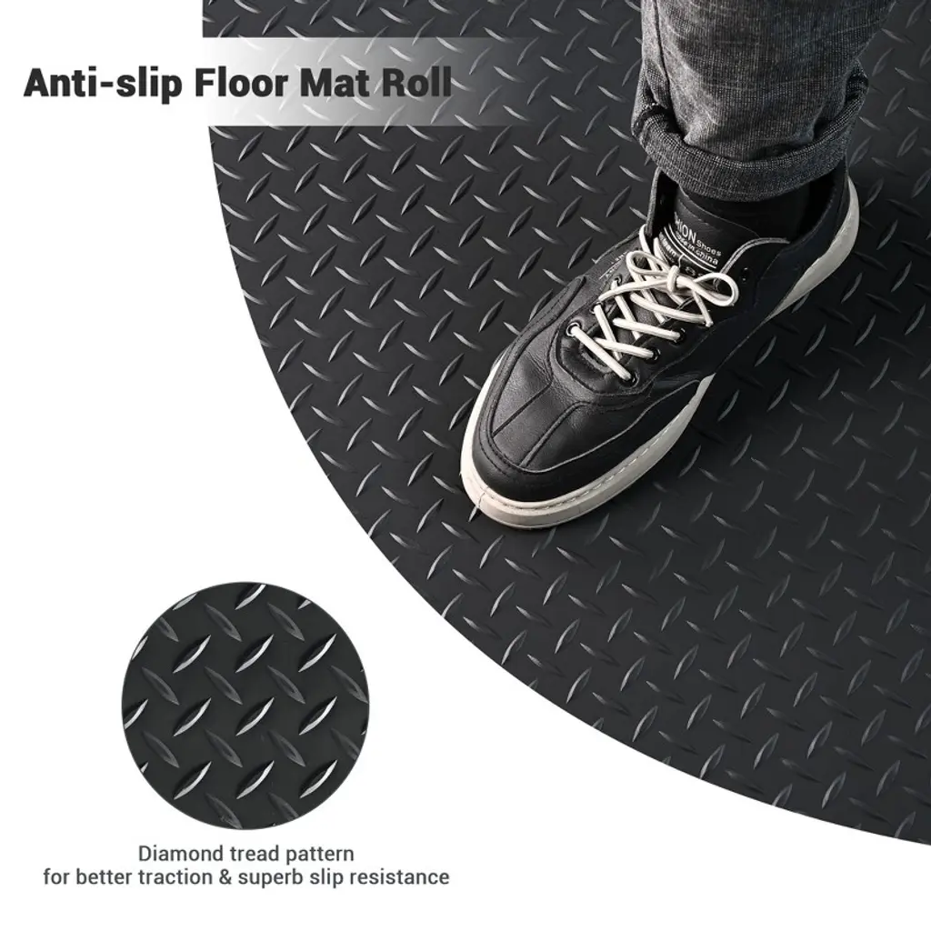 Features:- Anti-slip Floor Mat Roll - 2 Pieces of 156"x60" Floor Mat Rolls feature diamond tread pattern for better traction & superb slip resistance, cover concrete or wood sub-floors to prevent deterioration and hide cracks, ideal for residential garage, parking lot, warehouse, food factory, hospital, stadium, hallway- Safe & Durable Material - Made of PVC, floor mat contains no harmful substances for safe use and produces no odor; Durable and wear resistant, and can support long-time standing and withstand vehicle-grade loads like trailers, trucks, or SUVs without deforming- Easy to Cut & Install - Available in customizable shape by easy cutting with sharp knife or scissor according to your garage size; Easy to install by just rolling out the floor mat on the surface for a smooth and even display- Easy to Clean - Easy to clean by using vacuum cleaner, broomstick, dry mop to remove crumbs, dust or debris, which saves you time and energy; No dismantling required for effortless maintenance, only step on and clean- Water Resistant - Water resistant floor mat provides excellent protection from dirty water penetration, which makes stains easy to remove and no pollution to the floor creating a dry and clear environmentSpecifications:- Each Mat Size(LxW): 156" x 60" (396.3 x 152.4 cm)- Overall Thickness with Pattern: 1/16" (1.6 mm)- Material: PVC- Total Net Weight: 42.8 Lbs (19.4 kg)Package Contents:- 2x Floor Mat RollsNotice: - Patterns of two mats may not match exactly along the seam when they are laid side by side.