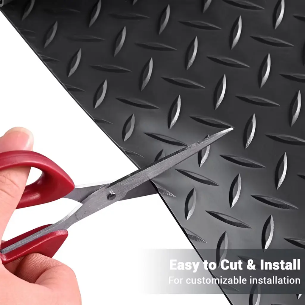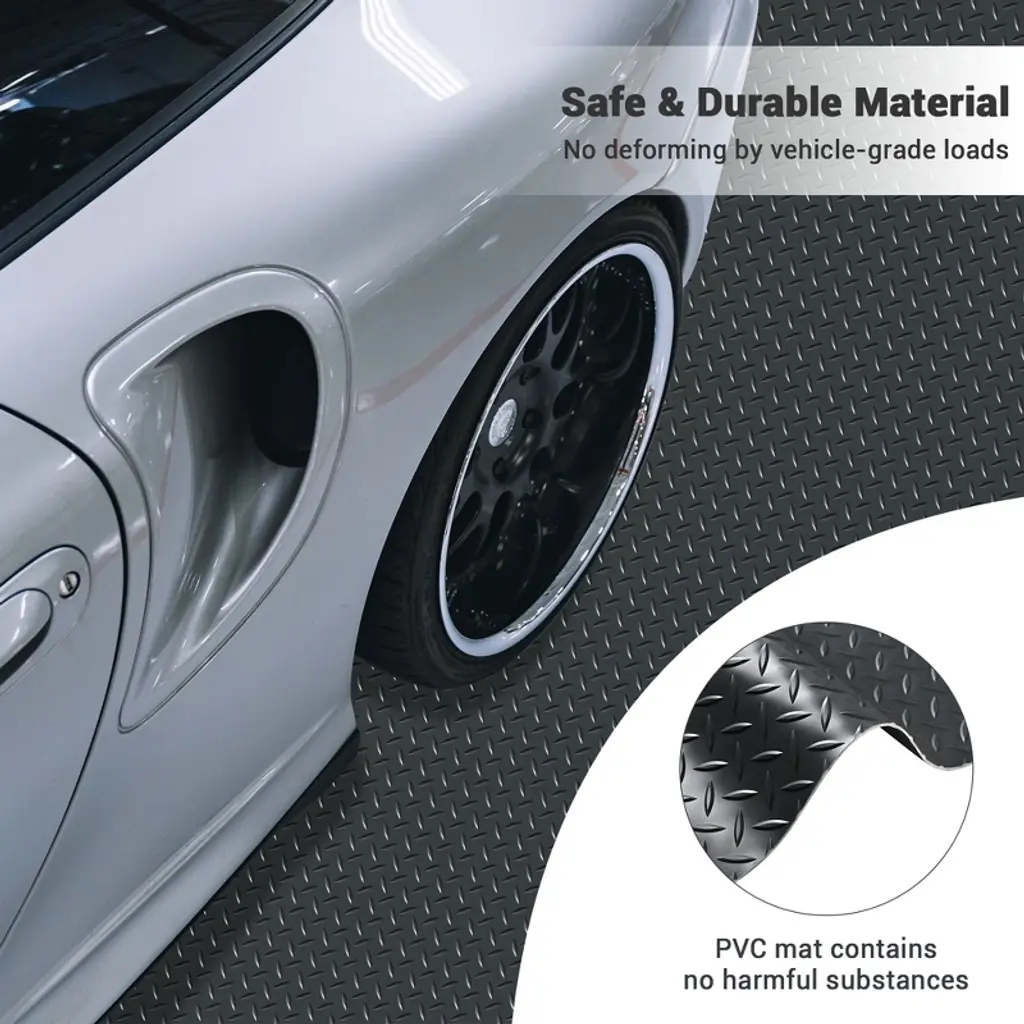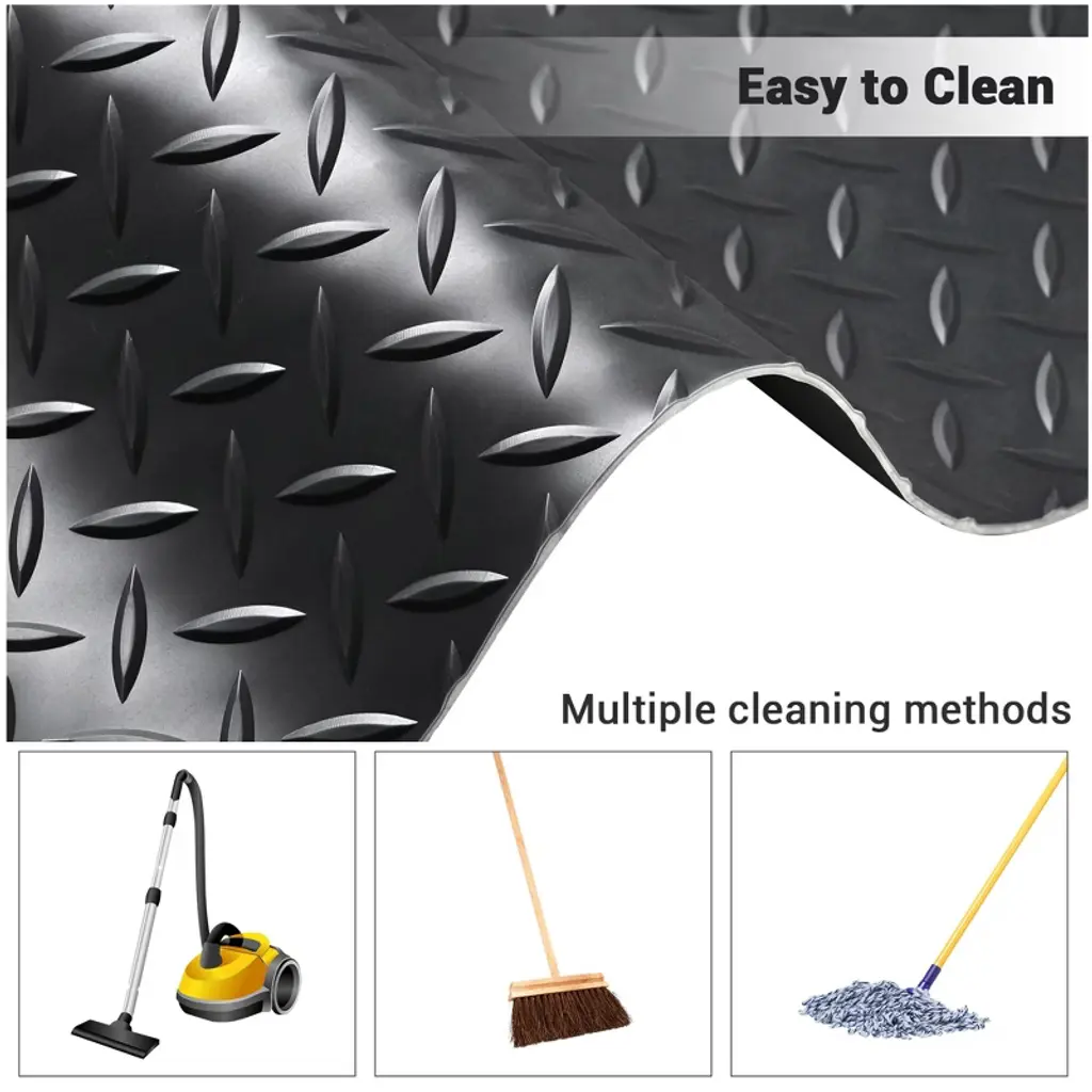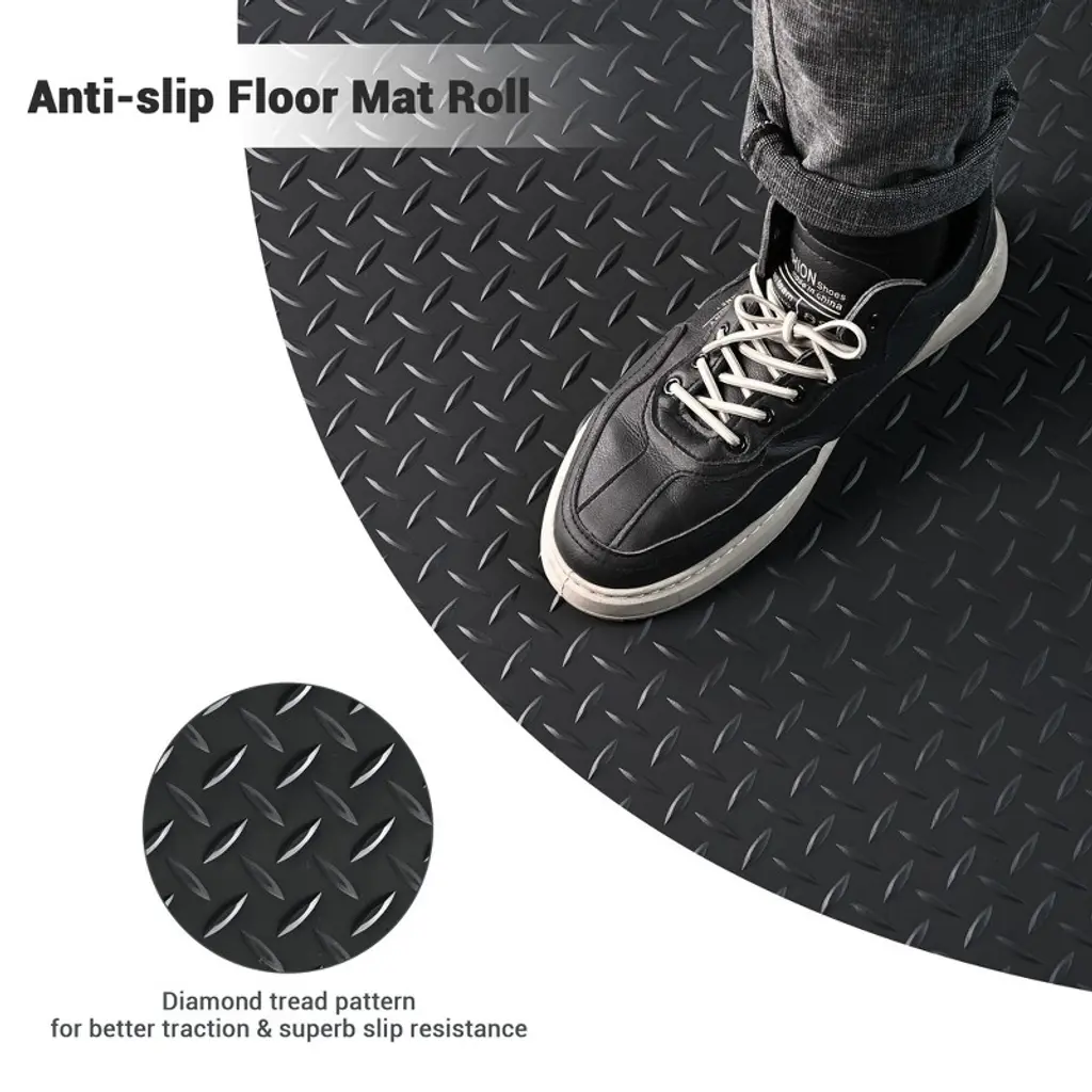 Features:- Anti-slip Floor Mat Roll - 20x4.6 ft Floor Mat Roll features diamond tread pattern for better traction & superb slip resistance, covers concrete or wood sub-floors to prevent deterioration and hide cracks, ideal for residential garage, parking lot, warehouse, food factory, hospital, stadium, hallway- Safe & Durable Material - Made of PVC, durable and wear resistant, and can support long-time standing and withstand vehicle-grade loads like trailers, trucks, or SUVs without deforming; Can be a water containment mat in winter to protect a garage floor from salting- Easy to Cut & Install - Available in customizable shape by easy cutting with sharp knife or scissor according to your garage size; Easy to install by just rolling out the floor mat on the surface for a smooth and even display- Easy to Clean - Easy to clean by using vacuum cleaner, broomstick, dry mop to remove crumbs, dust or debris, which saves you time and energy; No dismantling required for effortless maintenance, only step on and clean- Water Resistant - Water resistant floor mat provides excellent protection from dirty water penetration, which makes stains easy to remove and no pollution to the floor creating a dry and clear environmentSpecifications:- Overall Size(LxW): 240 3/16" x 55 1/8" (610 x 140 cm)- Overall Thickness with Pattern: 1/8" (2.5 mm)- Material: PVC- Net Weight: 56.2 Lbs (25.5 kg)Package Contents:- 1x Floor Mat Roll