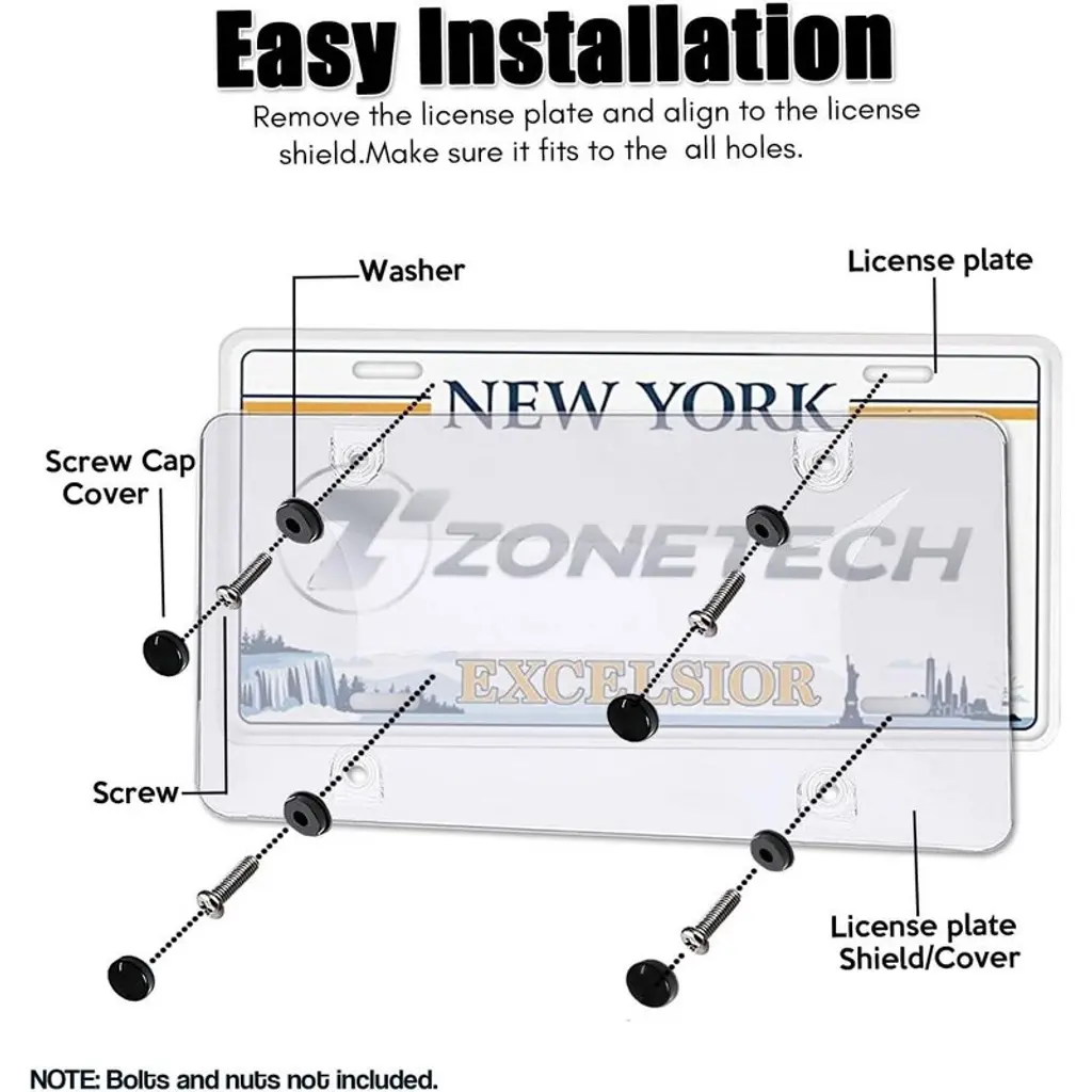 Zone Tech Clear License Plate Shields - Novelty/License Plate Clear Bubble Shields Keep your license plate Clean and Protected with the Zone Tech Clear License Plate Shields. The Clear, UV resistant acrylic extends away from the plate, keeping plates looking clean and New. The novelty plate shield provides Protection from the elements for your license/novelty plate. The Zone Tech license plate shields are Lightweight and Crystal Clear. So clear you can't even tell the license plate has a cover. The clear cover is virtually Indestructible. It will not break or shatter. This offers a Top of its Class in license plate protection. The Zone Tech license plate shields is made from Premium Quality acrylic with a UV resistant stabilizer to prevent discoloration and to ensure maximum Strength and Durability for Long Lasting usage. The license plate cover has UV Protection helps prevent yellowing and cracking. The Zone Tech license plate shields is designed to fit all Standard 6x12 inch novelty/license plates and fits most standard size U.S. license plates. The Zone Tech license plate shields is User Friendly and is Easy To Install. See back of package for installation instructions.. It installs in minutes with no special tools required. Zone Tech Brand is known worldwide with superior product quality and service!