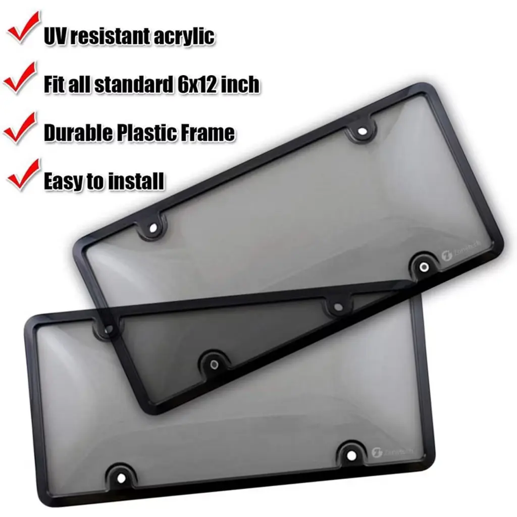 The Zone Tech license plate shields are lightweight and Smokey clear. This offers a top of its class in license plate protection. Especially designed to keep license plates looking brand new. The Zone Tech license plate shields is made from premium quality acrylic with a UV resistant stabilizer to prevent discoloration and to ensure maximum strength and durability for long lasting usage. The Zone Tech license plate shields is designed to fit all standard 6x12 inch novelty/license plates. It fits most standard size U.S. license plates. The Zone Tech license plate shields is user friendly and is easy to install. See back of package for installation instructions. It installs in minutes with no special tools required. Easy to Clean. Use warm soapy water with soft cloth or sponge. No abrasive or cleansing powders. Zone Tech Brand is known worldwide with superior product quality and service!