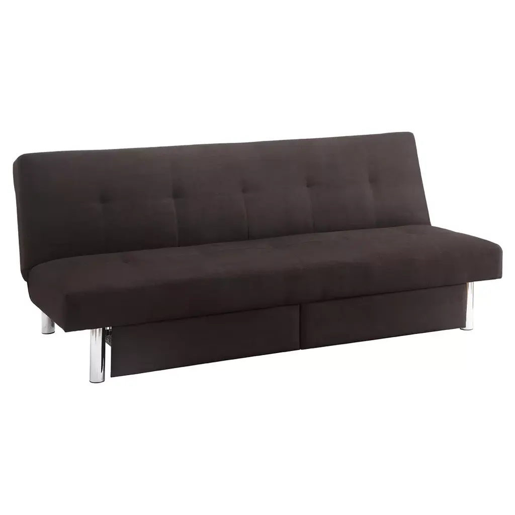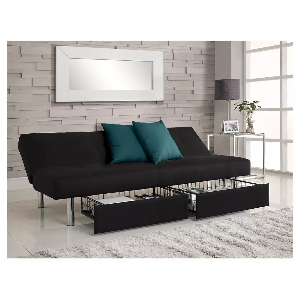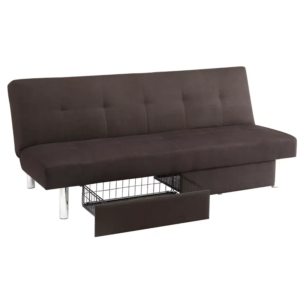 Make the most of your living room space with the Sola Futon with Storage. Its microfiber upholstery creates a stylish and sleek look. The Sola offers functionality, support and durability. The storage compartments underneath pull out to reveal storage for books, blankets, pillows, and more. The multi position back converts the futon from a lounger to sleeper, perfect for overnight guests. Enhance your living space with the Sola Futon with Storage!