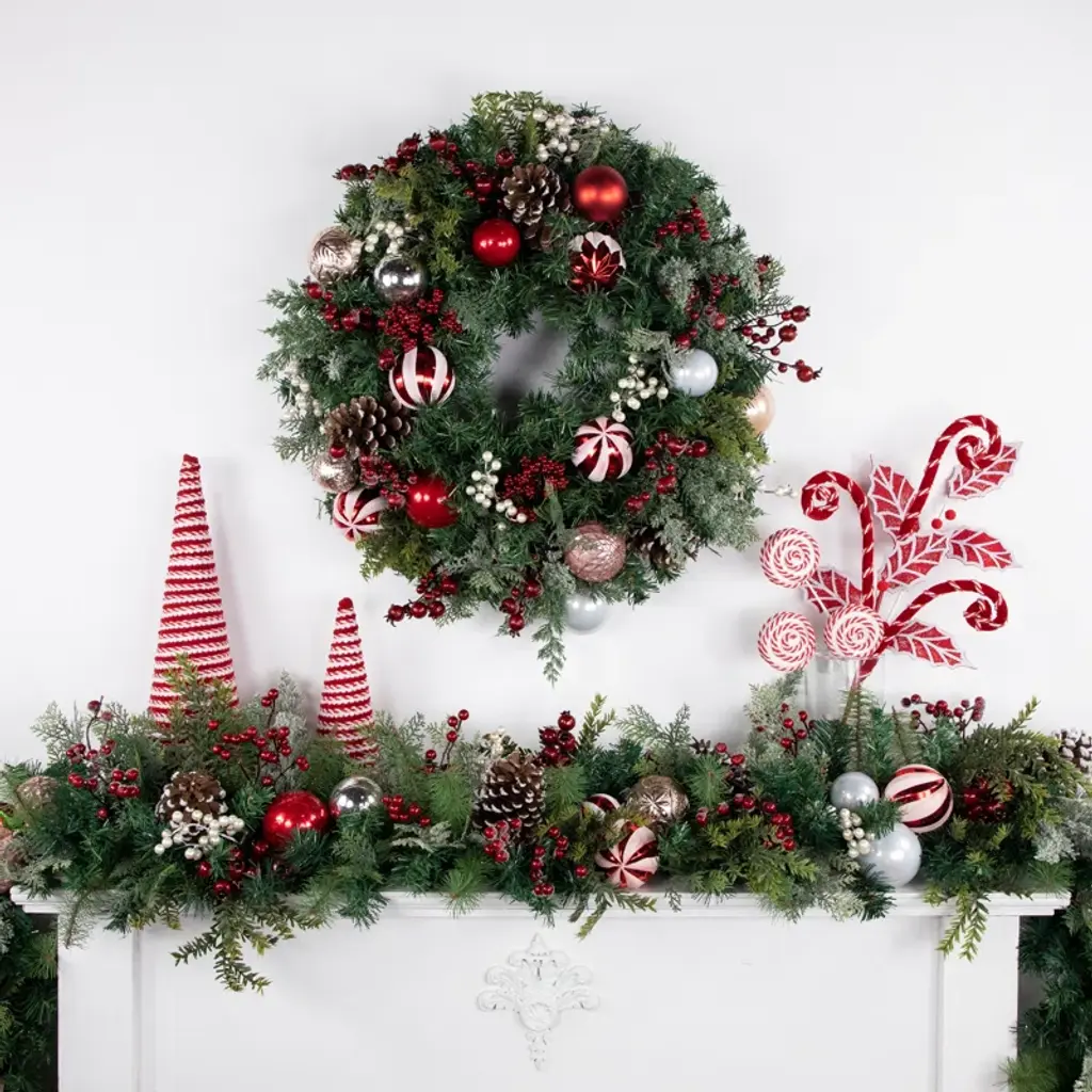 Add some green to your mantelpiece with this gorgeous mix foliage decorated garland. Its pine branches come decorated with pinecones red and white ornaments and berries. This festive garland includes a bendable wire center and metal loops on each making decorating for the holidays a breeze. Product Features: Unlit. Accented with pinecones various ornaments and berries. A bendable wire center allows you to shape the garland any way you desire. Recommended for indoor use only. Dimensions: 6' long. Material(s): plastic/wire/pinecone