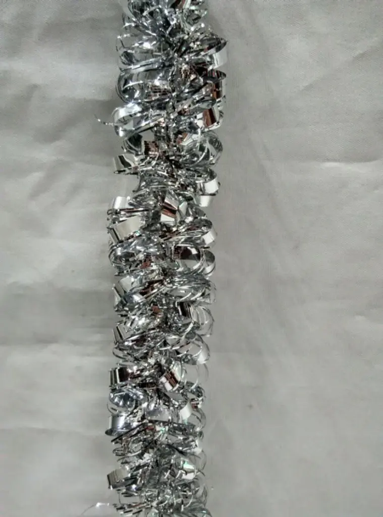 100'' Silver Metallic Tinsel GarlandThis highly festive garland is the perfect way to add some much needed elegance and flare to your holiday dor. Stretching an exceptionally long 100'', this garland can be used in commercial areas such as shopping malls and parks as well as your home or office. It is 3" wide and comprised of 2-ply metallic silver colored tinsel. Works exceptionally well in lit areas, as the tinsel will reflect the light.