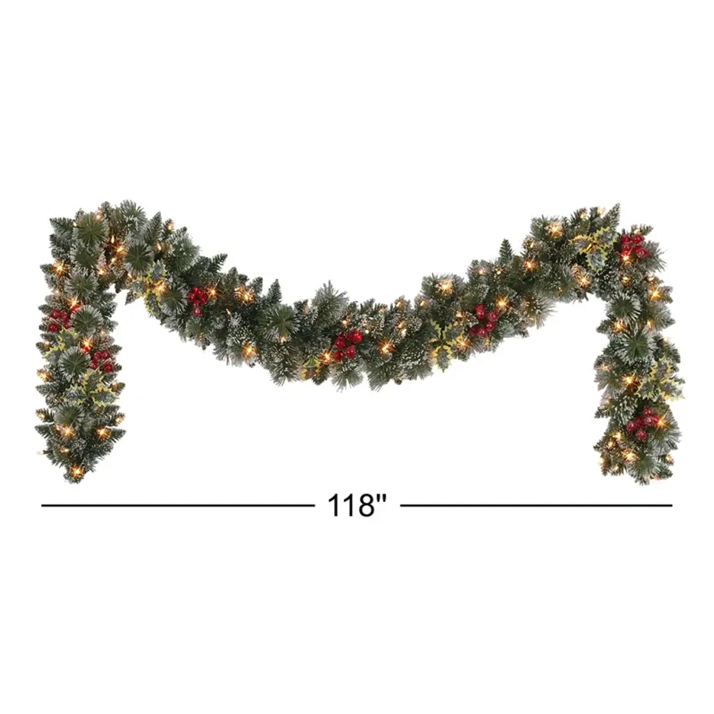 Illuminate your indoor or covered outdoor space with this enchanting pre-lit garland. Featuring 100 cool-tone lights that emit a constant glow, it brings a touch of festive magic to any setting. Crafted from polyvinyl chloride (PVC), this garland is easy to maintain – simply wipe clean with a dry cloth when needed. Its plug-in power source ensures hassle-free lighting, while the absence of a timer allows you to enjoy the twinkling lights as long as you'd like. So, go ahead and add some sparkle to your home this season!