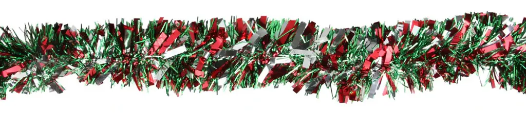 Nothing says Christmas like a good old fashioned tinsel garland! This plush garland will add color and dimension to your holiday decor. Perfect to decorate trees mantles and railings. Product Features: Red green and silver tinsel garland Shiny design Unlit Flame retardant Tarnish resistant 8 ply garland Recommended for indoor use or covered outdoor use Dimensions: 4" wide x 12'' long Material(s): tinsel