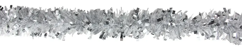 Nothing says Christmas like good old fashioned tinsel garland Perfect for decorating Christmas trees doorways windows or staircases Color: shiny silver with a mix of snow-like covered tinsel and holographic silver snowflakes Unlit Flame retardant Tarnish resistant 8 ply garland Dimensions: 12'' long x 2.75" wide Material(s): tinsel