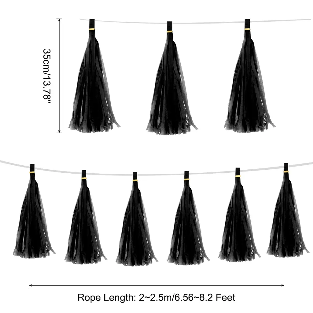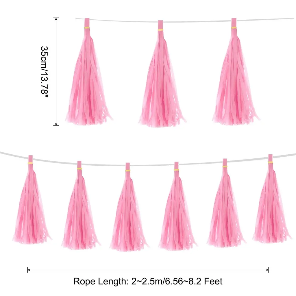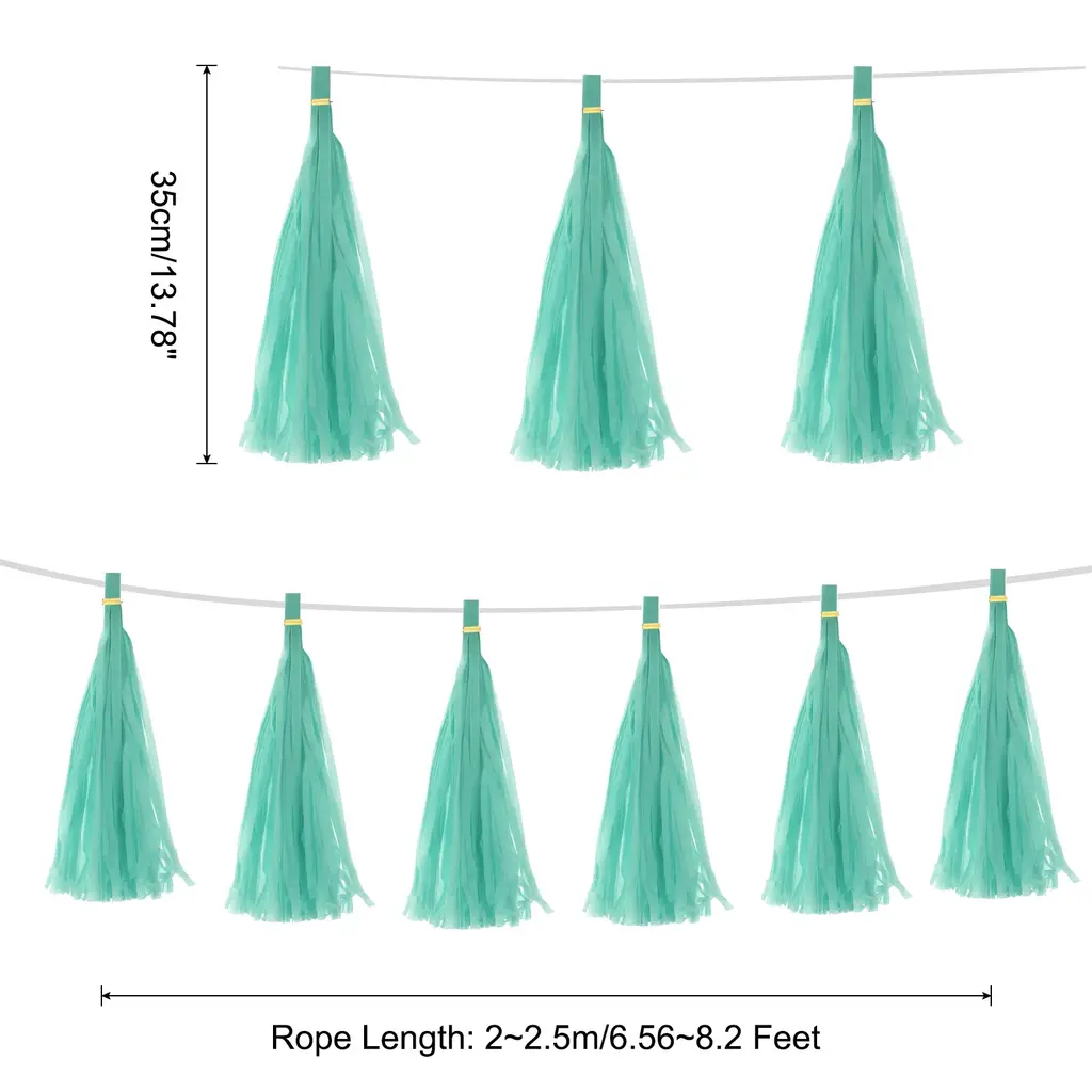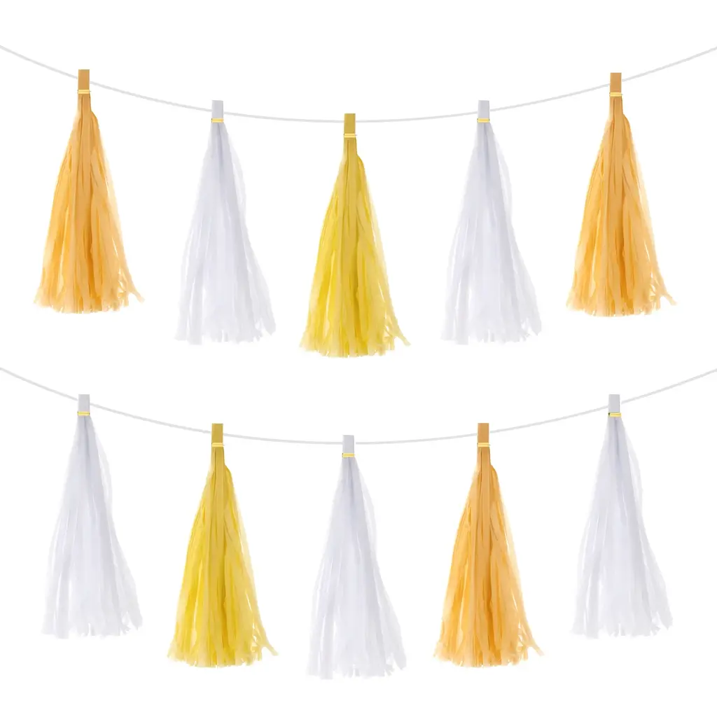 What is this?This tassel garland banner is mainly used for party decoration, you can hang or stick these decorative ribbons on the wall, window, door or shelf to add a different atmosphere to your party, mainly used for birthdays, weddings, Christmas, Easter, masquerade, graduation party and other partiesWhat will I get?Material: PaperColor: Light Yellow,Dark Yellow,WhiteRope Length: 2~2.5m/6.56~8.2 FeetTassel Length:35cm / 13.78 inchPackage content:20 Pcs x Tissue Paper TasselsIs there any advantage of the product?1. This tassel garland banner is made of paper, not easy to break and can be reused. When the party is over, just take it off and fold it back.2. This tissue paper has tassel design, hanging at the party scene, can add a different sense of atmosphere and add a variety of decorations to your party.3. These party tassels are very easy to use, the rope is strong, even if you hang it outdoors, it will not fall off easily, you can hang it on any decorative place you wantHow to use it?String the tassel paper on rope,and hang the ends of the string where you want to decorationWhat should I notice?Tips: please confirm the length before you buy.