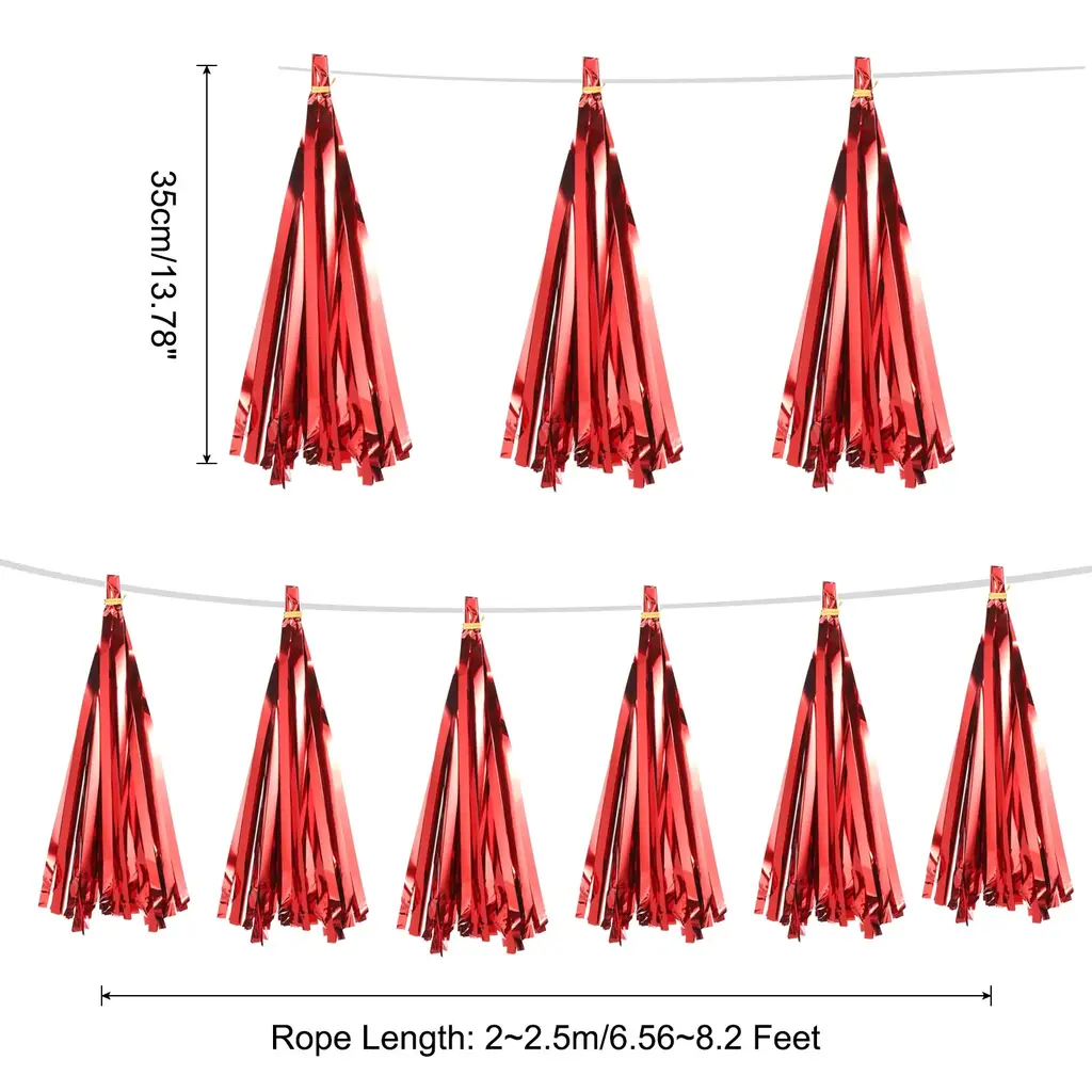 What is this?This tassel garland banner is mainly used for party decoration, you can hang or stick these decorative ribbons on the wall, window, door or shelf to add a different atmosphere to your party, mainly used for birthdays, weddings, Christmas, Easter, masquerade, graduation party and other partiesWhat will I get?Material: PaperColor: GoldRope Length: 2~2.5m/6.56~8.2 FeetTassel Length:35cm / 13.78 inchPackage content:20 Pcs x Tissue Paper TasselsIs there any advantage of the product?1. This tassel garland banner is made of paper, not easy to break and can be reused. When the party is over, just take it off and fold it back.2. This tissue paper has tassel design, hanging at the party scene, can add a different sense of atmosphere and add a variety of decorations to your party.3. These party tassels are very easy to use, the rope is strong, even if you hang it outdoors, it will not fall off easily, you can hang it on any decorative place you wantHow to use it?String the tassel paper on rope,and hang the ends of the string where you want to decorationWhat should I notice?Tips: please confirm the length before you buy.