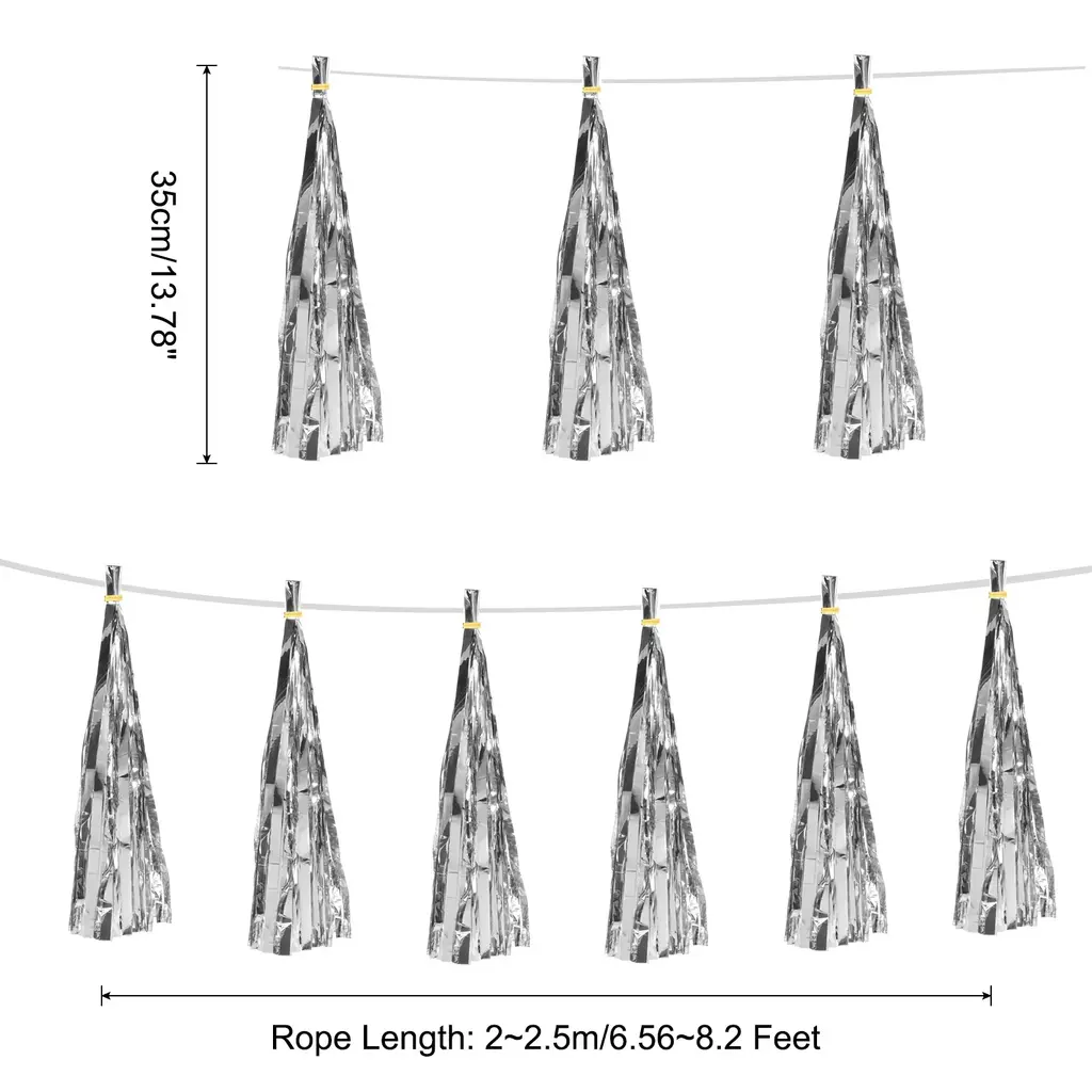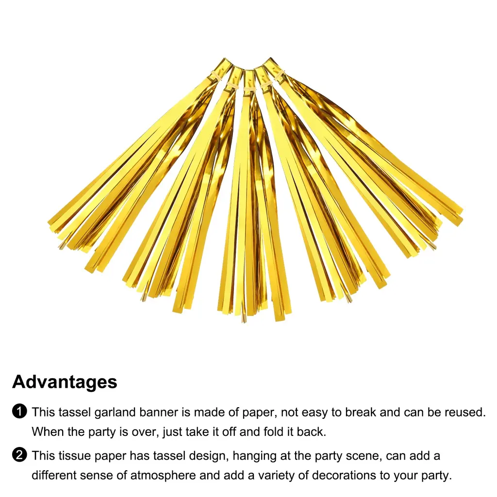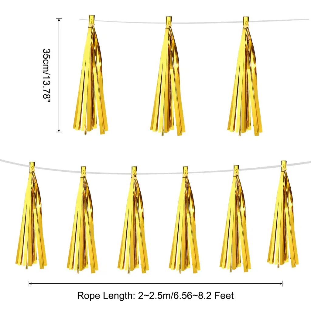 What is this?This tassel garland banner is mainly used for party decoration, you can hang or stick these decorative ribbons on the wall, window, door or shelf to add a different atmosphere to your party, mainly used for birthdays, weddings, Christmas, Easter, masquerade, graduation party and other partiesWhat will I get?Material: PaperColor: GoldRope Length: 2~2.5m/6.56~8.2 FeetTassel Length:35cm / 13.78 inchPackage content:20 Pcs x Tissue Paper TasselsIs there any advantage of the product?1. This tassel garland banner is made of paper, not easy to break and can be reused. When the party is over, just take it off and fold it back.2. This tissue paper has tassel design, hanging at the party scene, can add a different sense of atmosphere and add a variety of decorations to your party.3. These party tassels are very easy to use, the rope is strong, even if you hang it outdoors, it will not fall off easily, you can hang it on any decorative place you wantHow to use it?String the tassel paper on rope,and hang the ends of the string where you want to decorationWhat should I notice?Tips: please confirm the length before you buy.