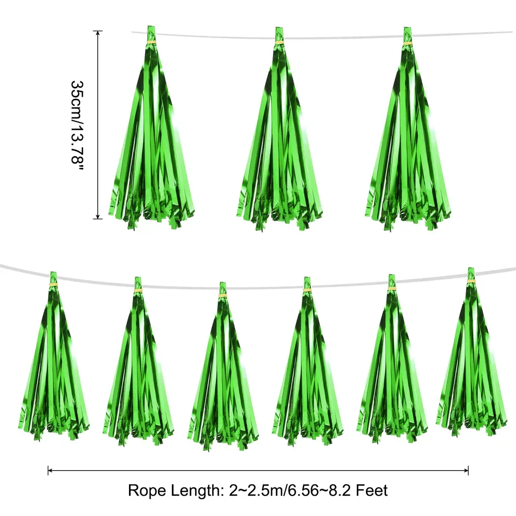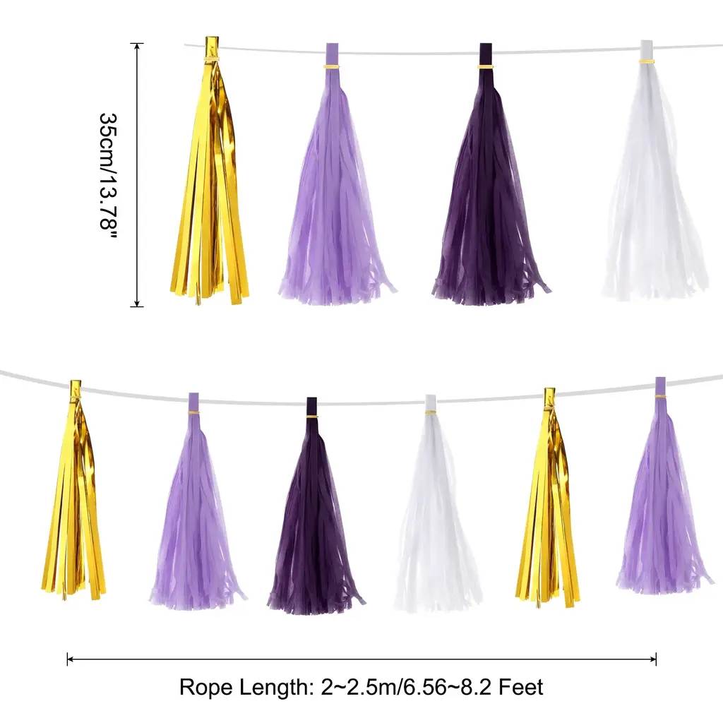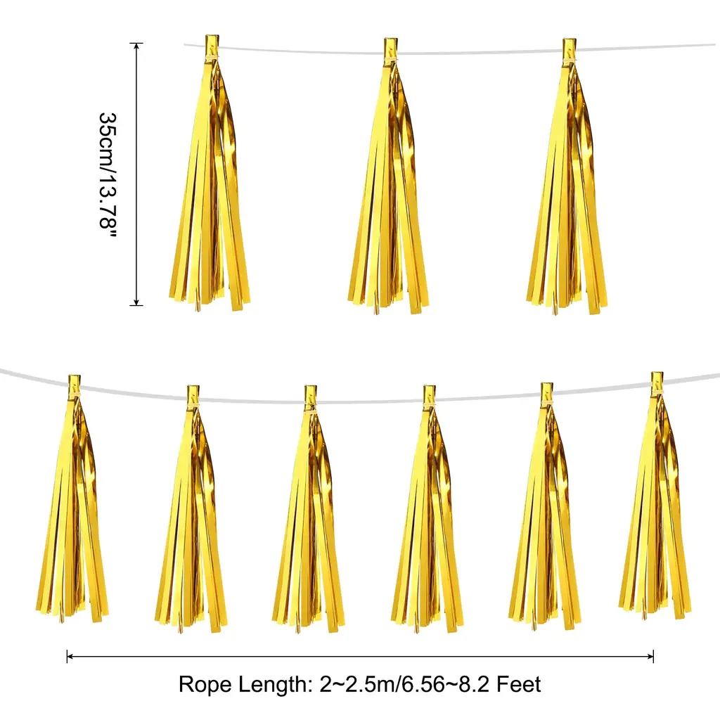 What is this?This tassel garland banner is mainly used for party decoration, you can hang or stick these decorative ribbons on the wall, window, door or shelf to add a different atmosphere to your party, mainly used for birthdays, weddings, Christmas, Easter, masquerade, graduation party and other partiesWhat will I get?Material: PaperColor: GoldRope Length: 2~2.5m/6.56~8.2 FeetTassel Length:35cm / 13.78 inchPackage content:20 Pcs x Tissue Paper TasselsIs there any advantage of the product?1. This tassel garland banner is made of paper, not easy to break and can be reused. When the party is over, just take it off and fold it back.2. This tissue paper has tassel design, hanging at the party scene, can add a different sense of atmosphere and add a variety of decorations to your party.3. These party tassels are very easy to use, the rope is strong, even if you hang it outdoors, it will not fall off easily, you can hang it on any decorative place you wantHow to use it?String the tassel paper on rope,and hang the ends of the string where you want to decorationWhat should I notice?Tips: please confirm the length before you buy.