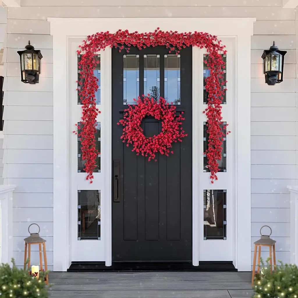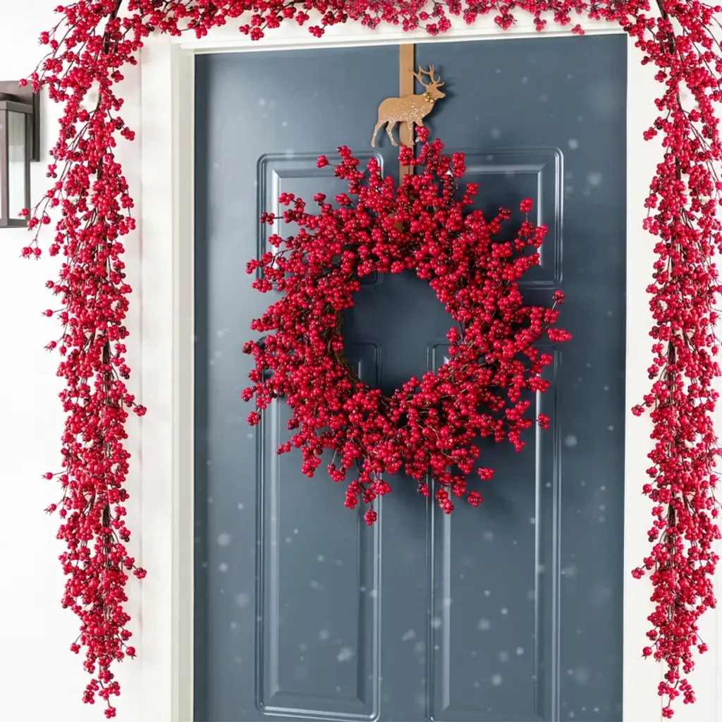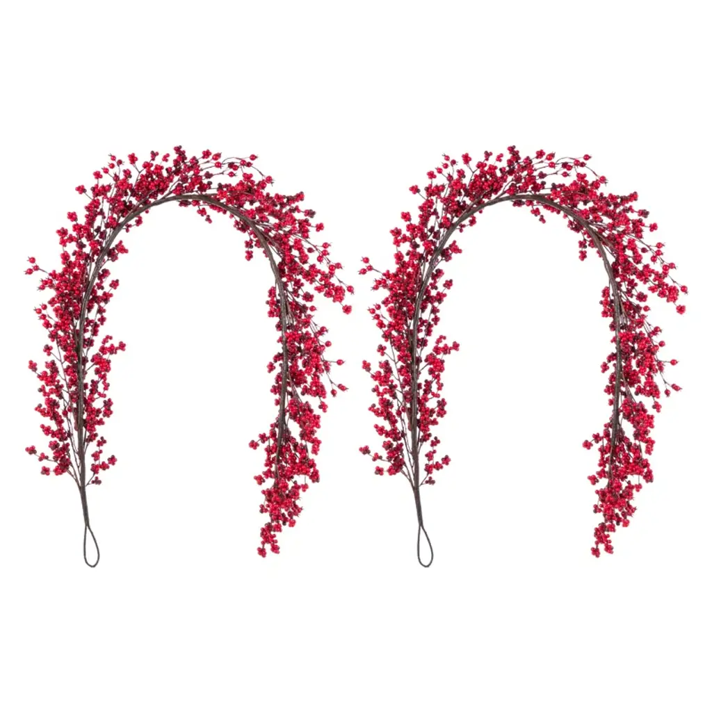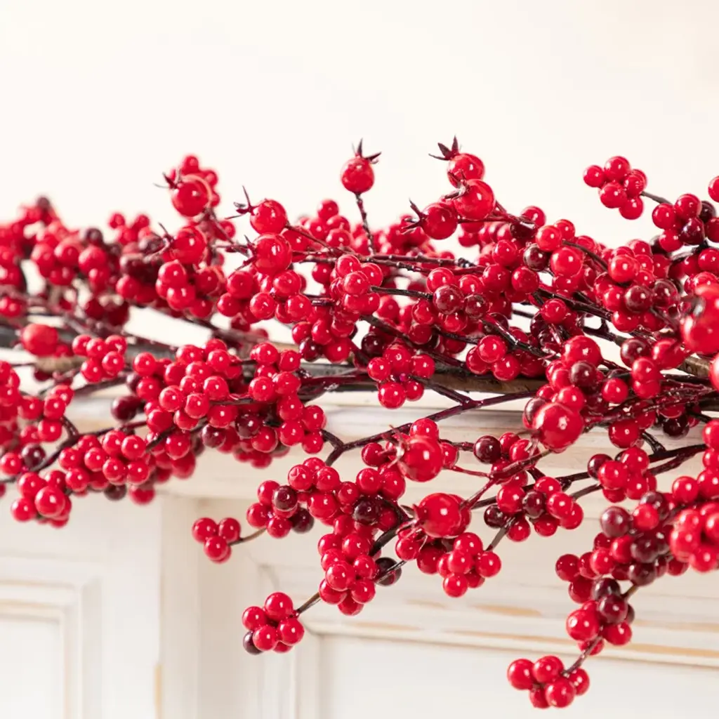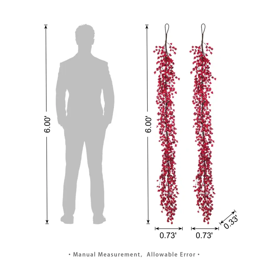 The set of 2 6ft Christmas Red Berries Garland features realistic red berries, perfect for draping over mantels, wrapping banisters, or enhancing any holiday display with vibrant seasonal color.